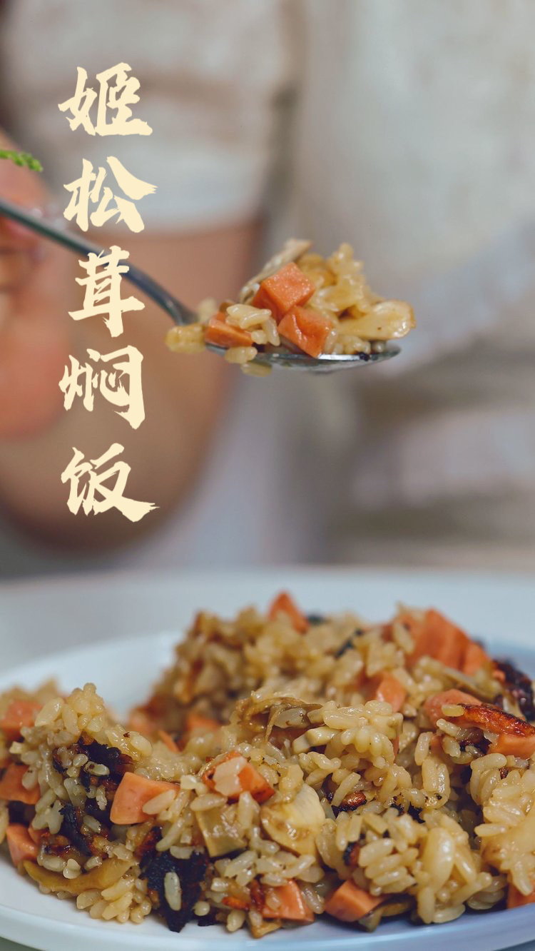 6.没有听到锅内咕咚咕咚的水声了,就可以揭开盖把姬松茸片放在焖饭上面啦。