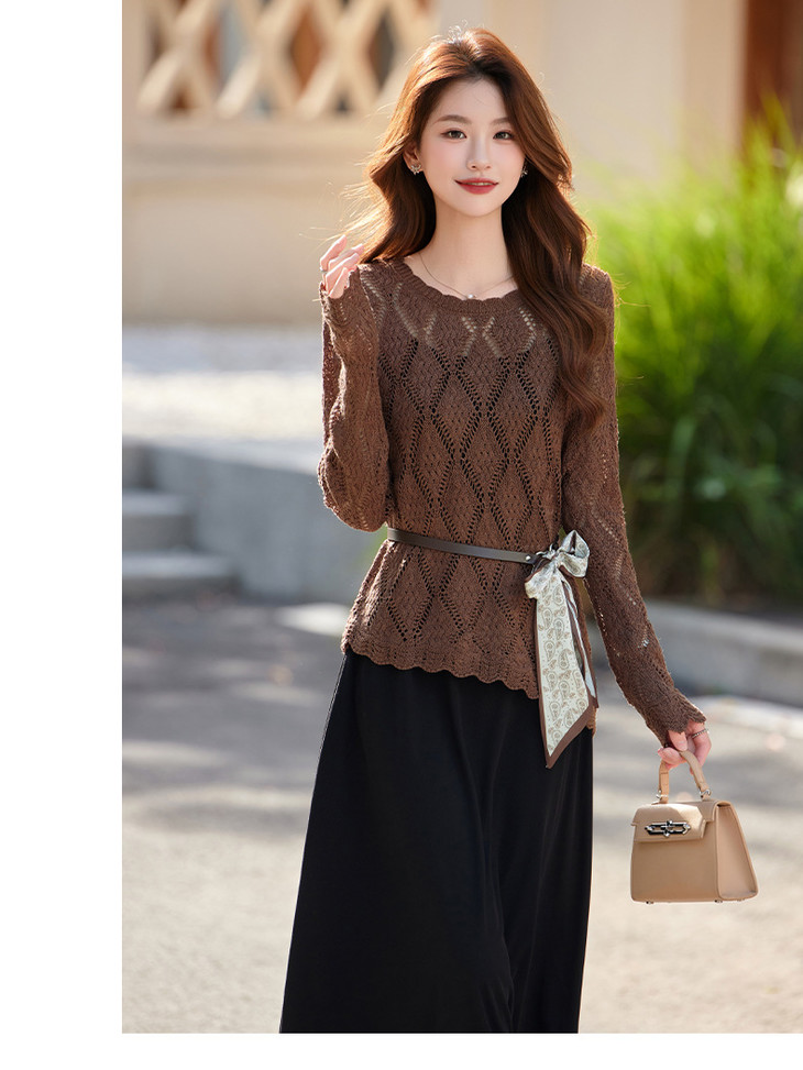 优雅风镂空针织罩衫套装裙,系带收腰吊带裙两件套HR-ABS25128