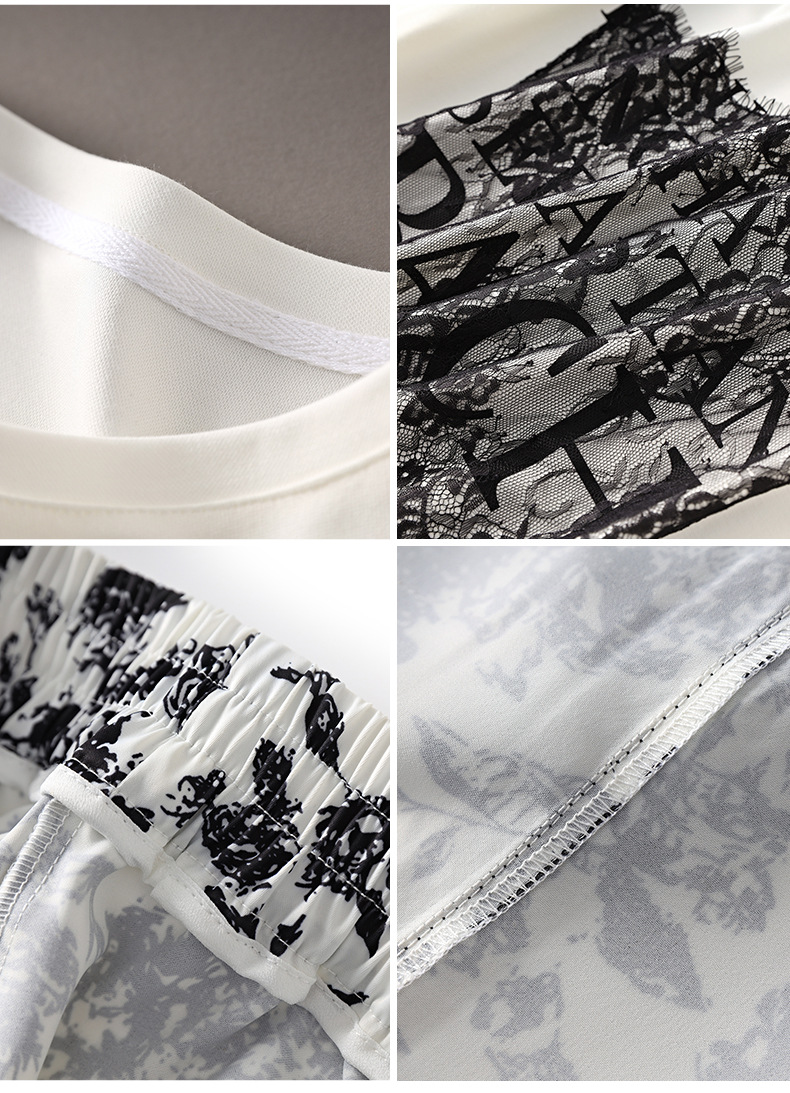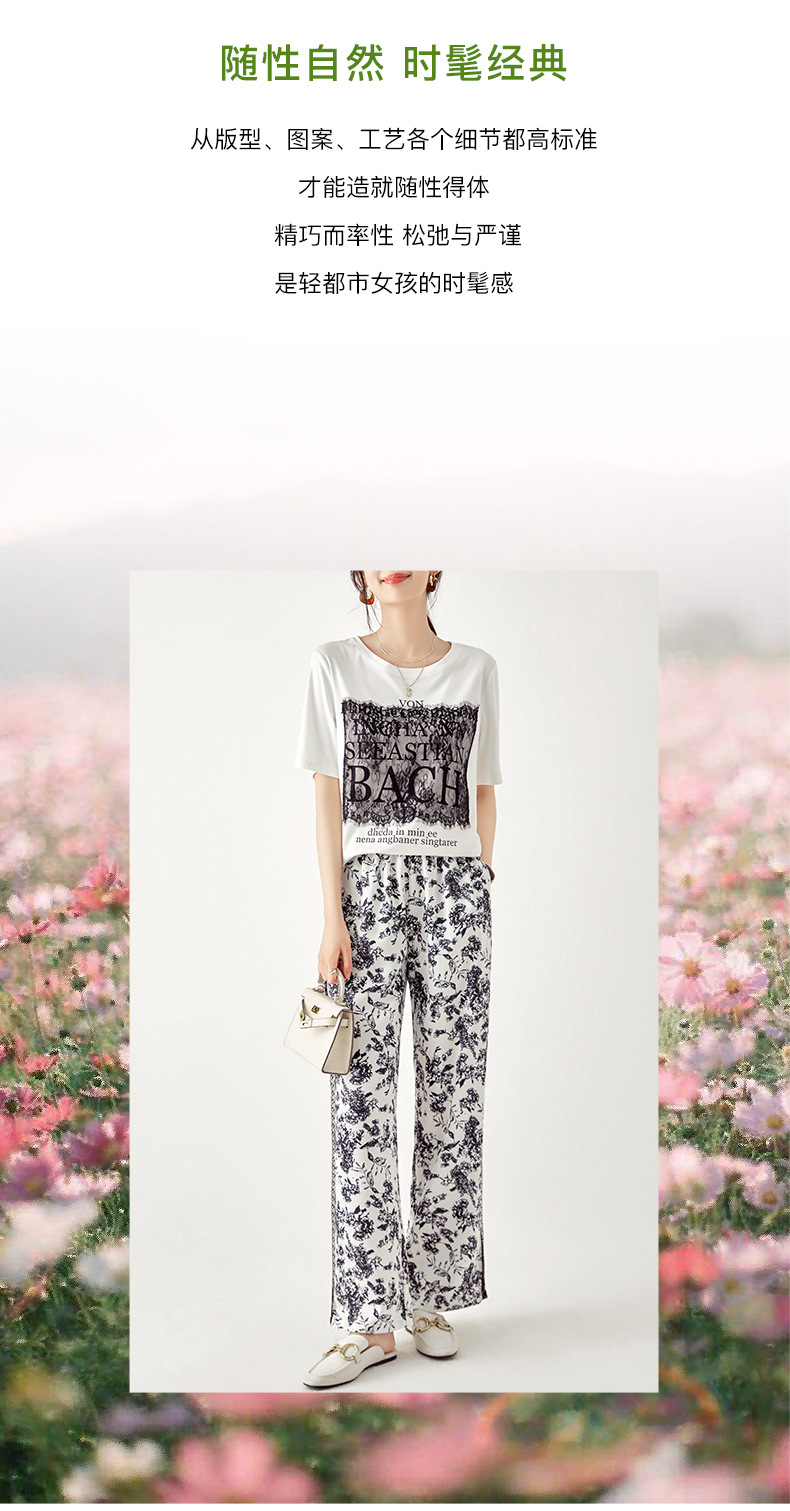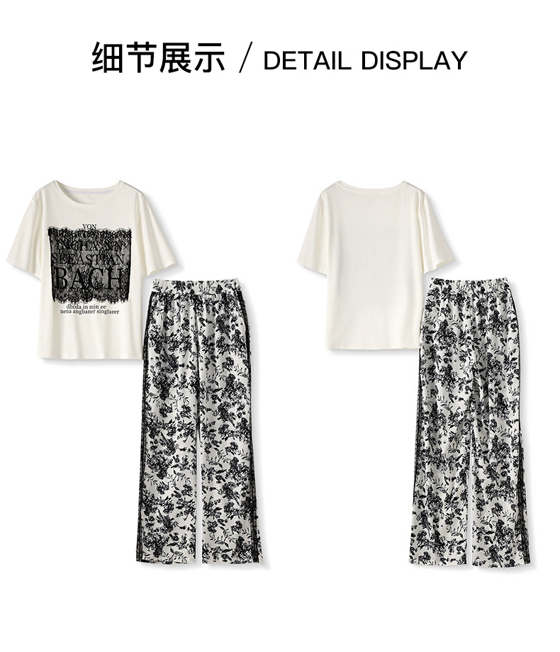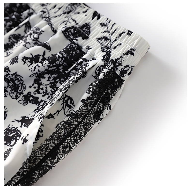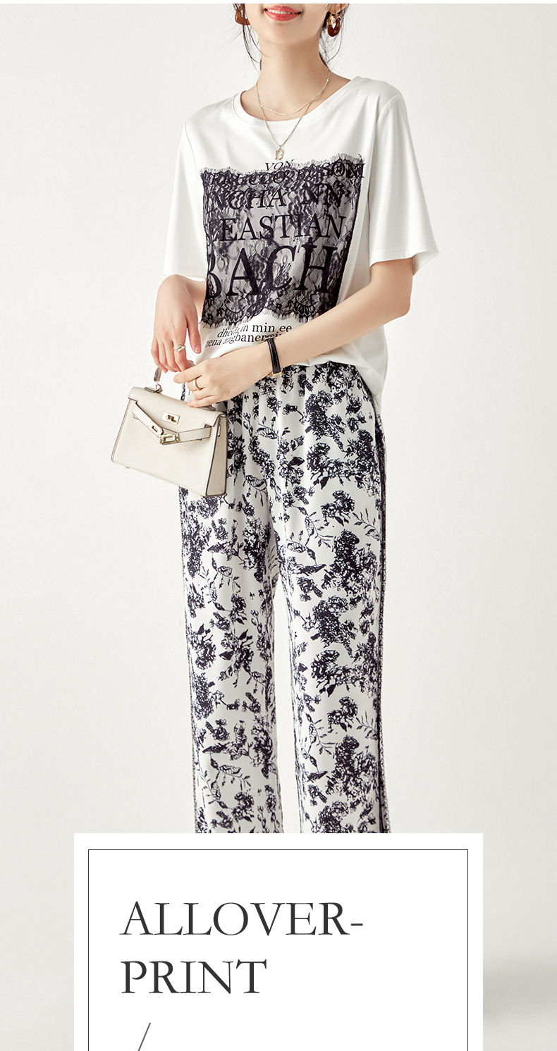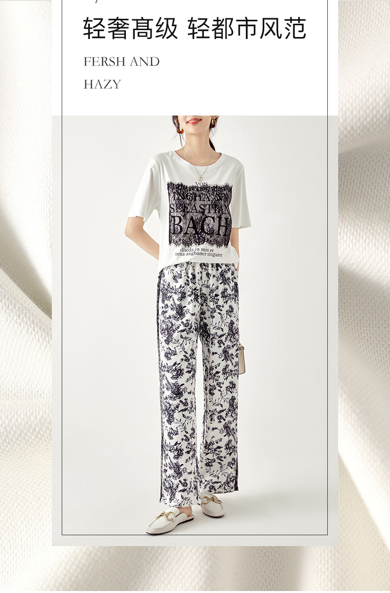 运动休闲,通勤蕾丝拼接短袖+黑白印花缎面休闲裤两件套WLZD-2305209