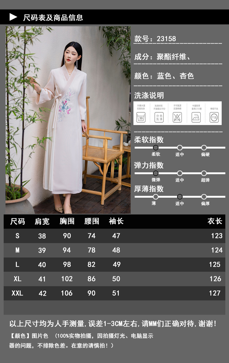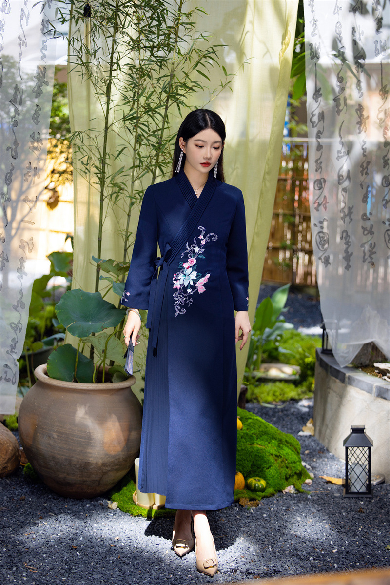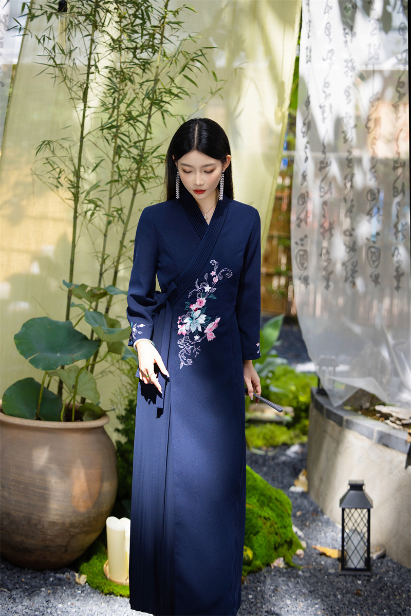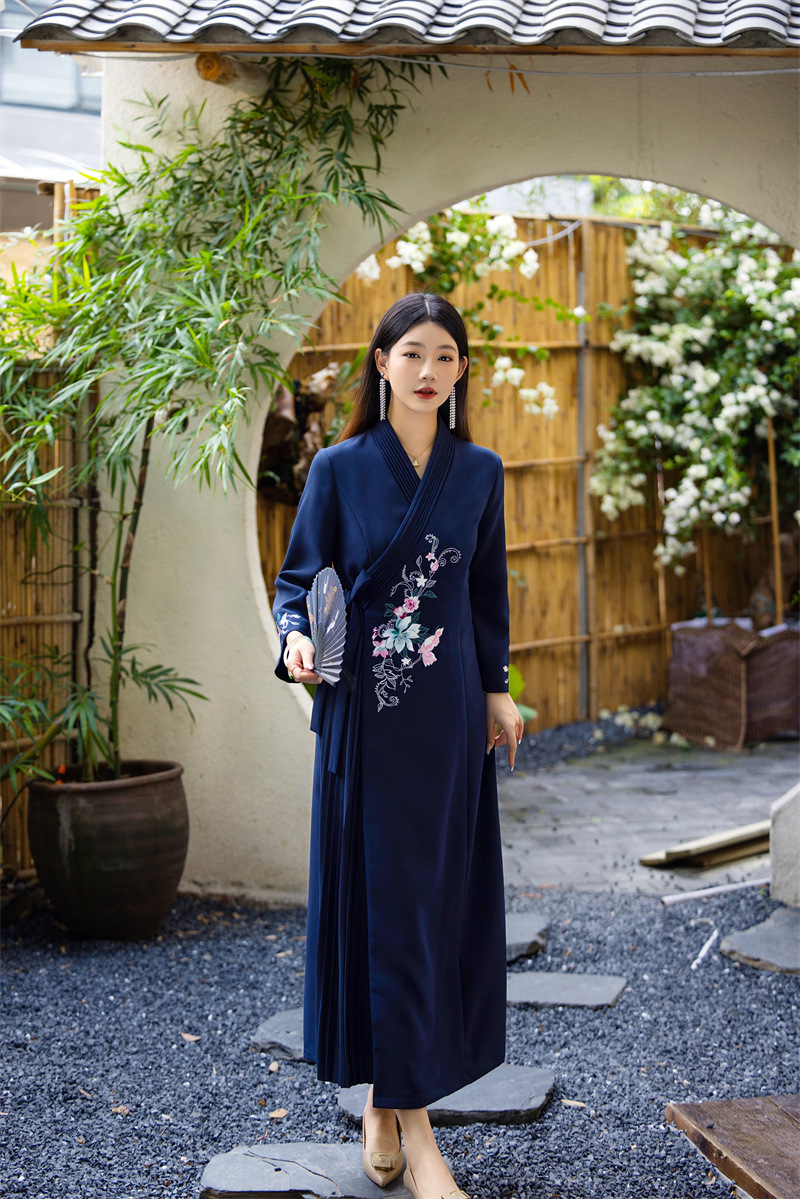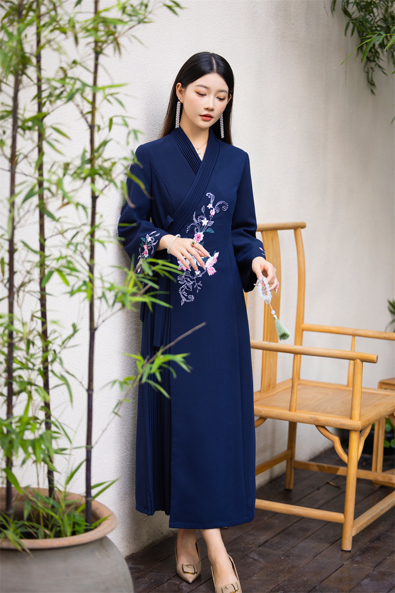 秋冬修身旗袍国风,复古中式连衣裙改良版刺绣压褶裙FL-23158