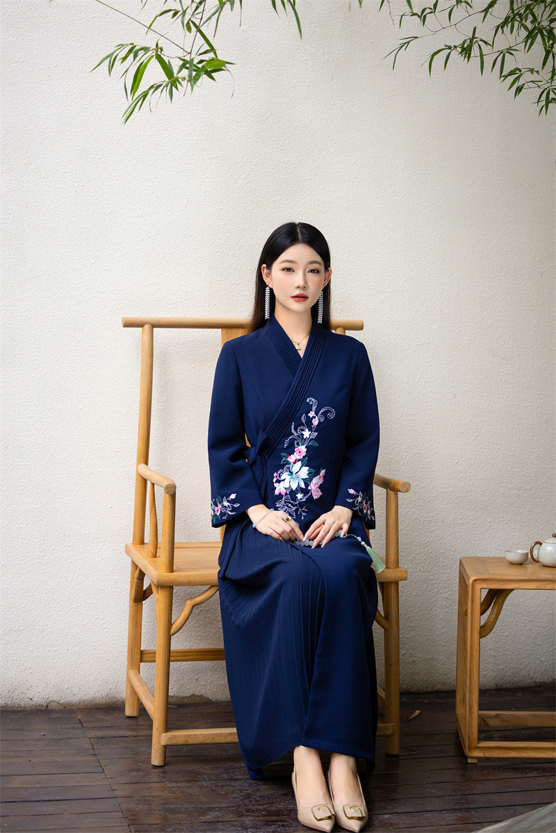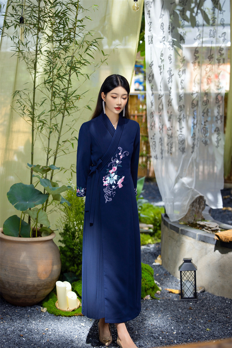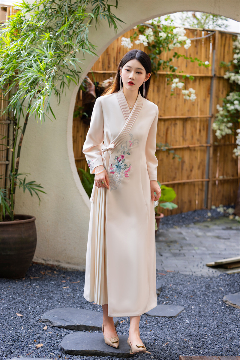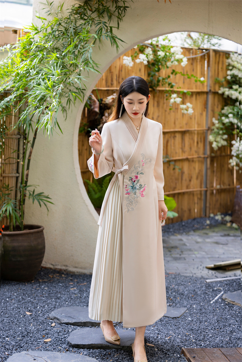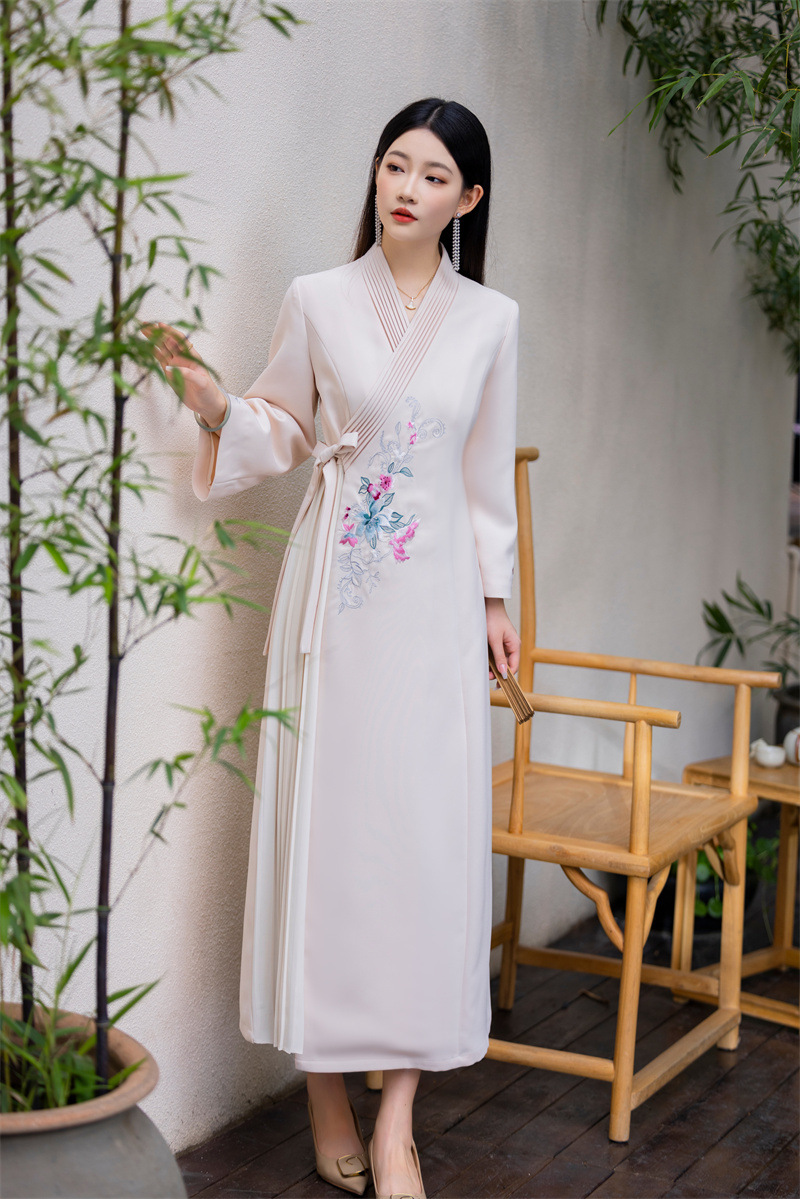 秋冬修身旗袍国风,复古中式连衣裙改良版刺绣压褶裙FL-23158