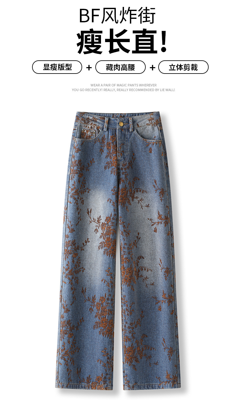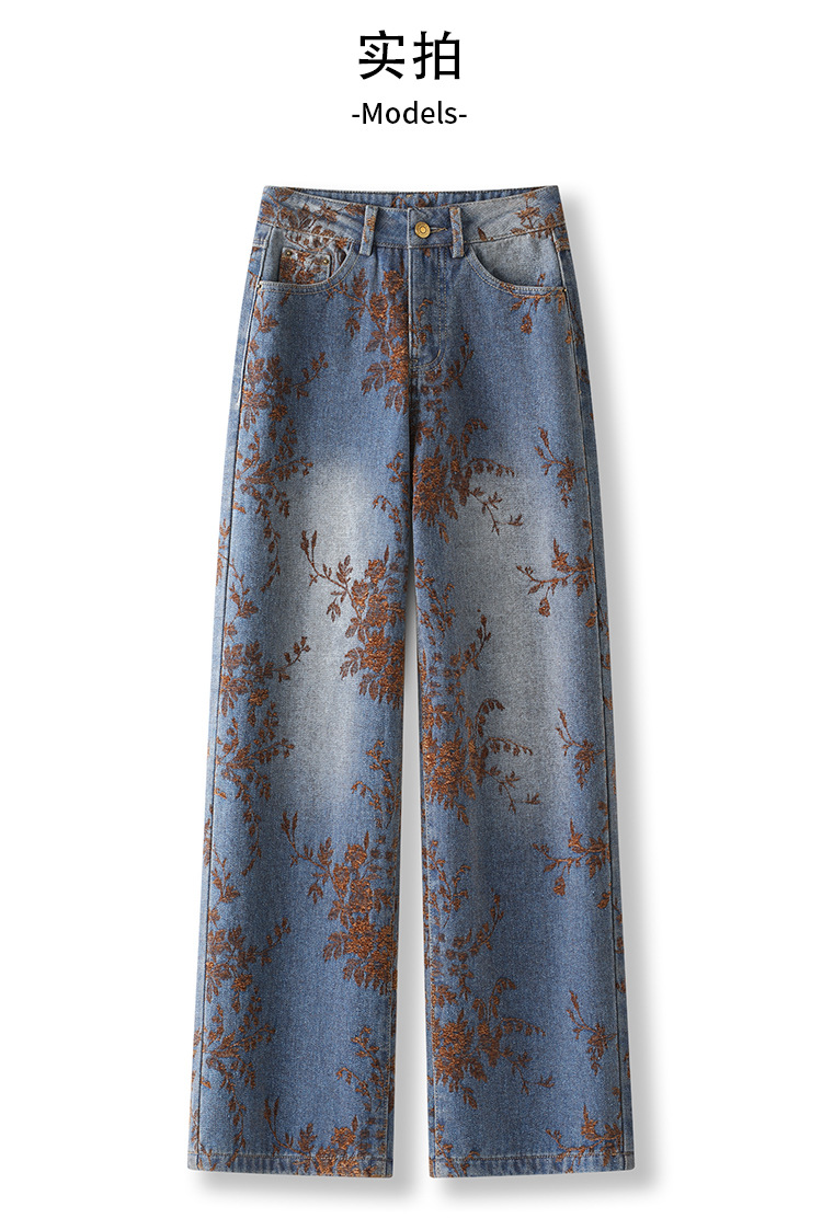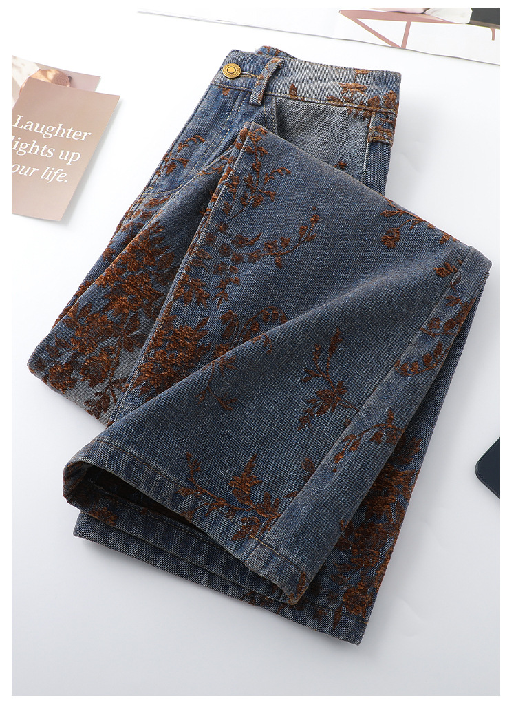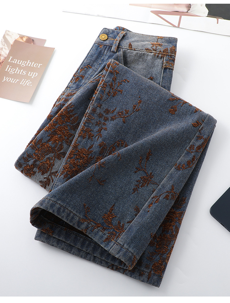 YM 6622-76雪尼尔提花直筒牛仔裤时髦洋气高腰显瘦阔腿裤 商品图0