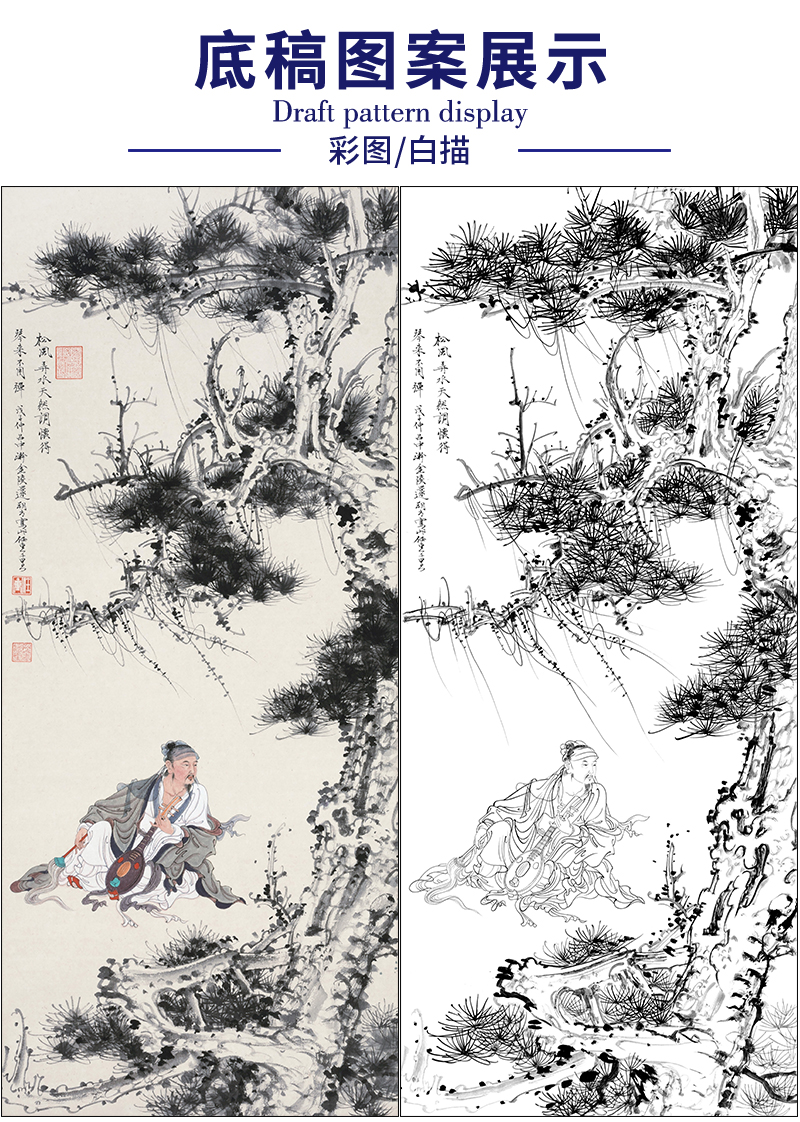 任重山水人物工笔画白描底稿《松林高仕》临摹勾线高清打印稿RD55
