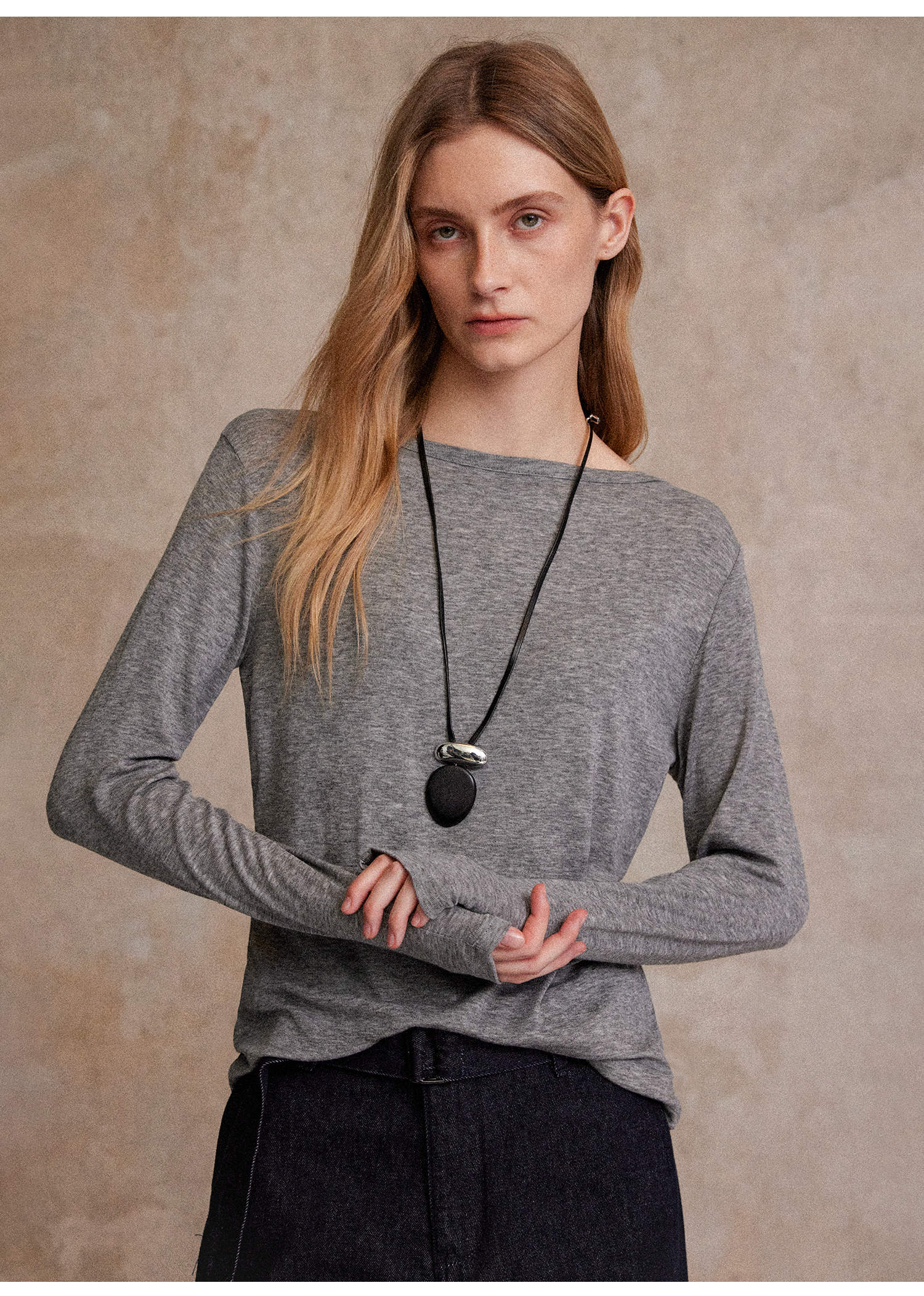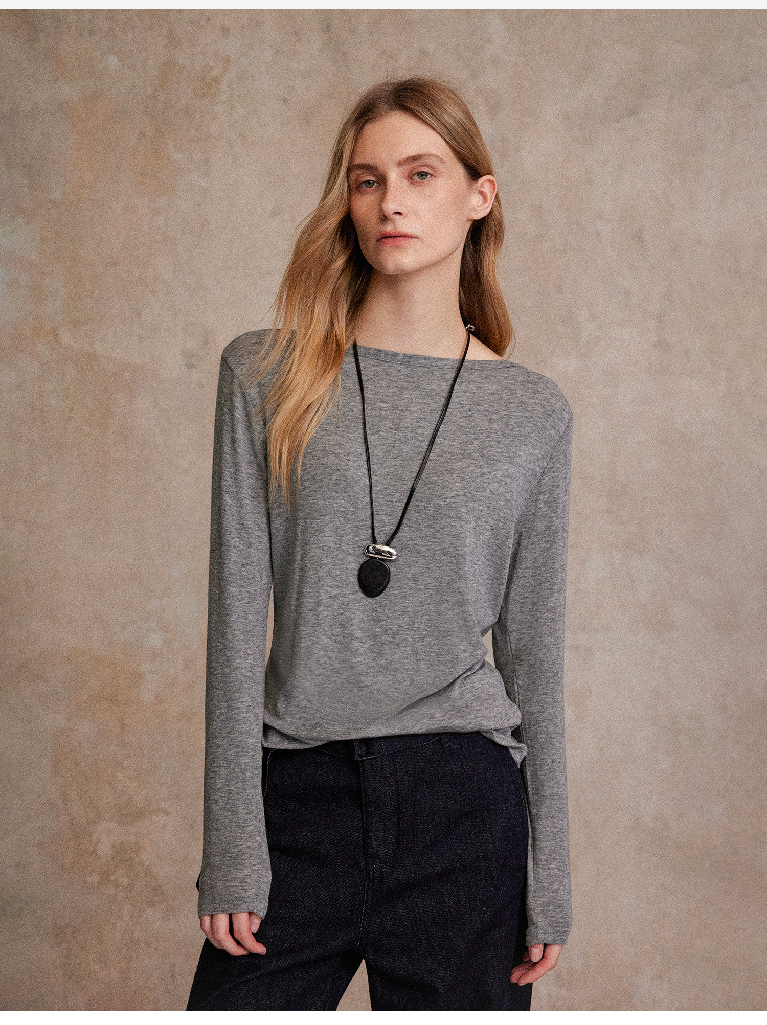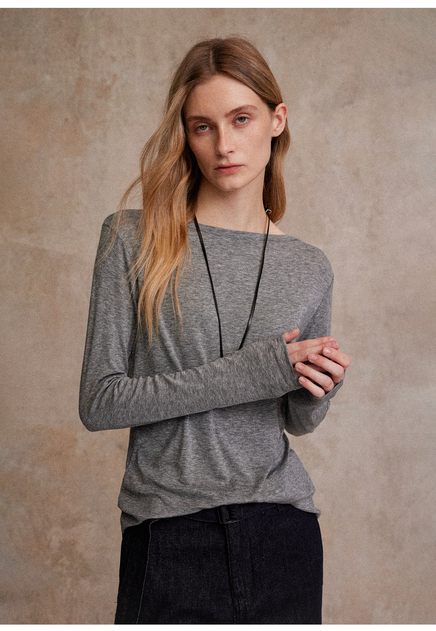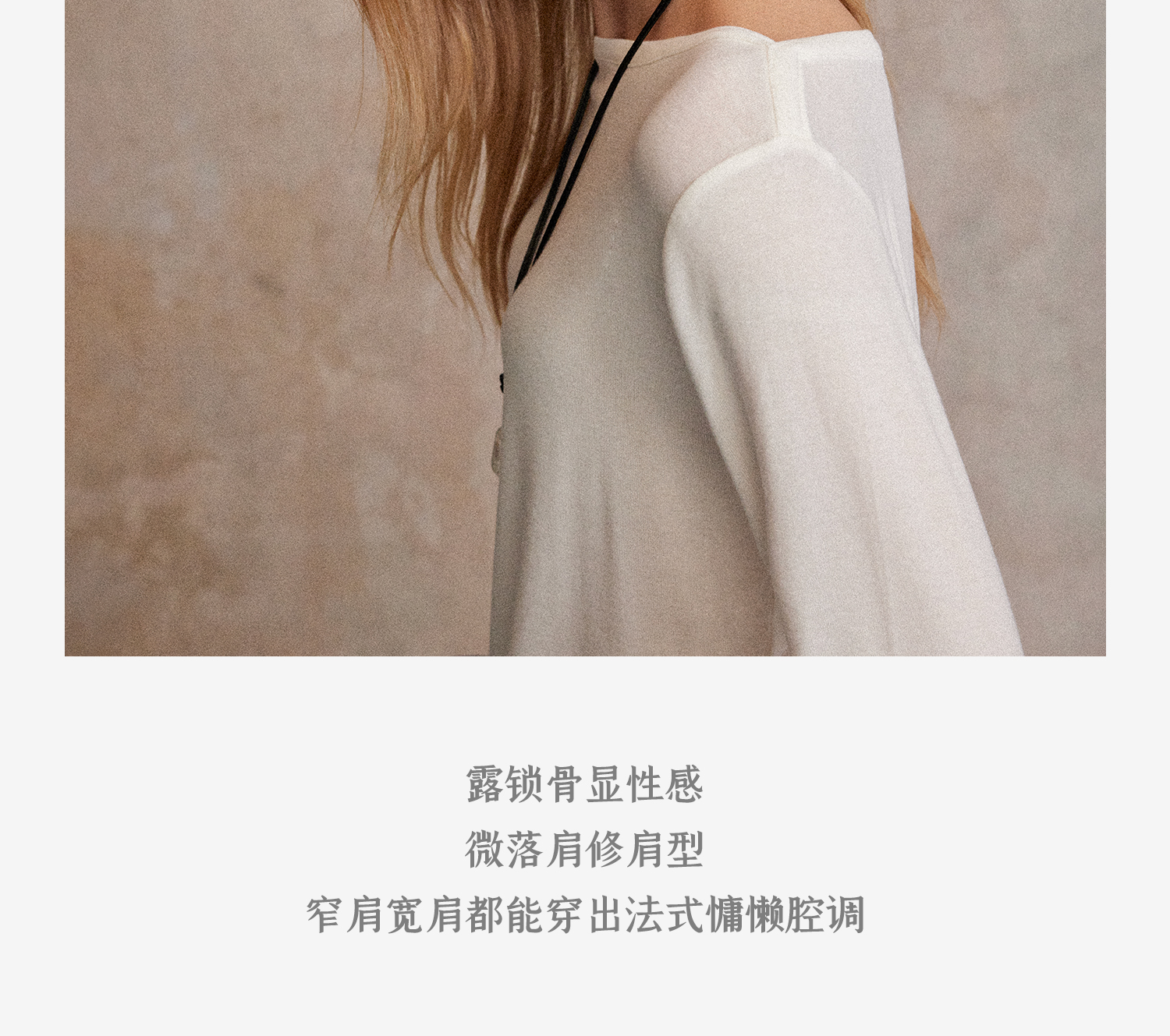 一字领宽松天丝羊毛慵懒纸片人长袖T恤T2503048
