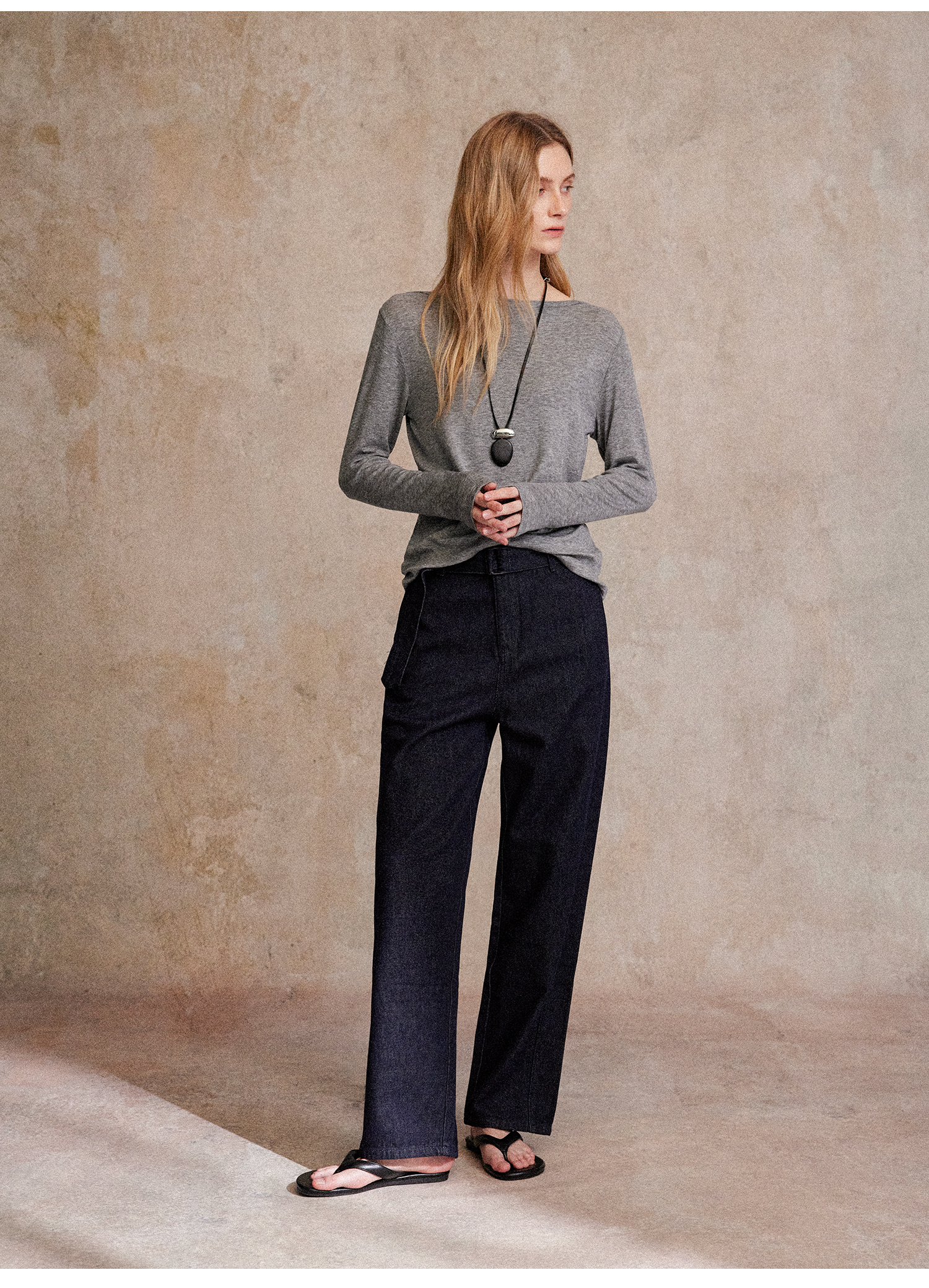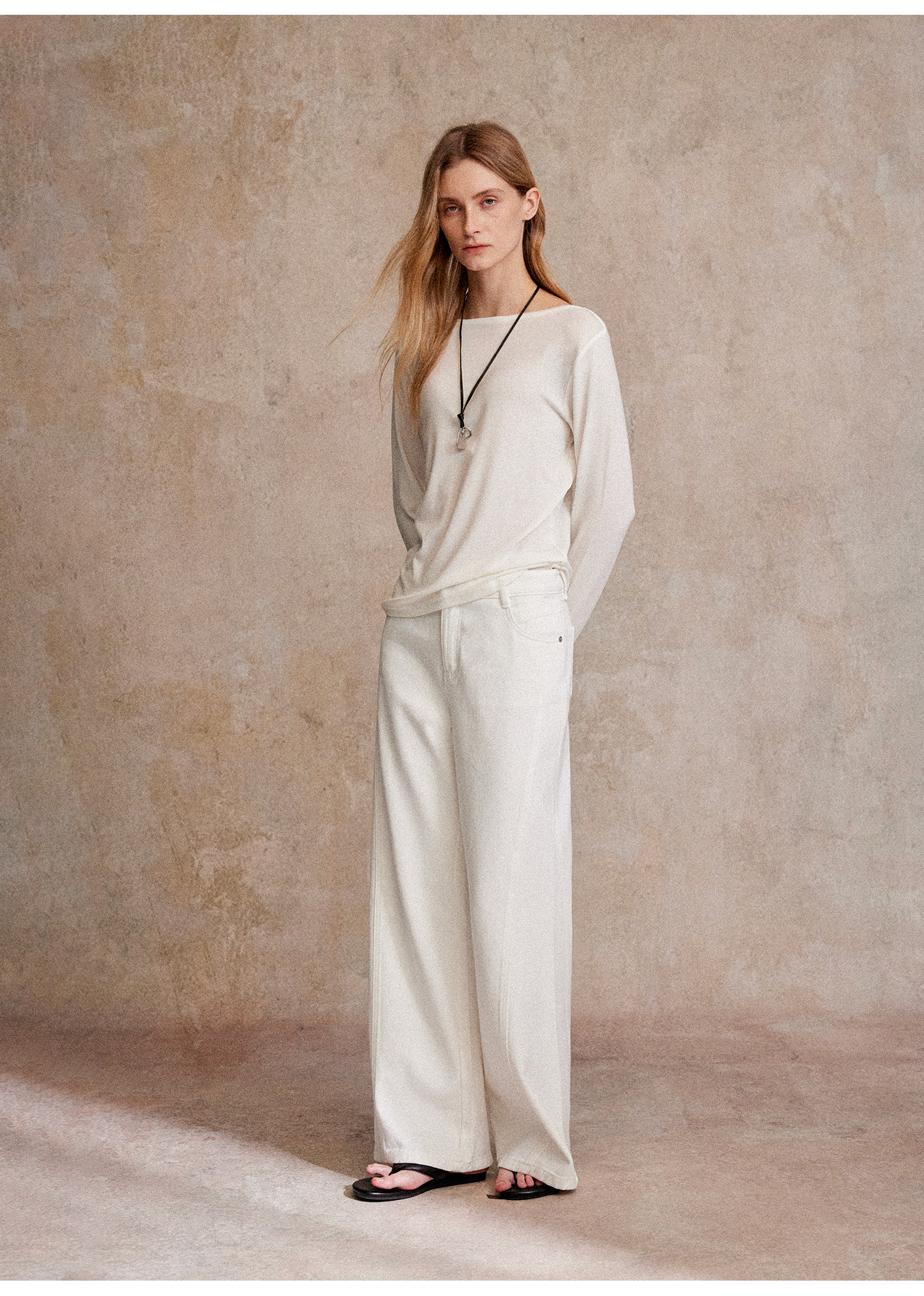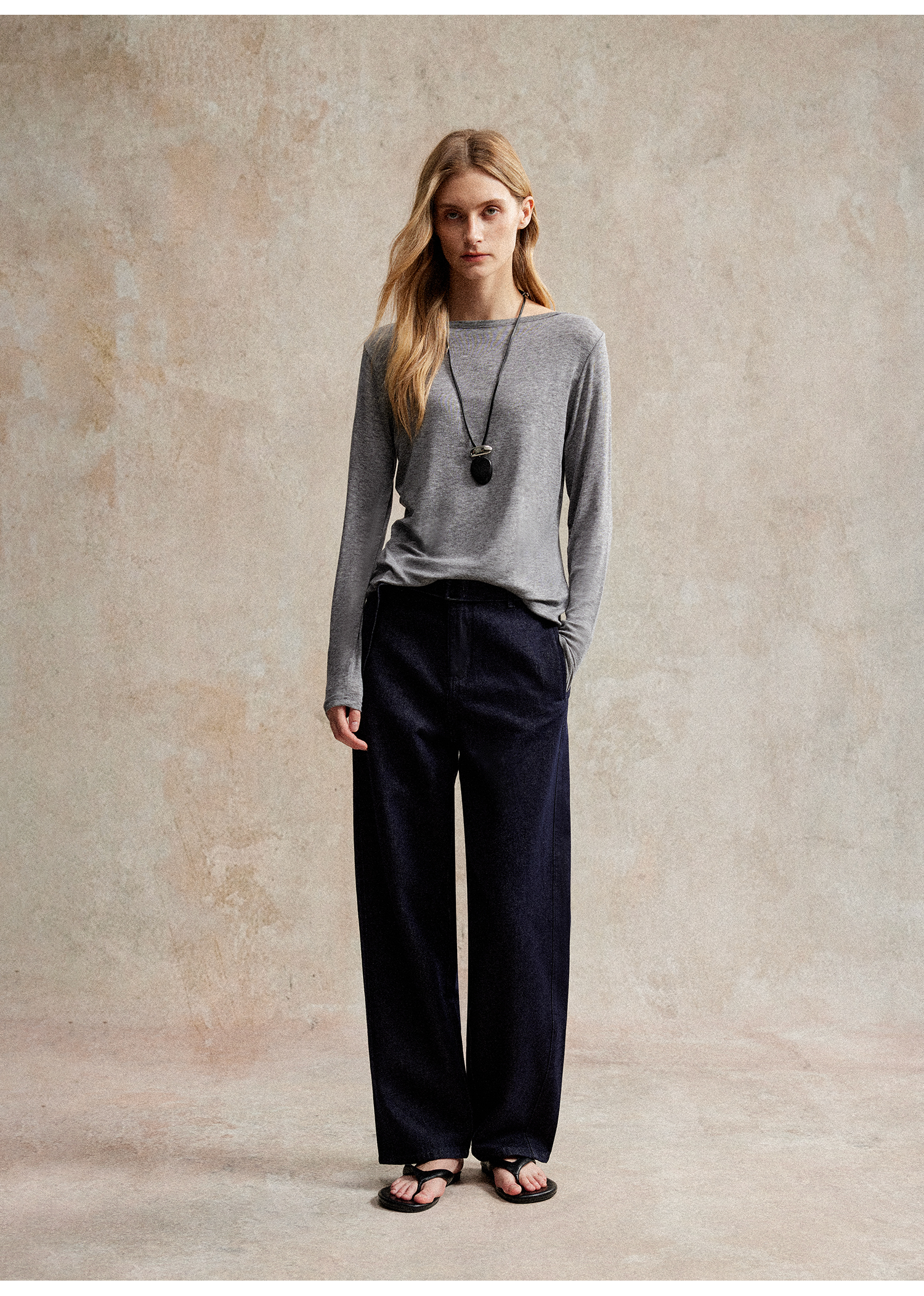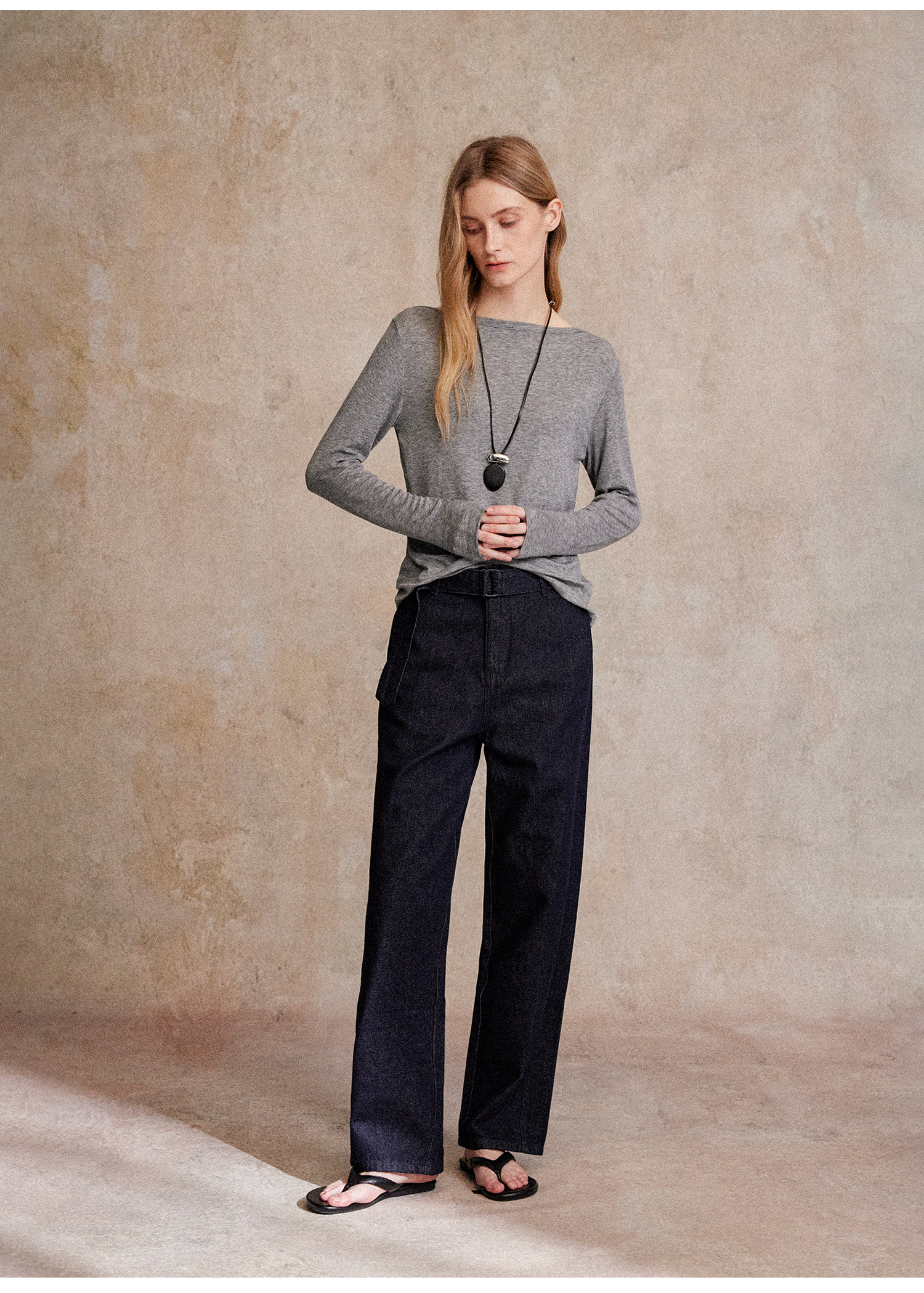 一字领宽松天丝羊毛慵懒纸片人长袖T恤T2503048