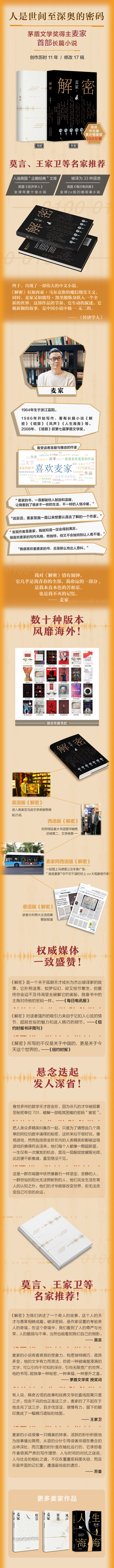 作品被译为30多种语言。其中,《解密》《暗算》入选“企鹅经典”文库;2014年《解密》被英国《经济学人》评为“全·球年度十·佳小说”,2015年获美国CALA ZUI佳图书奖,2017年被英国《每日电讯报》选入“ZUI佳20部间谍小说”。