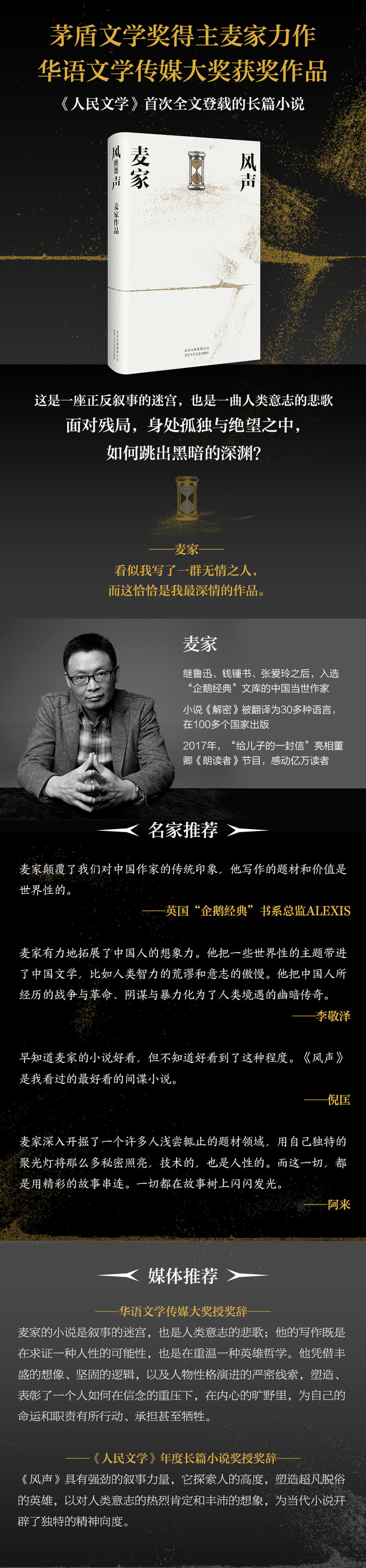 麦家的小说是叙事的迷宫,也是人类意志的悲歌;他的写作既是在求证一种人性的可能性,也是在重温一种英雄哲学。他凭借丰盛的想像、坚固的逻辑,以及人物性格演进的严密线索,塑造、表彰了一个人如何在信念的重压下,在内心的旷野里,为自己的命运和职责有所行动、承担甚至牺牲。——华语文学传媒大奖授奖辞