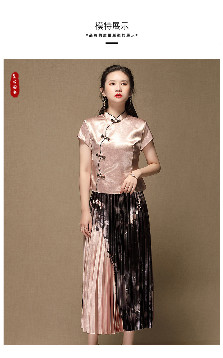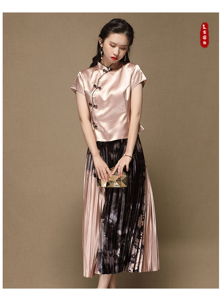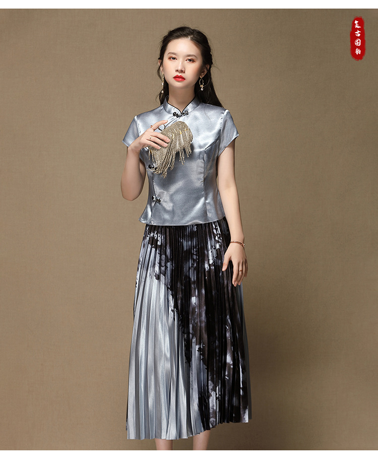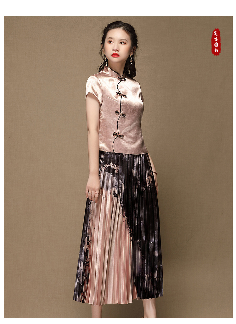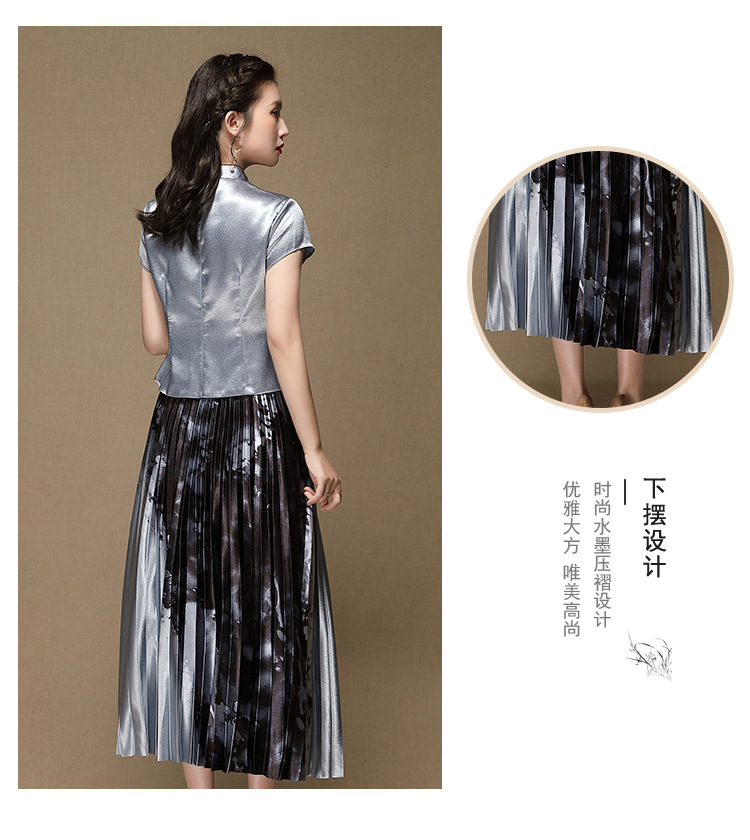 上海旗袍厂AYK-QF-200315水墨压褶长款半身裙国风改良短袖唐装上衣女2021夏时尚国潮套装女