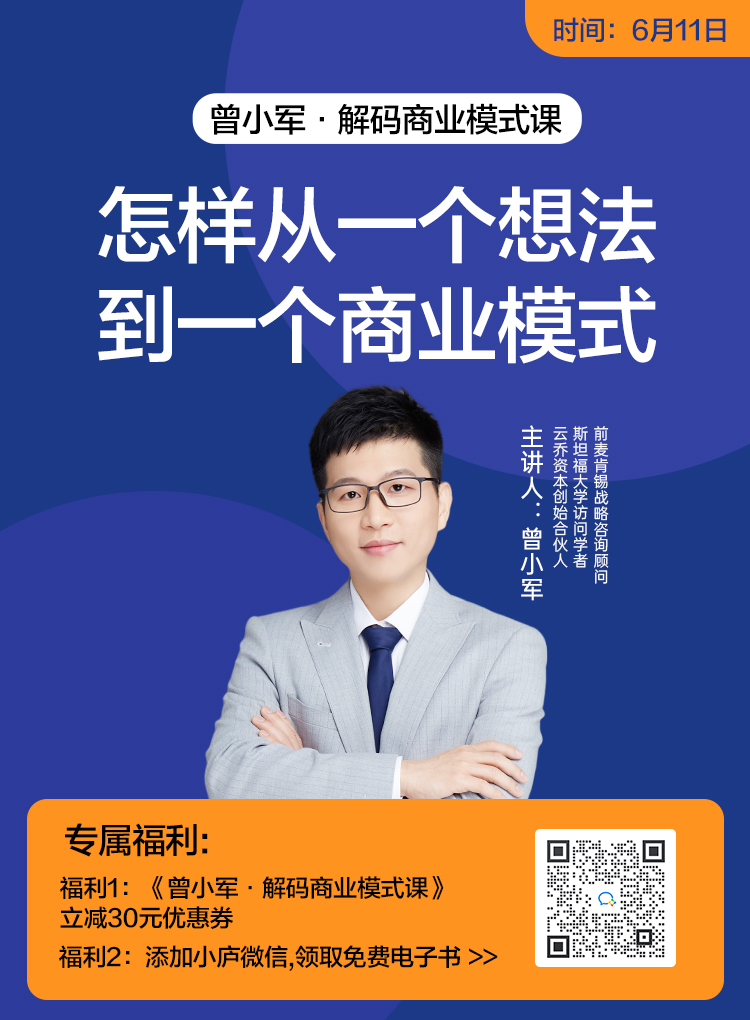 这堂课程可以帮助你少走弯路,从一开始就走对方向,找对目标。曾小军老师会带你从思维、理论、方法和工具逐步建立系统的商业模式体系,让你拥有真正的商业洞察力。