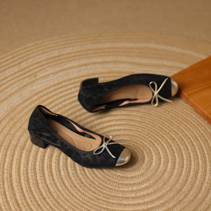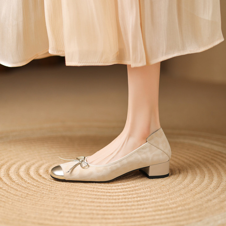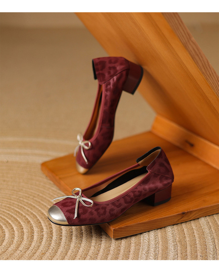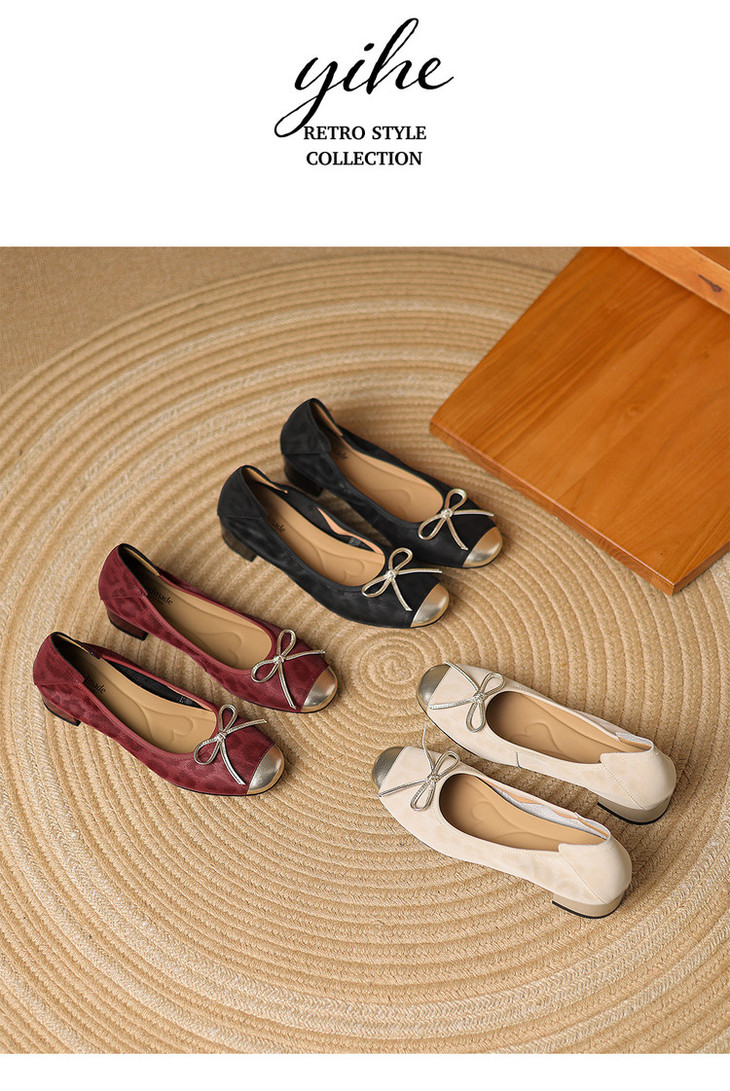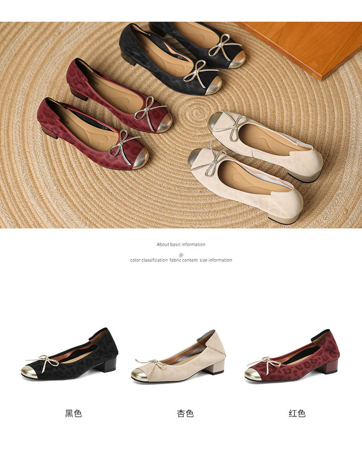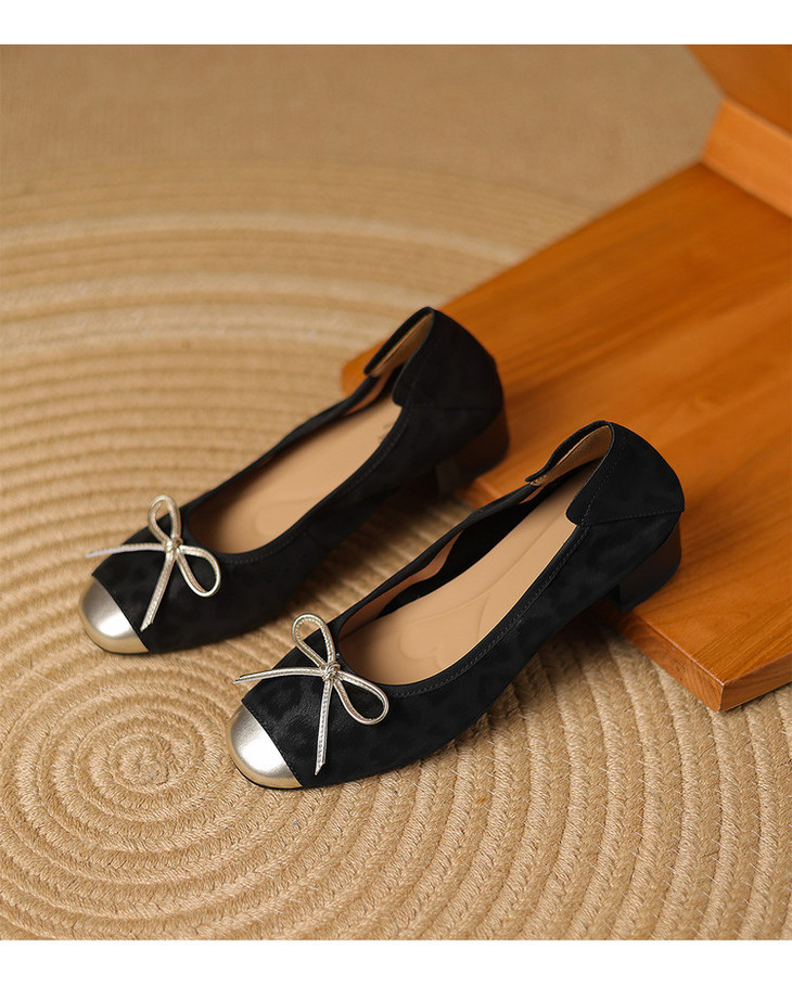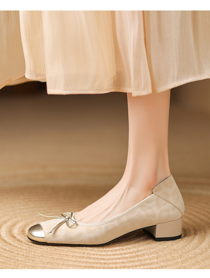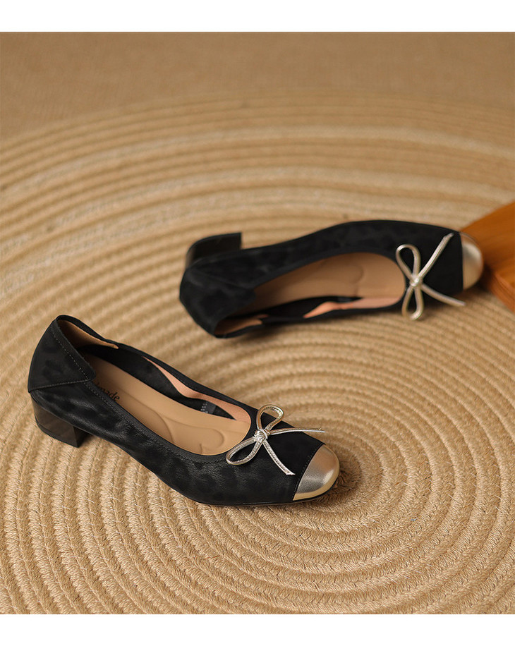 【预售5天】春季拼色真皮蝴蝶结软底女鞋法式复古国风粗跟单鞋女LD&7258