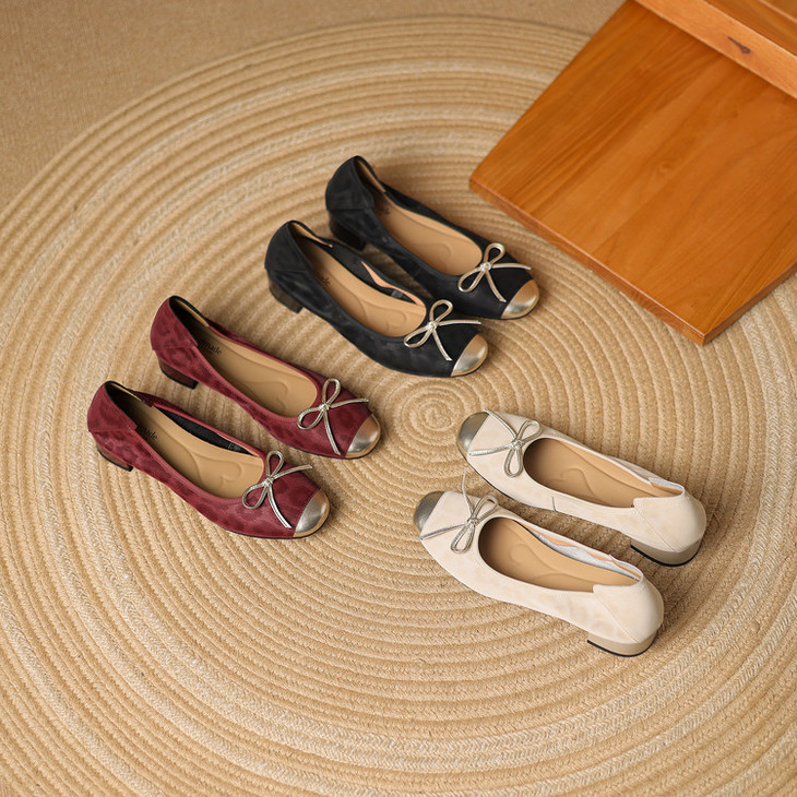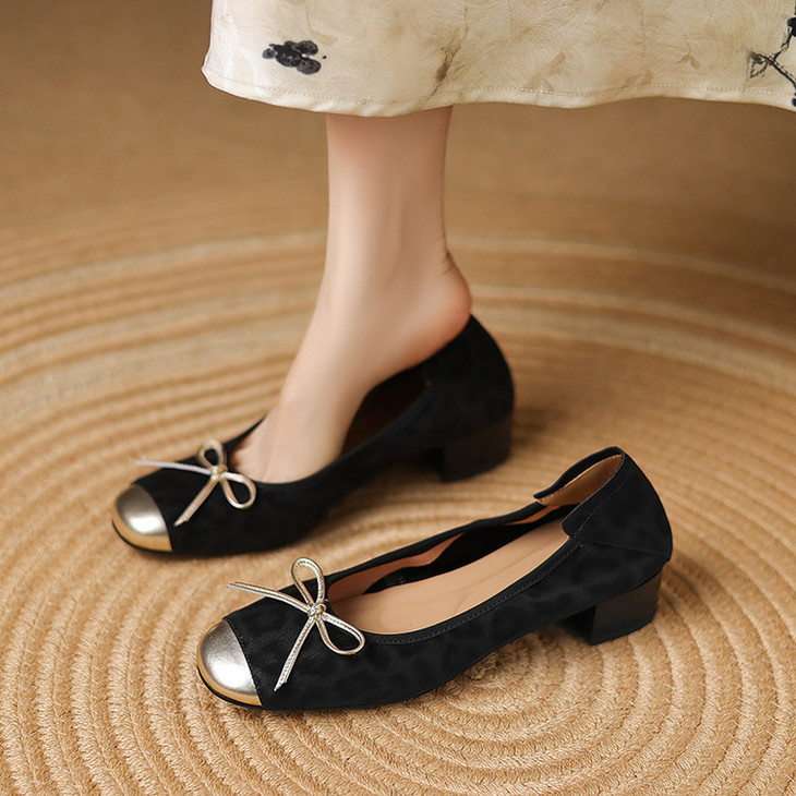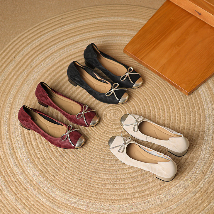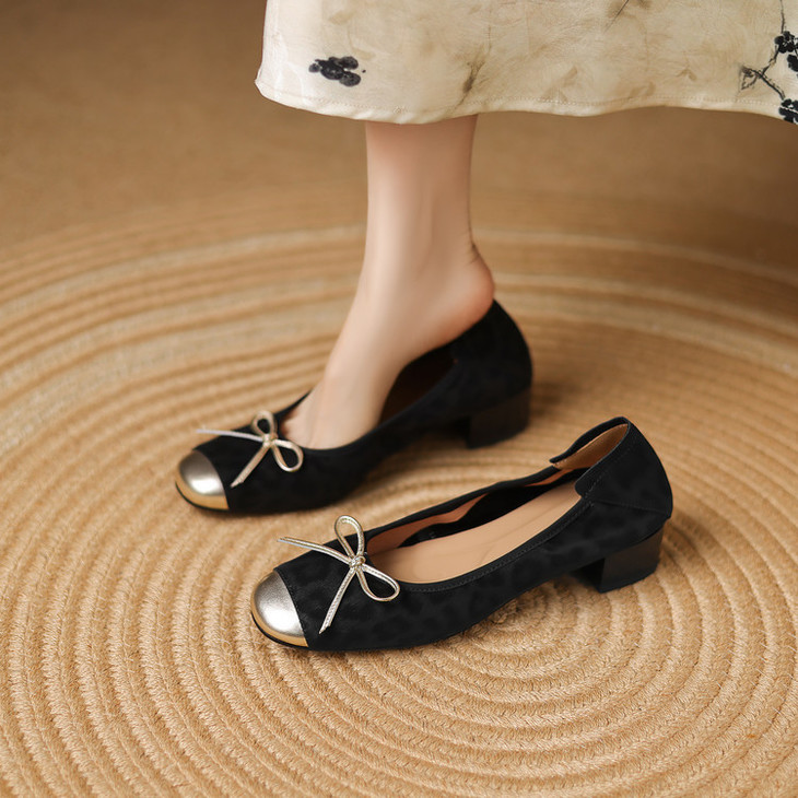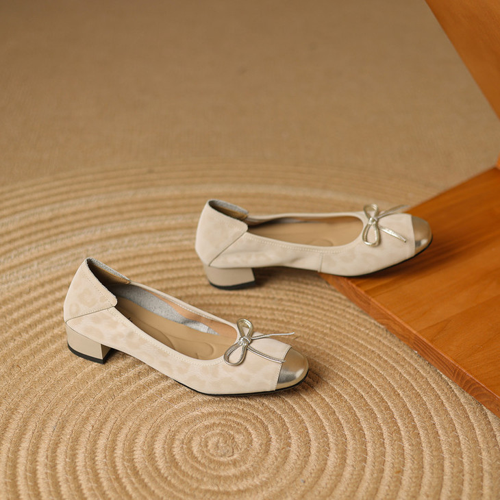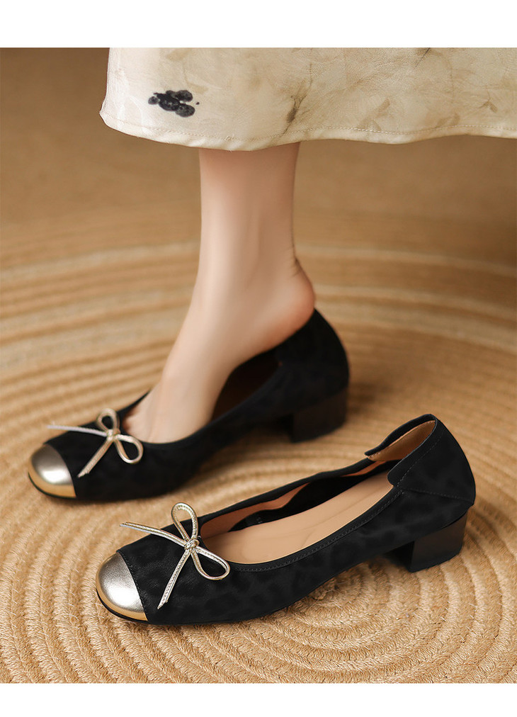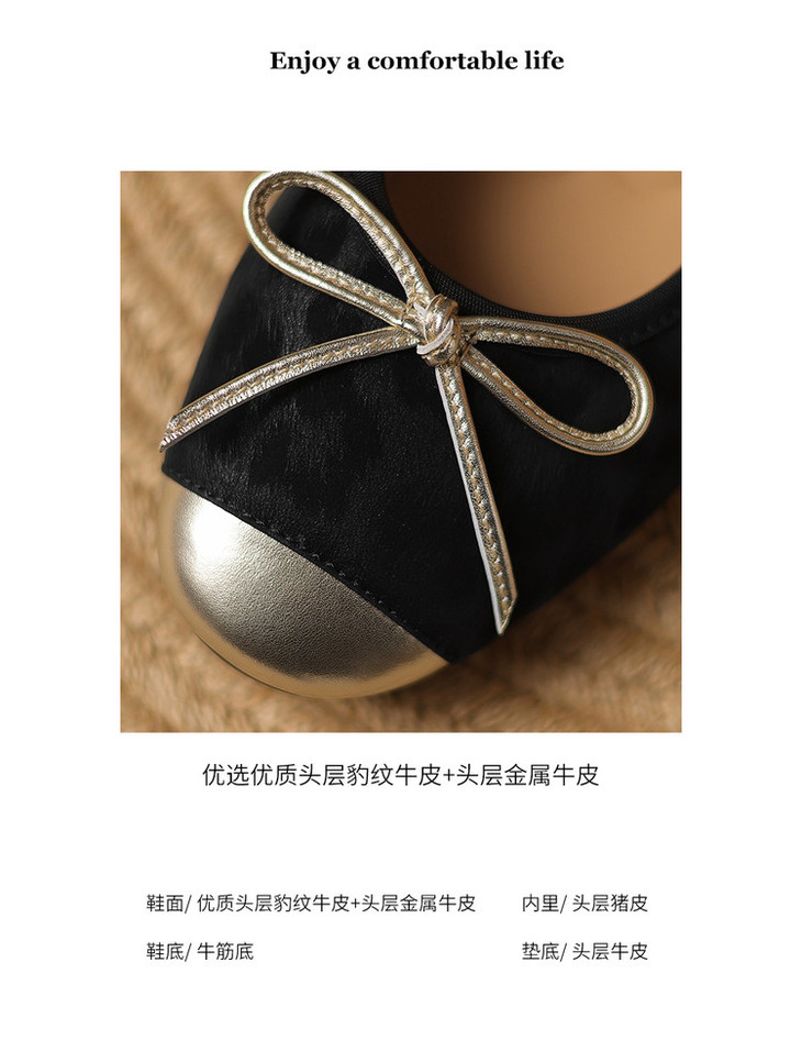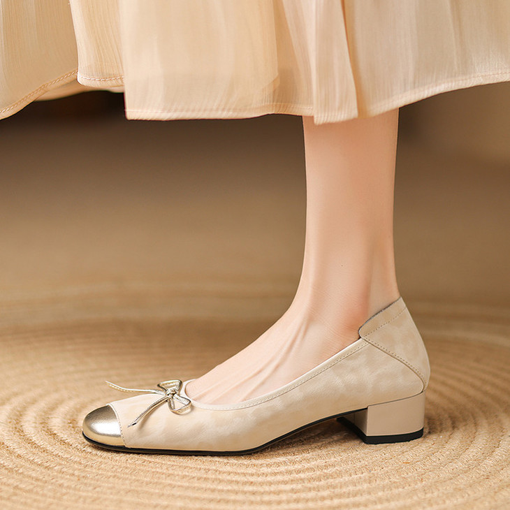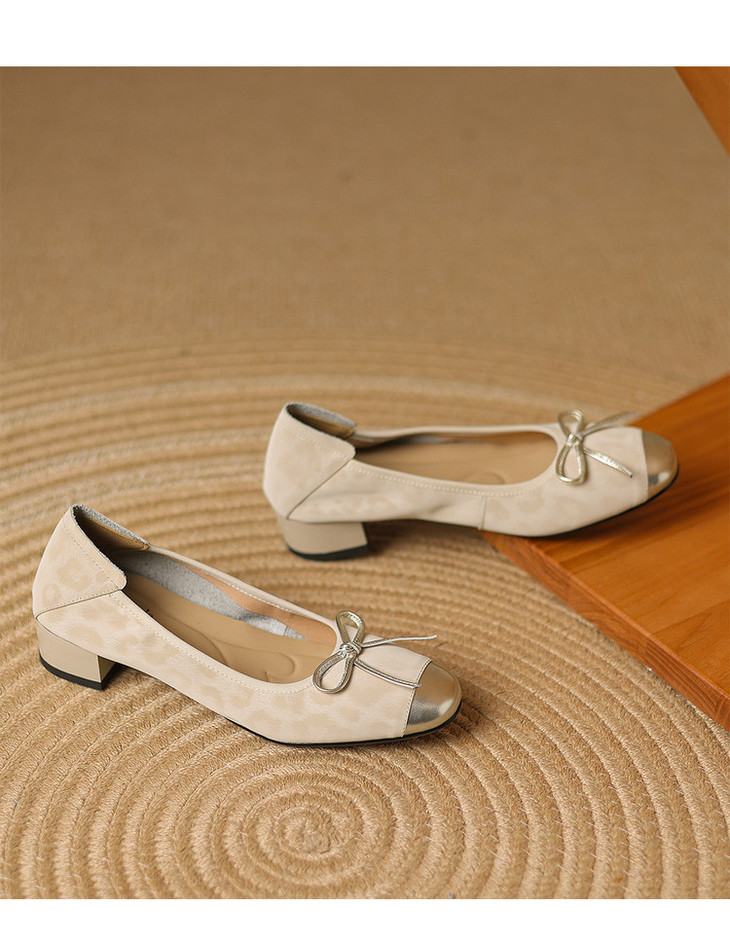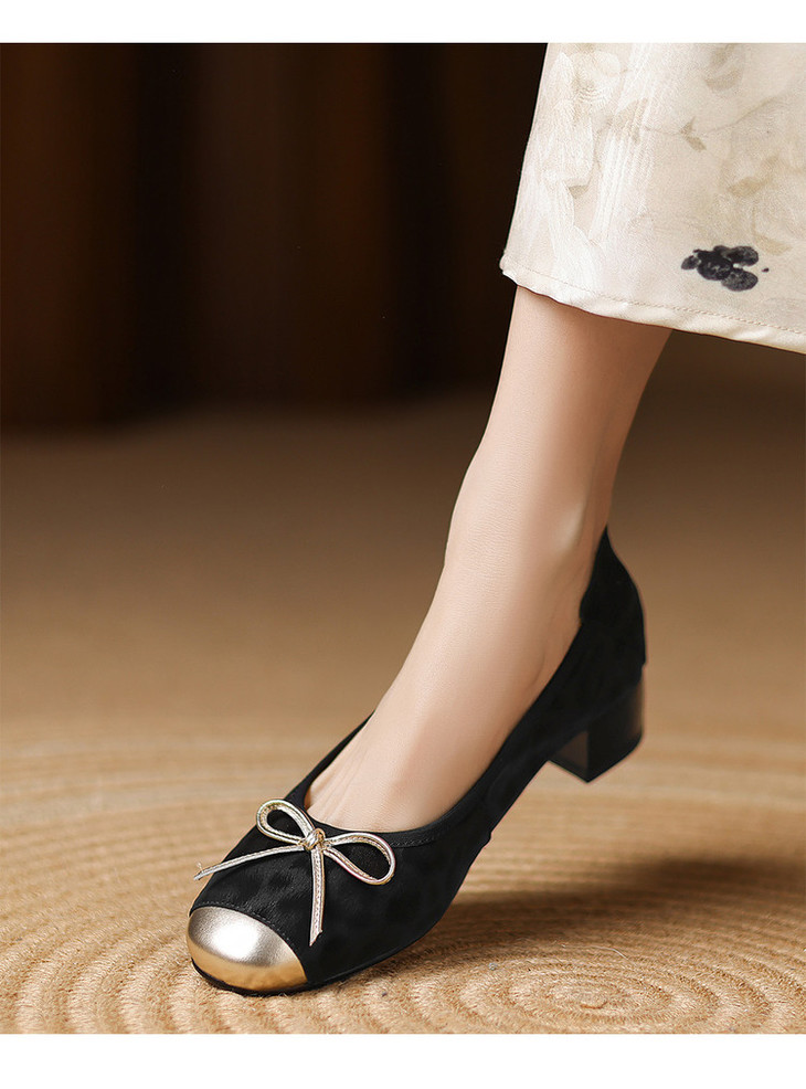 【预售5天】春季拼色真皮蝴蝶结软底女鞋法式复古国风粗跟单鞋女LD&7258