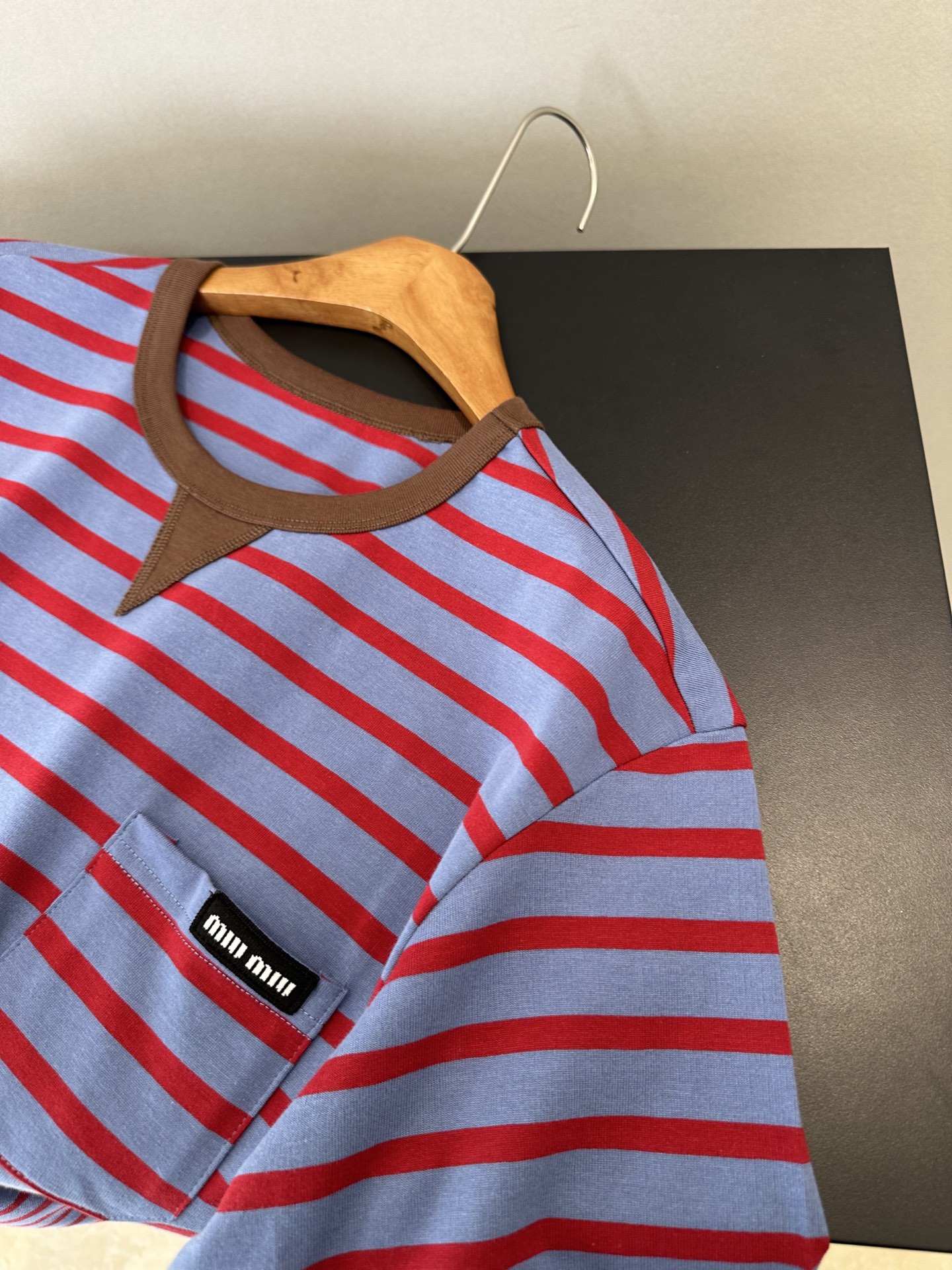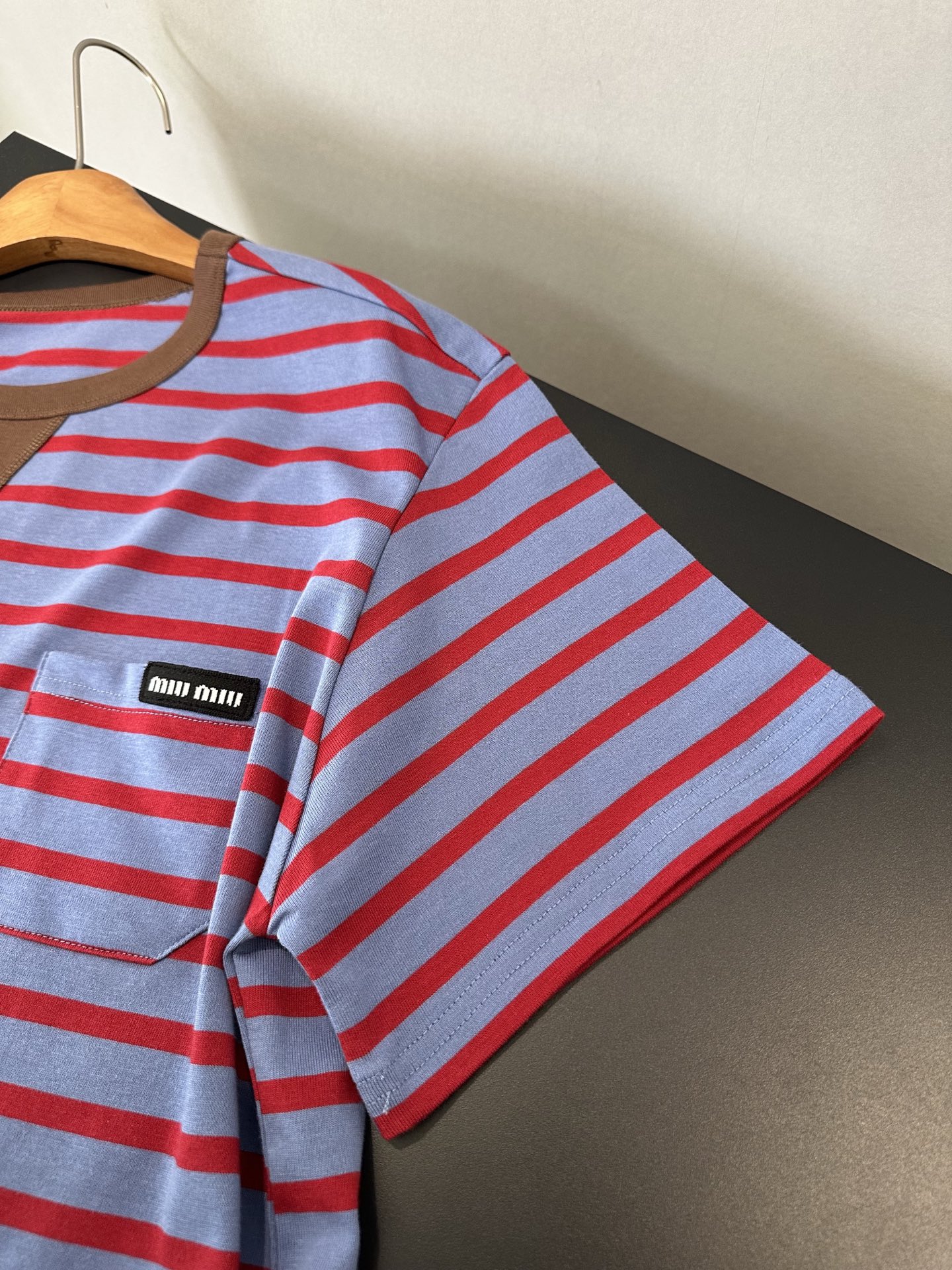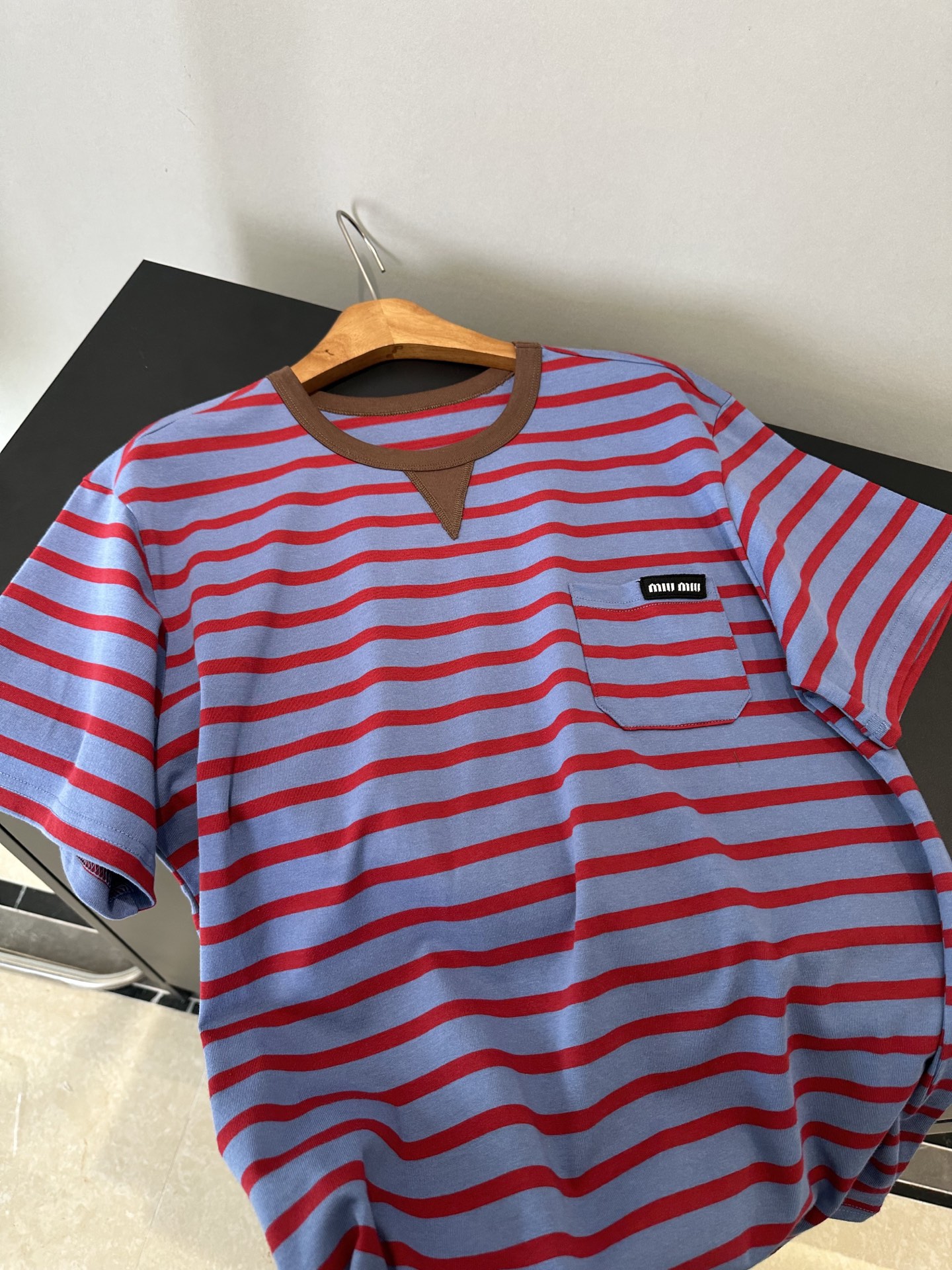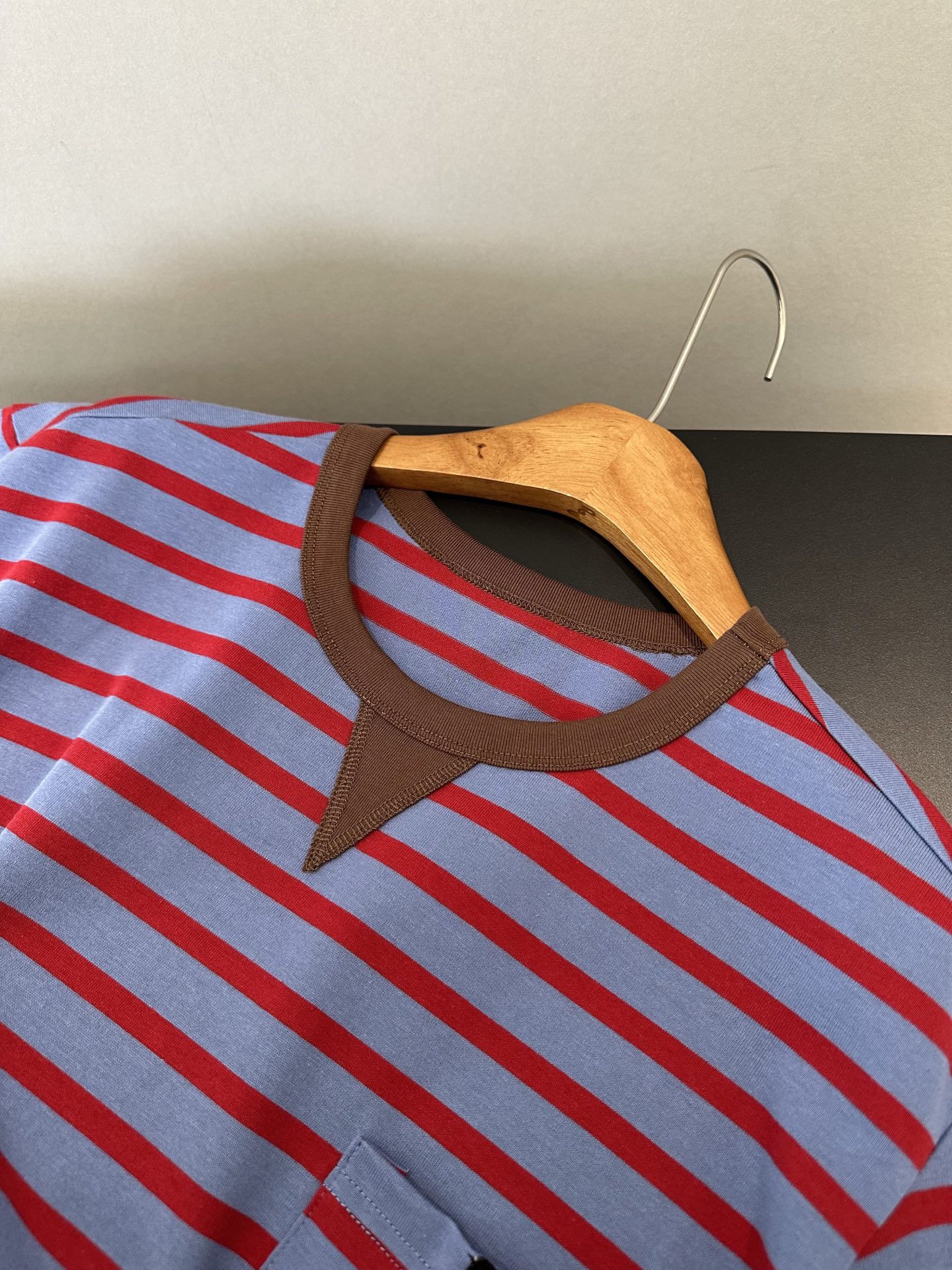85 货号069322085 ye 咖色领蓝红条纹口袋短袖