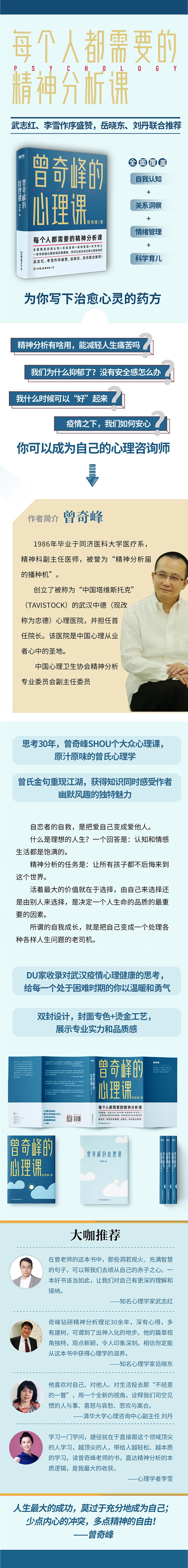 ★曾奇峰SHOU个大众实用心理课,每个人都需要的精神分析课 思考30年,历时1年打磨,原汁原味的曾氏心理学帮你快速入门心理精神分析流派。 ★一本书讲透生活中的心理难题,你可以成为自己的心理咨询师 本书应用4大生活场景,全面覆盖“自我认知+关系洞察+情绪管理+科学育儿,针对性解决生活中的最重要议题,为你写下治愈心灵的药方. ★武志红、李雪作序盛赞,岳晓东、刘丹联合推荐 知名心理学家武志红:“在曾老师的这本书中,那些洞若观火、充满智慧的句子,可以帮我们去顺从自己的赤子之心。一本好书该当如此,让我们对自己有更深的理解和接纳。” ★DU家收录对武汉疫情心理健康的思考,给每一个处于困难时期的你以温暖和勇气 曾奇峰老师是武汉人,疫情期间正在武汉,疫情会增加我们的情绪,解决情绪的方式,就是增加我们的思考。寻找确定性,我们寻找到确定性的东西越多,我们的内心就越安稳,相信自然的痊愈力量。 ★曾氏金句重现江湖,获得知识同时感受作者幽默风趣的独特魅力 自恋者的自救,是把爱自己变成爱他人。 什么是理想的人生?一个回答是:认知和情感生活都是饱满的。 精神分析的任务是:让所有孩子都不后悔来到这个世界。 活着优选的价值就在于选择,由自己来选择还是由别人来选择,是决定一个人生命的品质的最重要的因素。 所谓的自我成长,就是把自己变成一个处理各种各样人生问题的老司机。 ★双封设计,封面专色+烫金工艺,展示专业实力和品质感