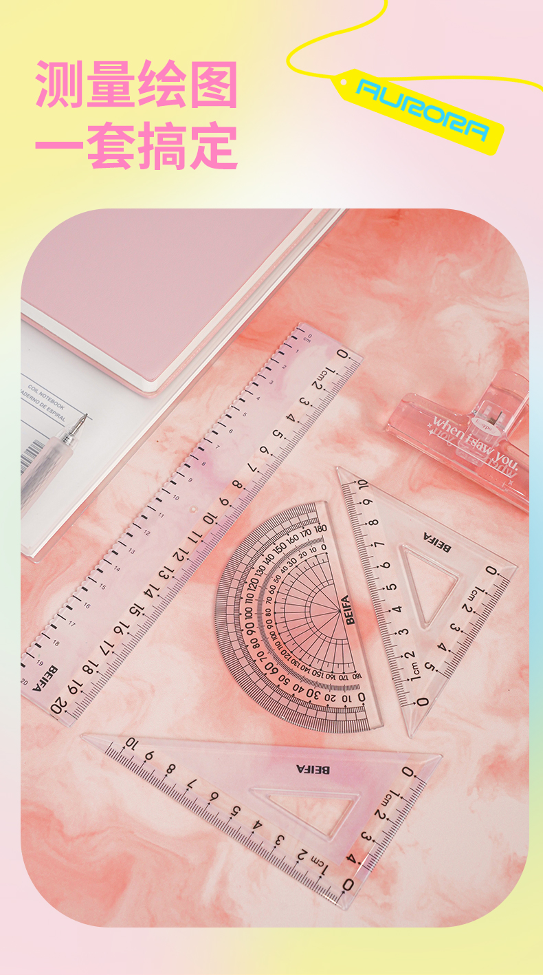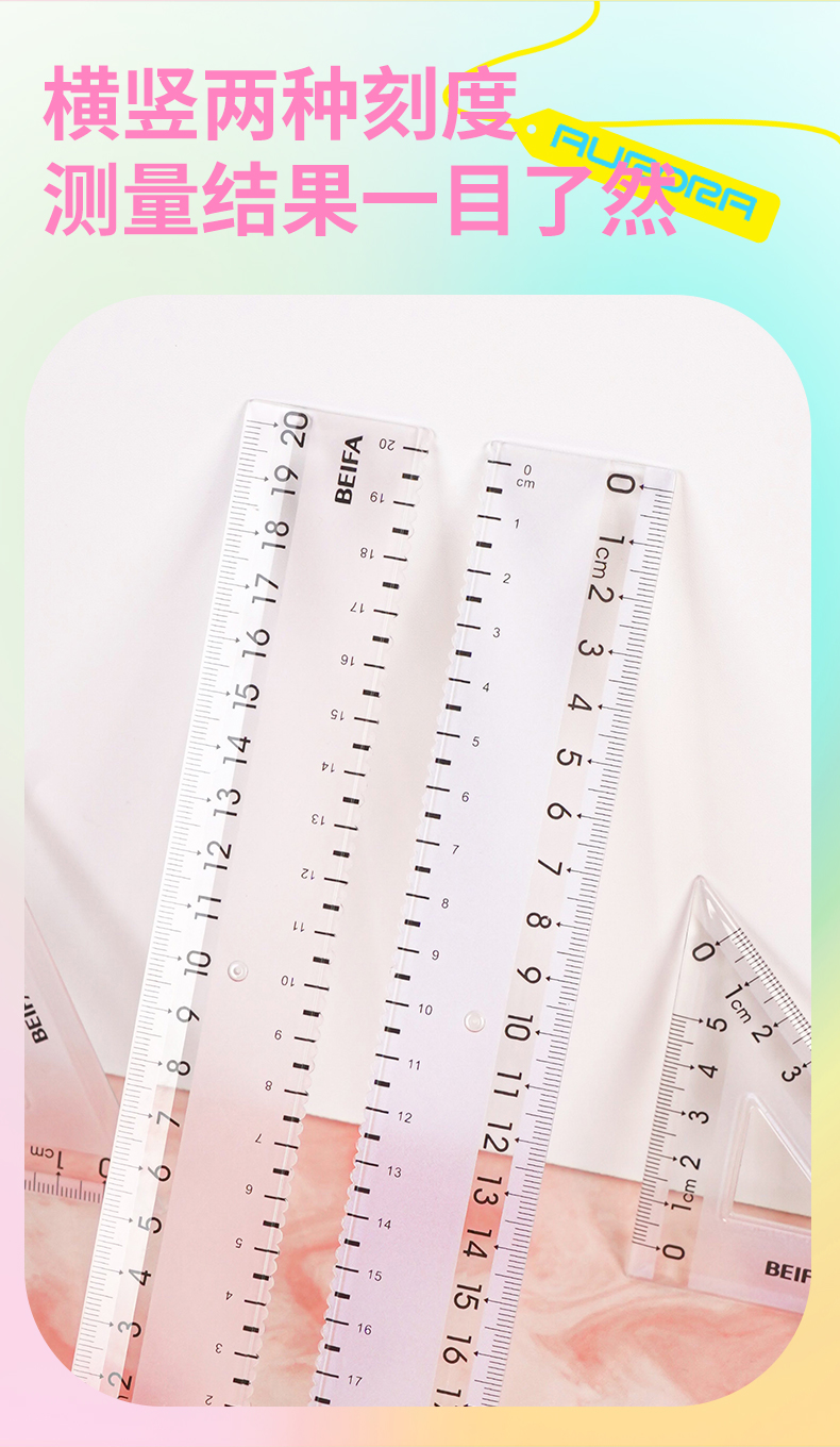 尺子【开学季】beifa贝发极光变色套尺 直尺三角尺 半圆尺测量数学计算 0227