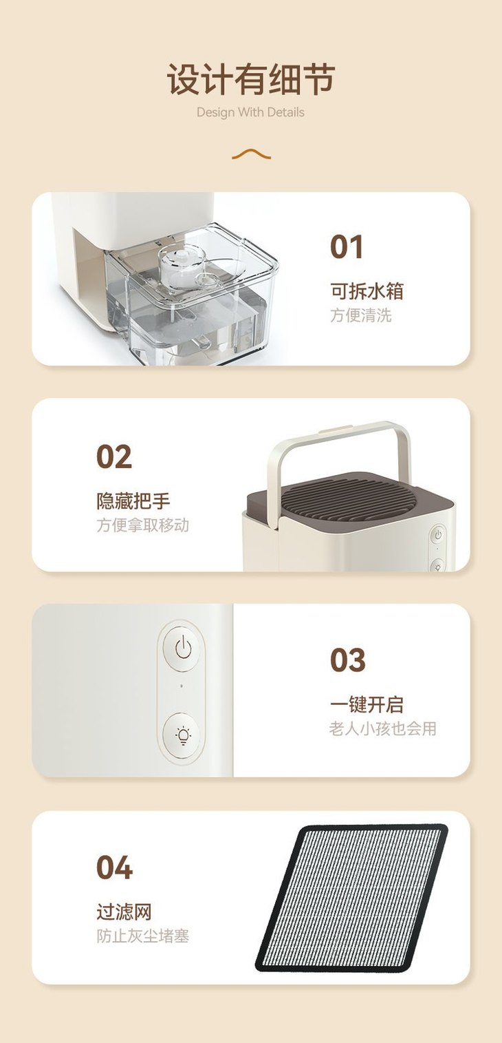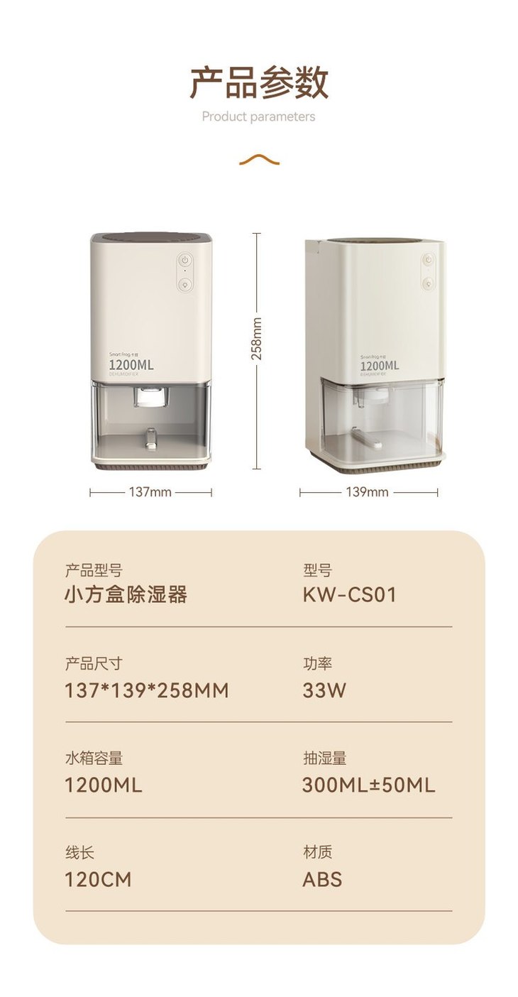【核心卖点】 ● 小巧便携,方便放到屋子里每处使用 (客厅、卧室、浴室、衣柜、鞋柜等) ●活性炭滤网空气过滤,除潮去味净化空气 ●新型半导体冷凝鳍片,大大提升除湿效果 ●自动除霜功能,保持除湿机冬季的除湿效率 ●澎湃吸力,除湿源动力
