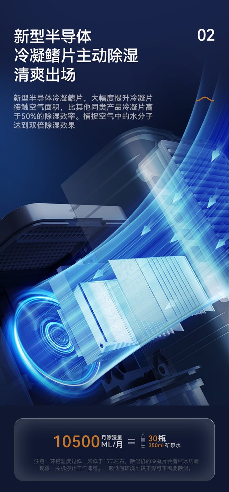 ● 新型半导体冷凝技术,大大提升除湿效果 大幅度提升冷凝片接触空气面积 一个月的除湿量可达10500ml,相当于30瓶350ml的矿泉水