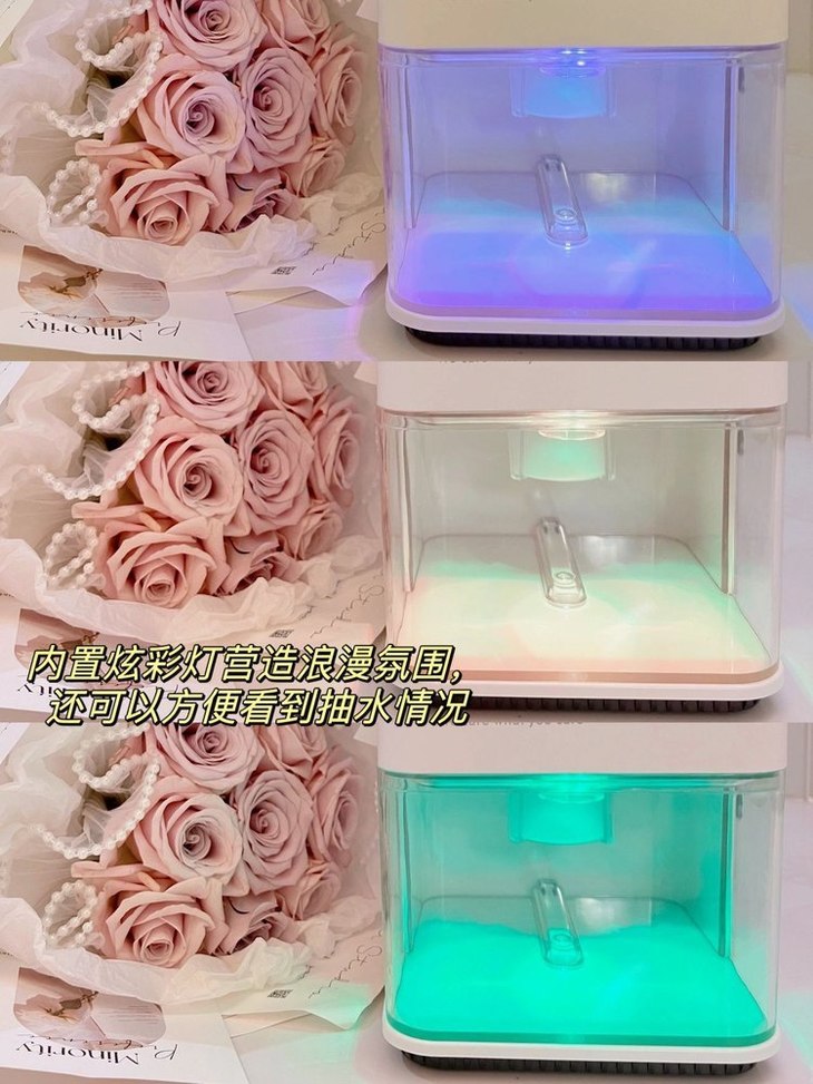 ●DC直流变频技术,节能省电久开无负担 ●高敏水位传感系统,水满自动停止防止水溢出 ● 内置炫彩灯,营造浪漫氛围 ● 轻音运行,予你无声陪伴