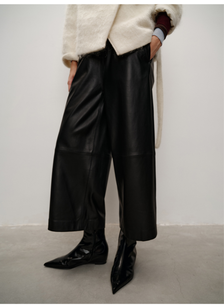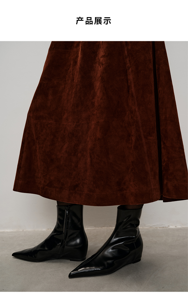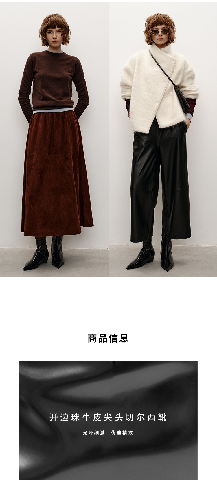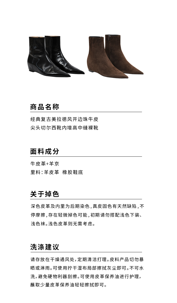 HIDEMI经典复古美拉德风开边珠牛皮尖头切尔西短靴内增高中缝踝靴