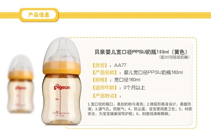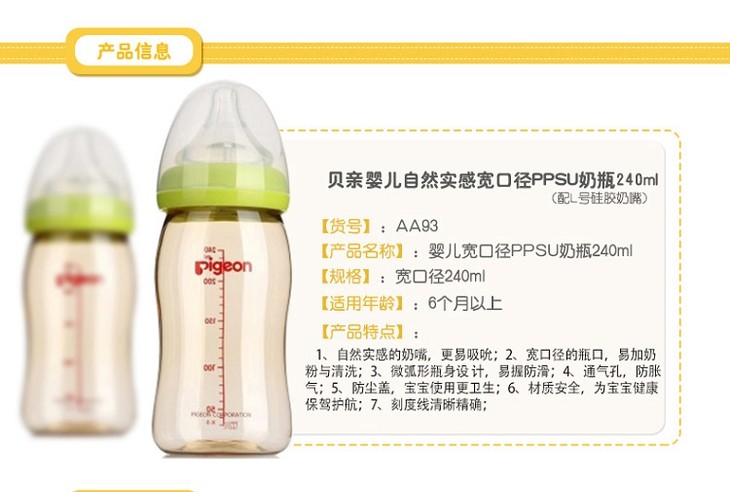 【一般贸易】贝亲-“自然实感”宽口径PPSU奶瓶240ml / 奶瓶160ml(黄色)AA93+AA77