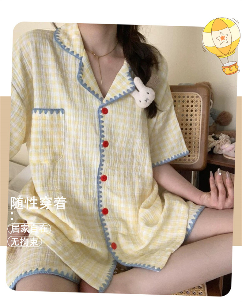 夏季【可爱舒适云朵棉睡衣】夏天新款短袖套装 撞色格子开衫家居服  商品图0