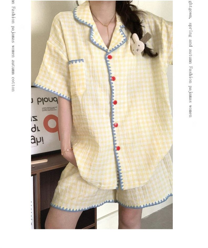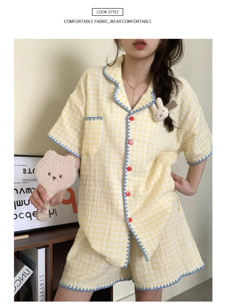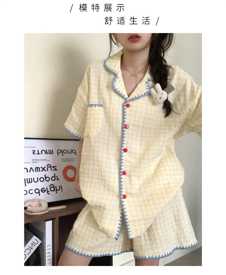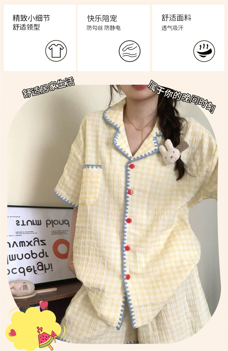 夏季【可爱舒适云朵棉睡衣】夏天新款短袖套装 撞色格子开衫家居服  商品图6