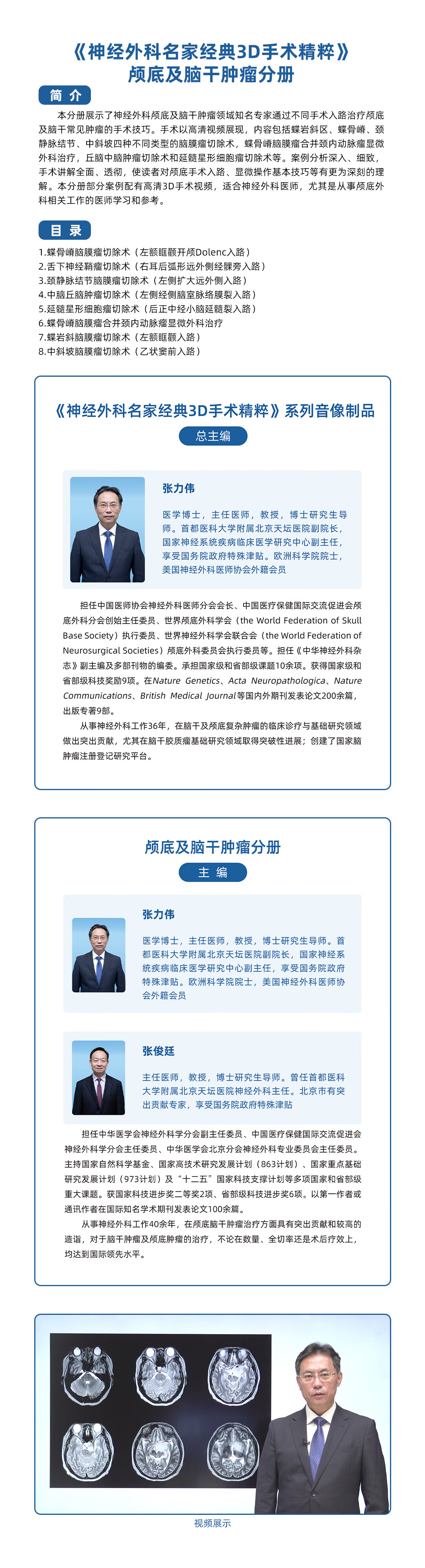本套音像制品共12个分册,视频总长度3000余分钟,从颅底及脑干肿瘤、胶质瘤等12个亚专科讲解了神经外科的经典手术,以专家分析讲解为主线,以手术操作为核心,内容包括病例简介、术前影像、手术策略、手术入路选择和风险、手术操作、术后影像及患者恢复情况、专家点评等,着重讲解手术过程、操作重点及手术技巧,将理论与实践紧密结合。专家权威、内容专业、指导性强,配有3D视频,可使学习者体验真实的手术场景,具有很高的学术价值。