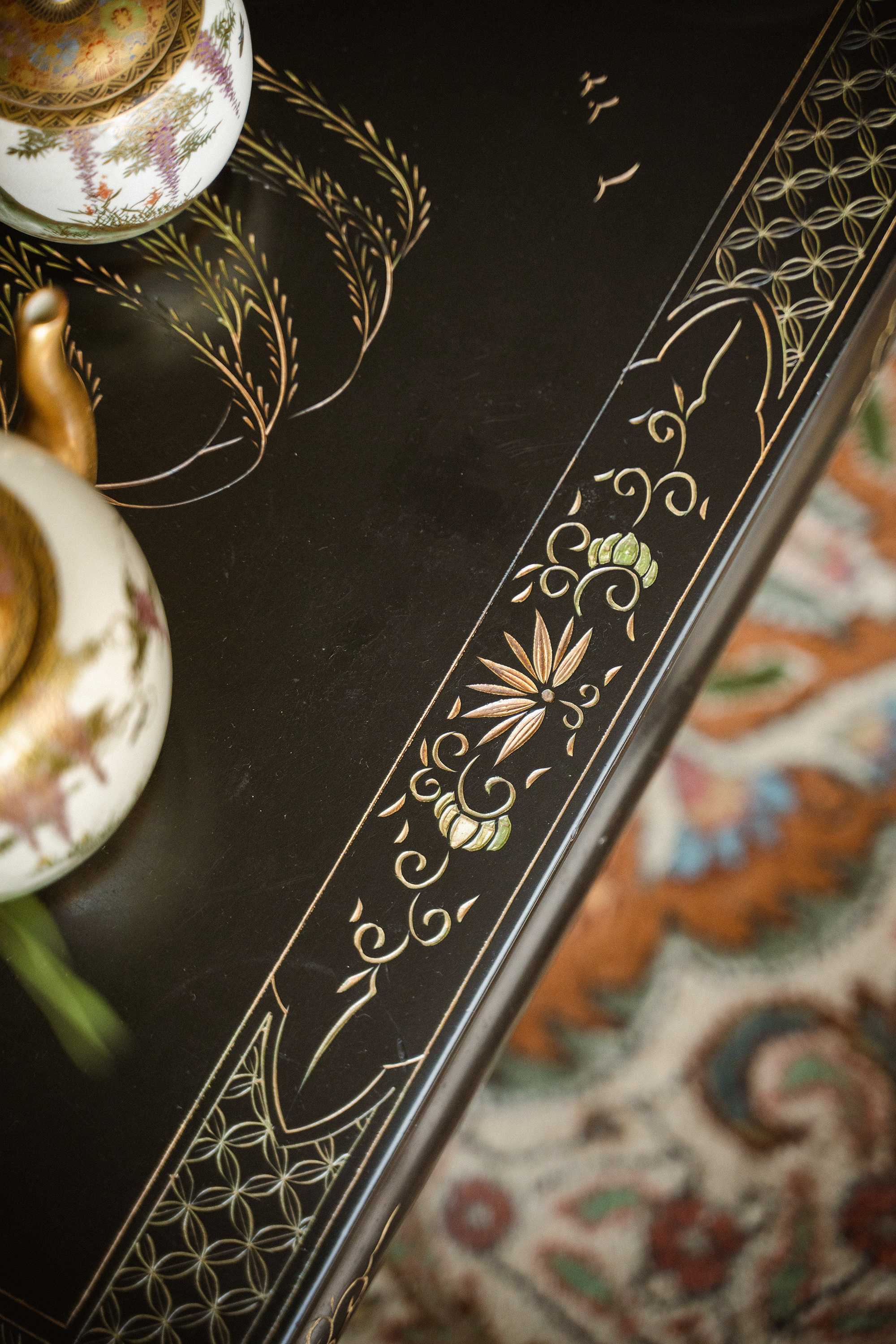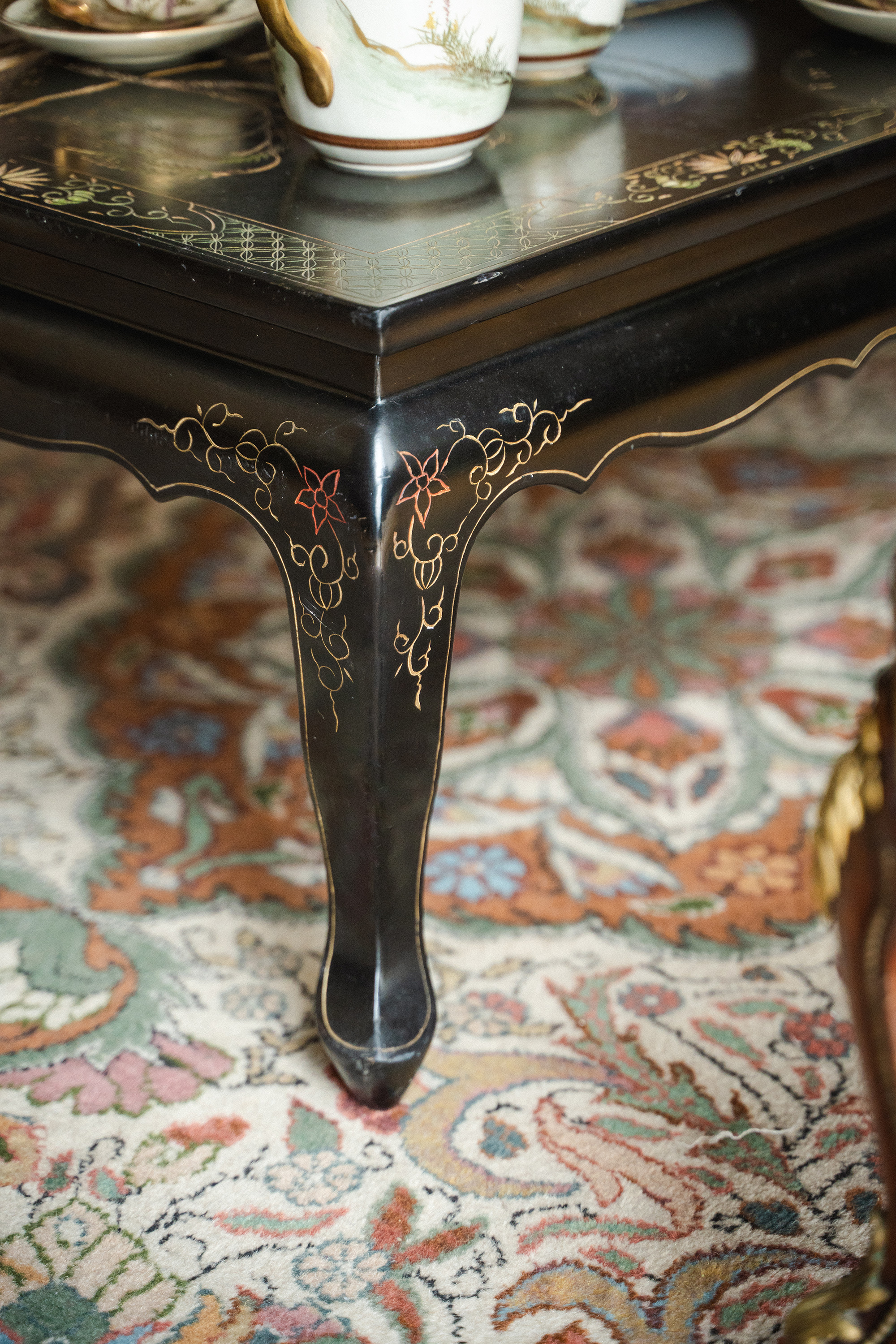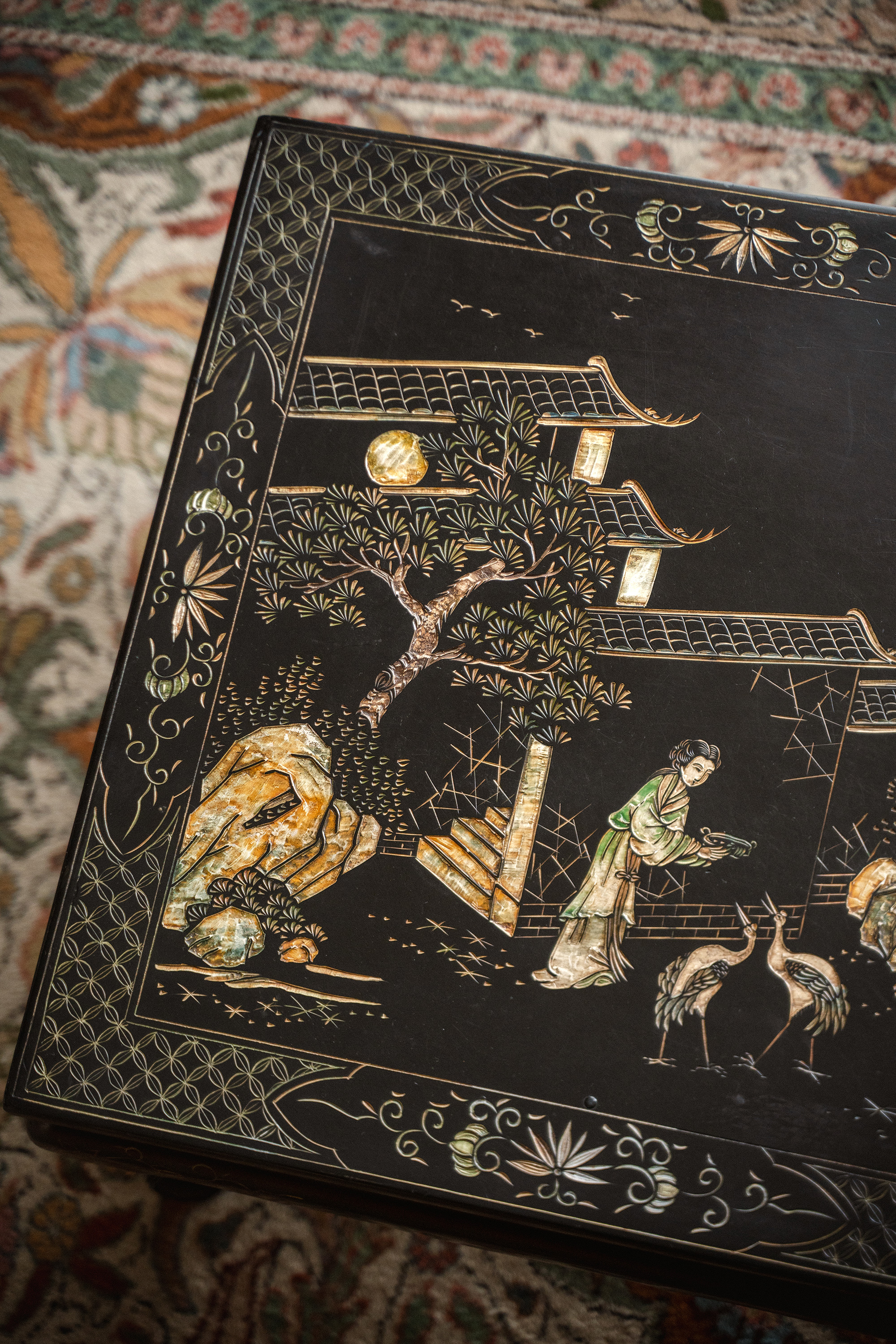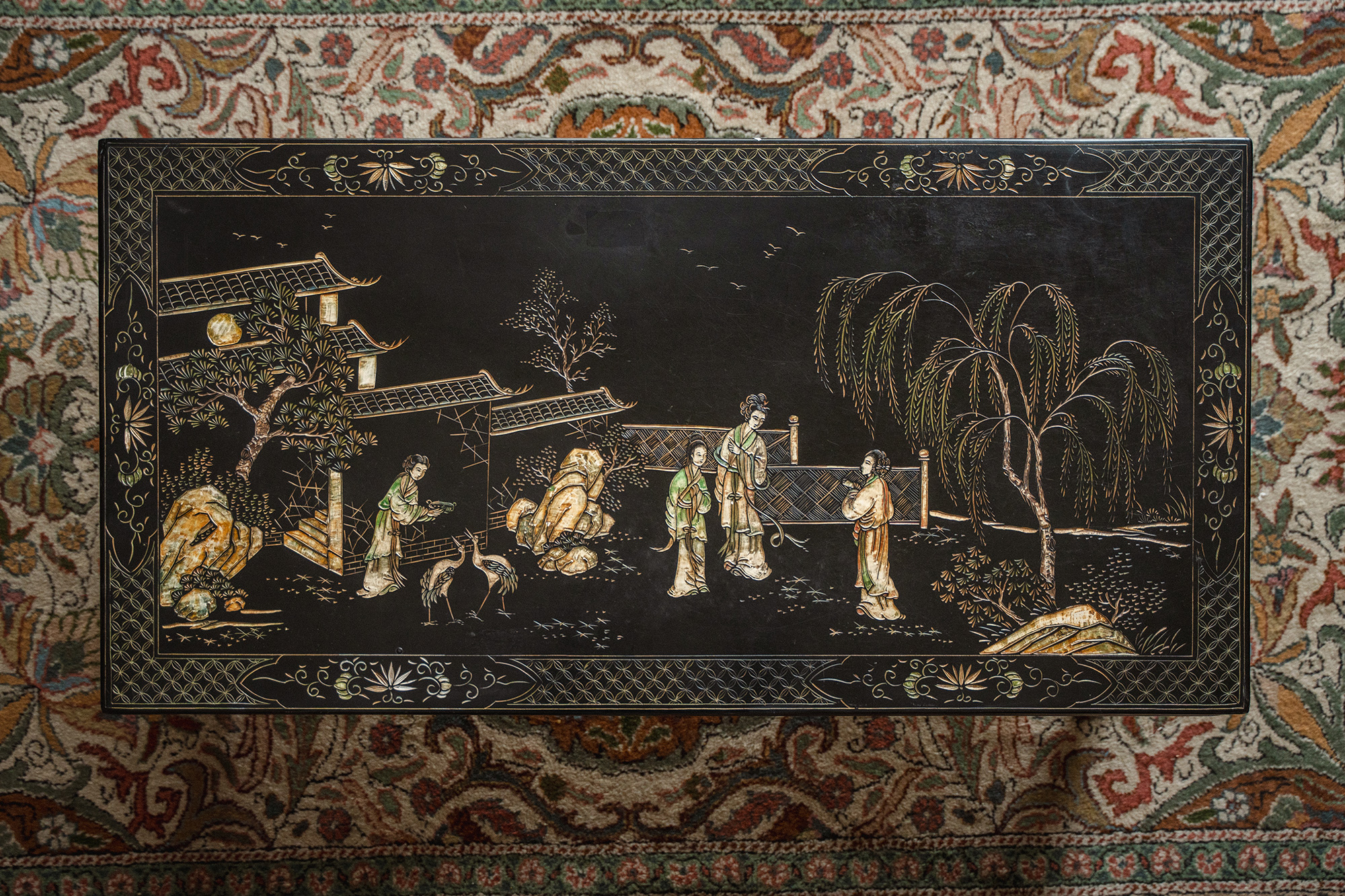 20世纪初中国出品黑漆描金款彩人物园林主题长方矮桌几