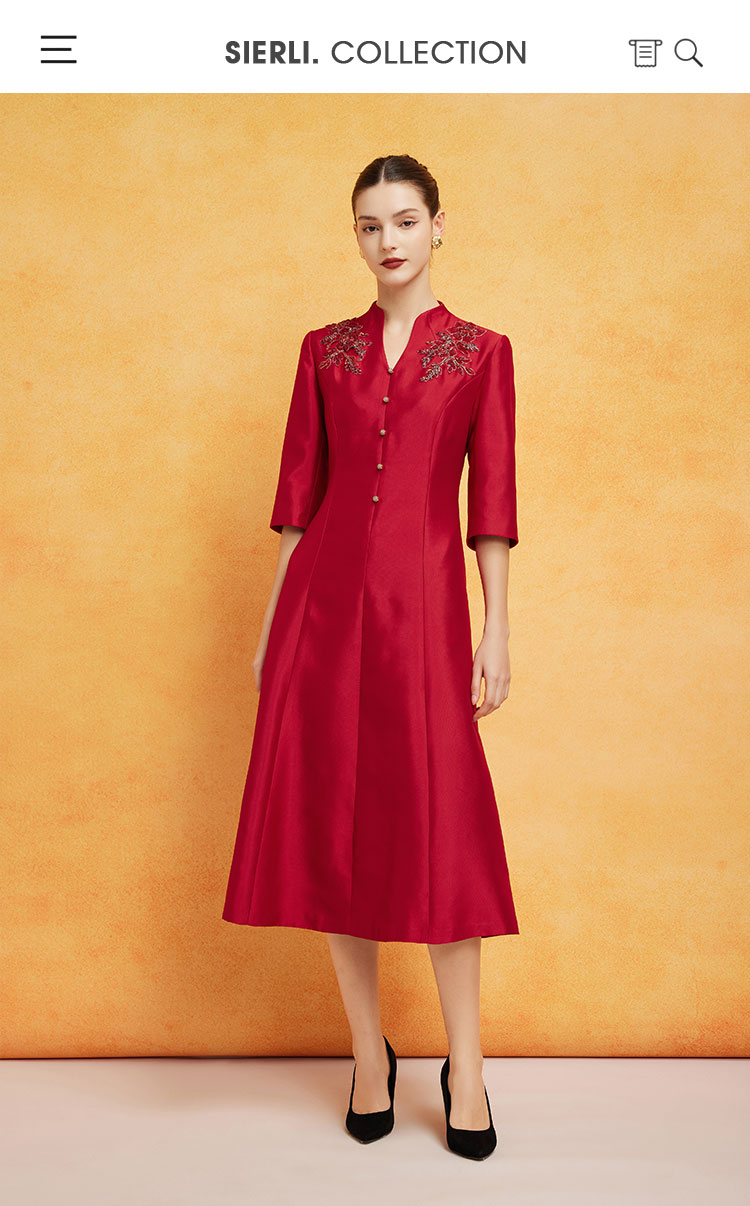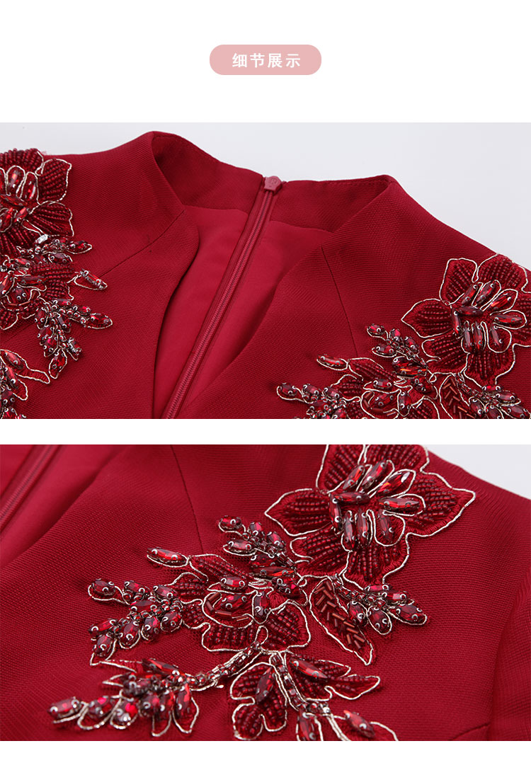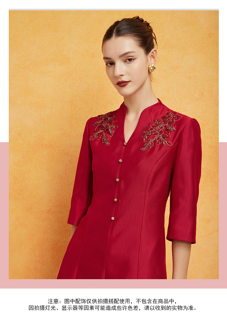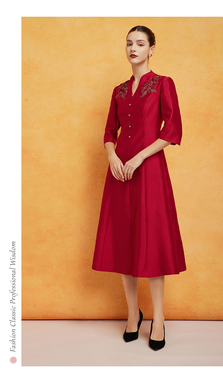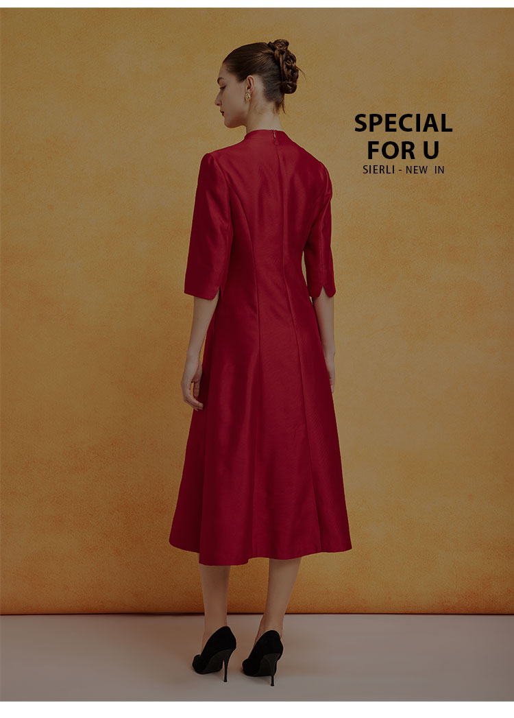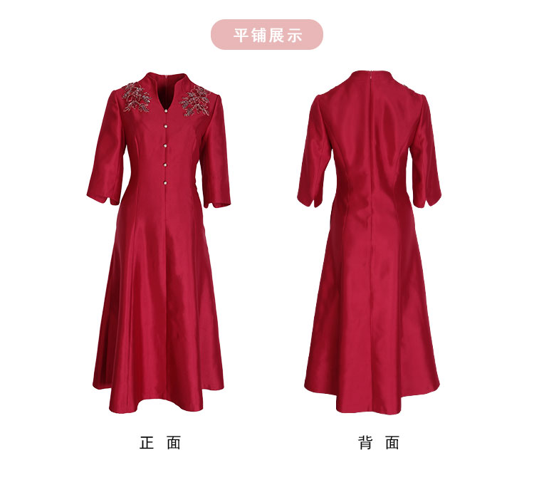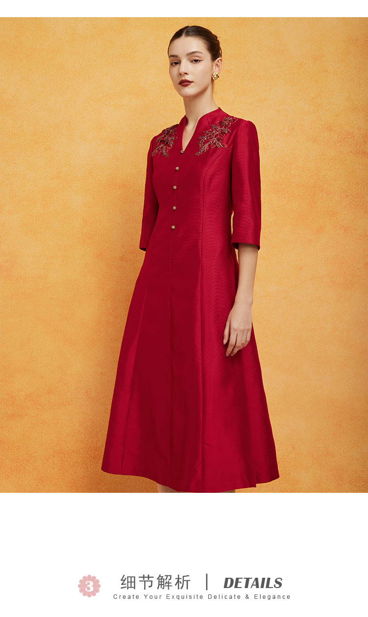 PF8F4斯尔丽2024新款立体钉珠宴会着装丝毛质感七分袖放摆中长连衣裙