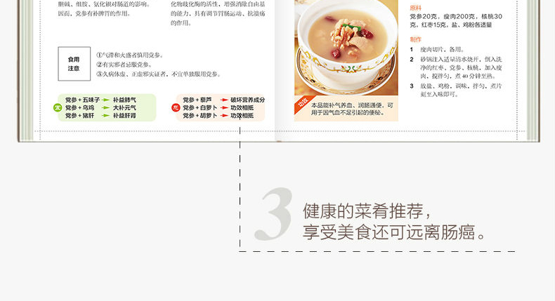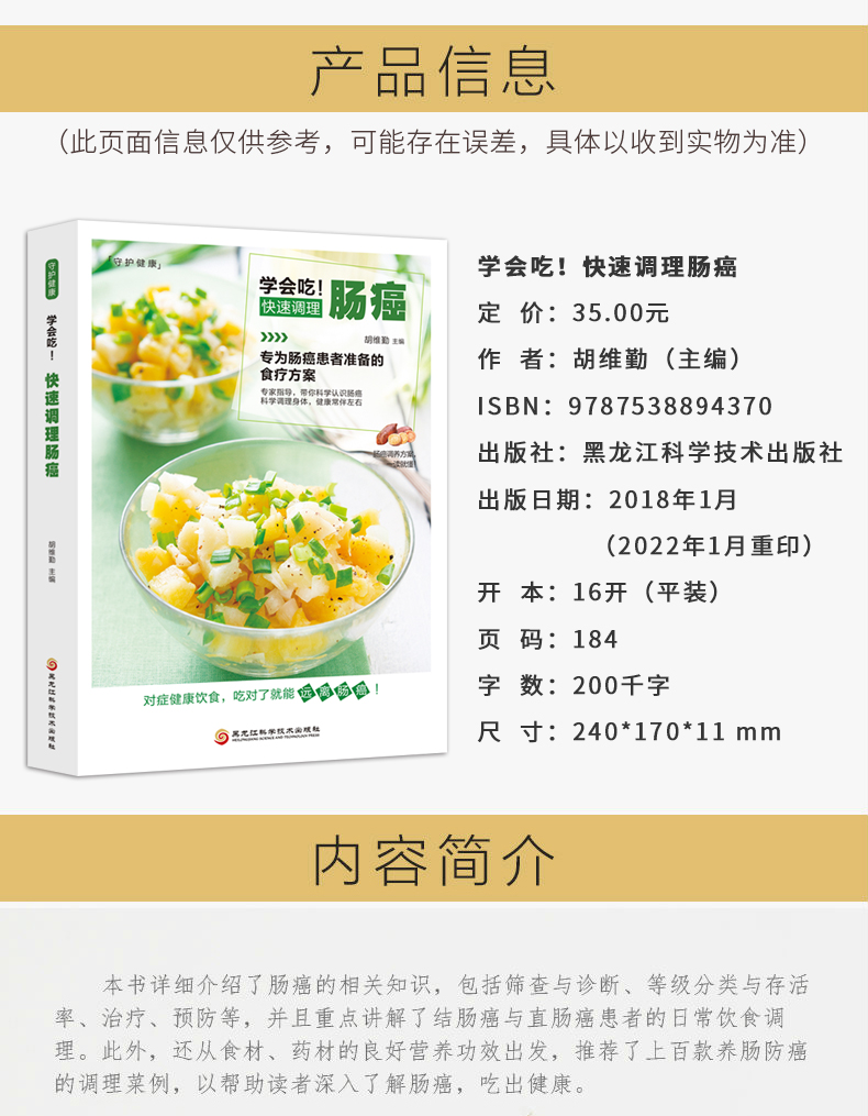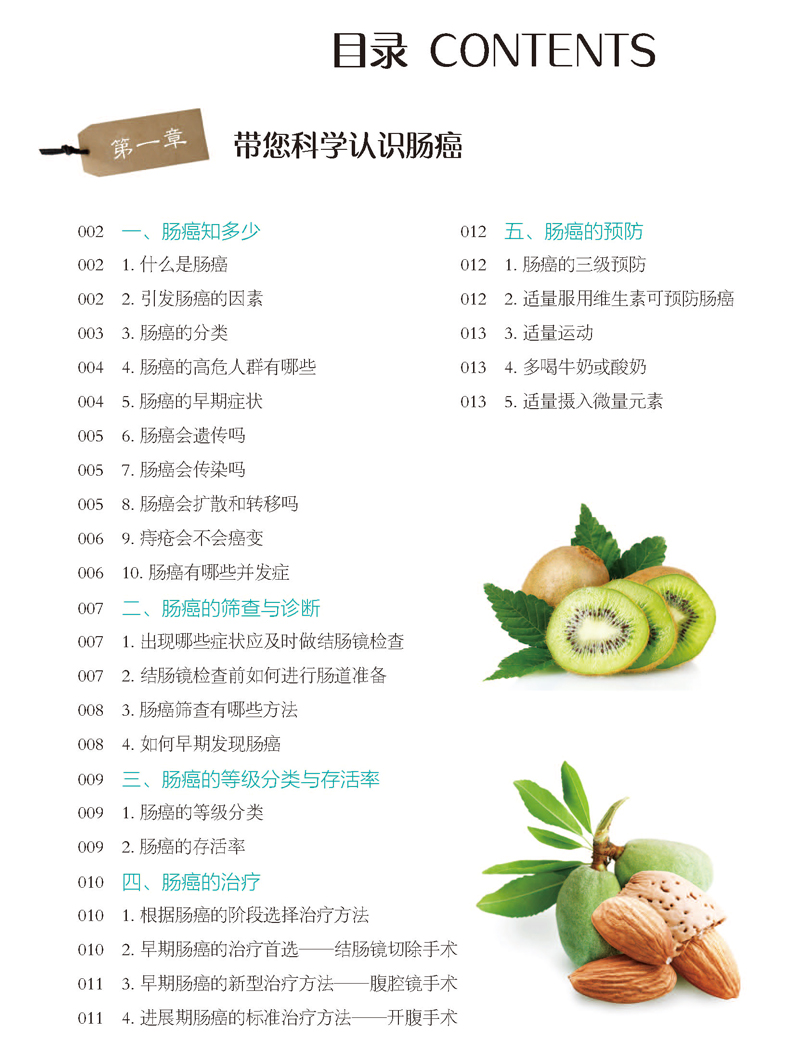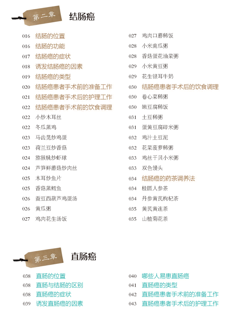 | 第一章 带您科学认识肠癌 002 一、肠癌知多少 002 1. 什么是肠癌 002 2. 引发肠癌的因素 003 3. 肠癌的分类 004 4. 肠癌的高危人群有哪些 004 5.肠癌的早期症状 005 6. 肠癌会遗传吗 005 7. 肠癌会传染吗 005 8. 肠癌会扩散和转移吗 006 9. 痔疮会不会癌变 006 10. 肠癌有哪些并发症 007 二、肠癌的筛查与诊断 007 1. 出现哪些症状应及时做结肠镜检查 007 2. 结肠镜检查前如何进行肠道准备 008 3.肠癌筛查有哪些方法 008 4. 如何早期发现肠癌 009 三、肠癌的等级分类与存活率 009 1. 肠癌的等级分类 009 2.肠癌的存活率 010 四、肠癌的治疗 010 1. 根据肠癌的阶段选择治疗方法 010 2. 早期肠癌的治疗首选—结肠镜切除手术 011 3. 早期肠癌的新型治疗方法—腹腔镜手术 011 4. 进展期肠癌的标准治疗方法—开腹手术 012 五、肠癌的预防 012 1. 肠癌的三级预防 012 2. 适量服用维生素可预防肠癌 013 3. 适量运动 013 4. 多喝牛奶或酸奶 013 5. 适量摄入微量元素 第二章 结肠癌 016 结肠的位置 016 结肠的功能 017 结肠癌的症状 018 诱发结肠癌的因素 019 结肠癌的类型 020 结肠癌患者手术前的准备工作 021 结肠癌患者手术后的护理工作 022 结肠癌患者手术前的饮食调理 022 小炒木耳丝 022 冬瓜蒸鸡 023 马齿苋炒鸡蛋 023 荷兰豆炒香菇 024 猕猴桃炒虾球 024 芦笋鲜蘑菇炒肉丝 025 木耳炒鱼片 025 香菇蒸鳕鱼 026 葱油南瓜 026 白萝卜粉丝汤 027 猴头菇煲鸡汤 027 海藻海带瘦肉汤 028 香菇炖竹荪 028 豆腐紫菜鲫鱼汤 029 木瓜草鱼汤 029 白萝卜汤 030 蚕豆西葫芦鸡蛋汤 030 黄瓜粥 031 鸡肉花生汤饭 031 鸡肉口蘑稀饭 032 小米南瓜粥 032 香菇蛋花油菜粥 033 小米黄豆粥 033 花生银耳牛奶 034 结肠癌患者手术后的饮食调理 034 清淡米汤 034 西红柿米汤 035 藕粉糊 035 苹果奶昔 036 橘子蔬菜果汁 036 萝卜莲藕牛奶汁 037 酸甜莲藕橙子汁 037 糯米稀粥 038 卷心菜稀粥 038 嫩豆腐稀饭 039 土豆稀粥 039 蛋黄豆腐碎米粥 040 鸡汁土豆泥 040 花菜菠萝稀粥 041 鸡丝干贝小米粥 041 双色馒头 042 结肠癌的药茶调养法 042 桂圆人参茶 042 丹参黄芪枸杞茶 043 黄芪黄连茶 043 山楂菊花茶 第三章 直肠癌 046 直肠的位置 046 直肠与结肠的区别 046 直肠癌的症状 047 诱发直肠癌的因素 048 哪些人易患直肠癌 049 直肠癌的类型 050 直肠癌患者手术前的准备工作 051 直肠癌患者手术后的护理工作 052 直肠癌患者手术前的饮食调理 052 玉子虾仁 052 清炒时蔬鲜虾 053 滑蛋牛肉 053 浇汁草鱼片 054 鳕鱼蒸鸡蛋 054 黄瓜肉丝 055 豆腐蒸鹌鹑蛋 055 核桃瘦肉汤 056 香菇大米粥 056 青橄榄鸡汤 057 虾米白菜豆腐汤 057 牛肉南瓜汤 058 木瓜银耳炖鹌鹑蛋 058 白芍山药鸡汤 059 鸭血鲫鱼汤 059 芸豆平菇牛肉汤 060 菊花枸杞瘦肉粥 060 奶香燕麦粥 061 虾仁蔬菜稀饭 061 鲜虾木耳芹菜粥 062 直肠癌患者手术后的饮食调理 062 三色米汤 062 蔬菜米汤 063 西红柿稀粥 063 白萝卜稀粥 064 苹果柳橙稀粥 064 土豆碎米糊 065 哈密瓜南瓜稀粥 065 鸡肉卷心菜米粥 066 鸡蛋燕麦糊 066 鸡蛋西红柿粥 067 适合直肠癌患者的药茶调养法 067 桂圆核桃茶 067 山楂陈皮茶 068 山楂桂圆红枣茶 068 肉桂茶 069 丁香绿茶 069 山楂四味饮 第四章 挑对食材,养肠防癌很轻松 072 莲藕 073 芦笋炒莲藕 073 花生莲藕绿豆汤 074 白菜 075 醋溜白菜片 075 白菜豆腐肉丸汤 076 包菜 077 炝拌包菜 077 包菜炒肉丝 078 花菜 079 丝瓜烧花菜 079 火腿花菜 080 西蓝花 081 素拌西蓝花 081 木耳鸡蛋西蓝花 082 油菜 083 虾菇油菜心 083 玉米油菜汤 084 芹菜 085 凉拌嫩芹菜 085 芹菜炒蛋 086 茄子 087 鱼香茄子烧四季豆 087 茄子泥 088 紫甘蓝 089 甜椒紫甘蓝拌木耳 089 醋熘紫甘蓝 090 韭菜 091 松仁炒韭菜 091 韭菜炒核桃仁 092 菠菜 093 胡萝卜炒菠菜 093 菠菜干贝脊骨汤 094 洋葱 095 豆芽拌洋葱 095 洋葱炒黄鳝 096 胡萝卜 097 胡萝卜丝炒豆芽 097 胡萝卜炒牛肉 098 白萝卜 099 红烧白萝卜 099 橄榄白萝卜排骨汤 100 南瓜 101 西芹炒南瓜 101 红枣南瓜麦片粥 102 土豆 103 芝麻土豆丝 103 口蘑焖土豆 104 西红柿 105 西红柿土豆炖牛肉 105 西红柿猪肚汤 106 莴笋 107 蒜苗炒莴笋 107 莴笋烧板栗 108 芦笋 109 芦笋金针 109 芦笋煨冬瓜 110 竹笋 111 竹笋炒鳝段 111 韭菜拌竹笋 112 香菇 113 胡萝卜炒香菇片 113 干焖香菇 114 金针菇 115 鲜鱿鱼炒金针菇 115 金针菇冬瓜汤 116 猴头菇 117 猴头菇扒上海青 117 猴头菇炖排骨 118 银耳 119 百合枇杷炖银耳 119 紫薯百合银耳羹 120 黑木耳 121 小炒黑木耳丝 121 木耳山楂排骨粥 122 豆腐 123 胡萝卜丝烧豆腐 123 白菜豆腐鸭架汤 124 鸡蛋 125 佛手瓜炒鸡蛋 125 黄花菜鸡蛋汤 126 羊肉 127 羊肉山药粥 127 清炖羊肉汤 128 鸡肉 129 百合炒鸡丝 129 白灵菇炒鸡丁 130 牛肉 131 西蓝花炒牛肉 131 萝卜炖牛肉 132 猪肚 133 黄花菜猪肚汤 133 银杏腐竹猪肚煲 134 鲫鱼 135 山药蒸鲫鱼 135 黄花菜鲫鱼汤 136 海带 137 蛤蜊豆腐炖海带 137 海带虾米排骨汤 138 海参 139 葱爆海参 139 鲍汁海参 140 小米 141 紫薯桂圆小米粥 141 枣仁蜂蜜小米粥 142 荞麦 143 荞麦大米豆浆 143 竹叶荞麦绿豆粥 144 玉米 145 杏鲍菇炒鲜玉米 145 苹果玉米粥 146 绿豆 147 冬瓜莲子绿豆粥 147 马齿苋绿豆汤 148 红小豆 149 莲藕海藻红豆汤 149 黑米红豆粥 150 花生 151 花生核桃糊 151 芡实花生红枣粥 152 杏仁 153 杏仁茶 153 杏仁拌茼蒿 154 核桃 155 核桃枸杞肉丁 155 莲子核桃桂圆粥 156 榛子 157 榛子小米粥 157 榛子腰果酸奶 158 