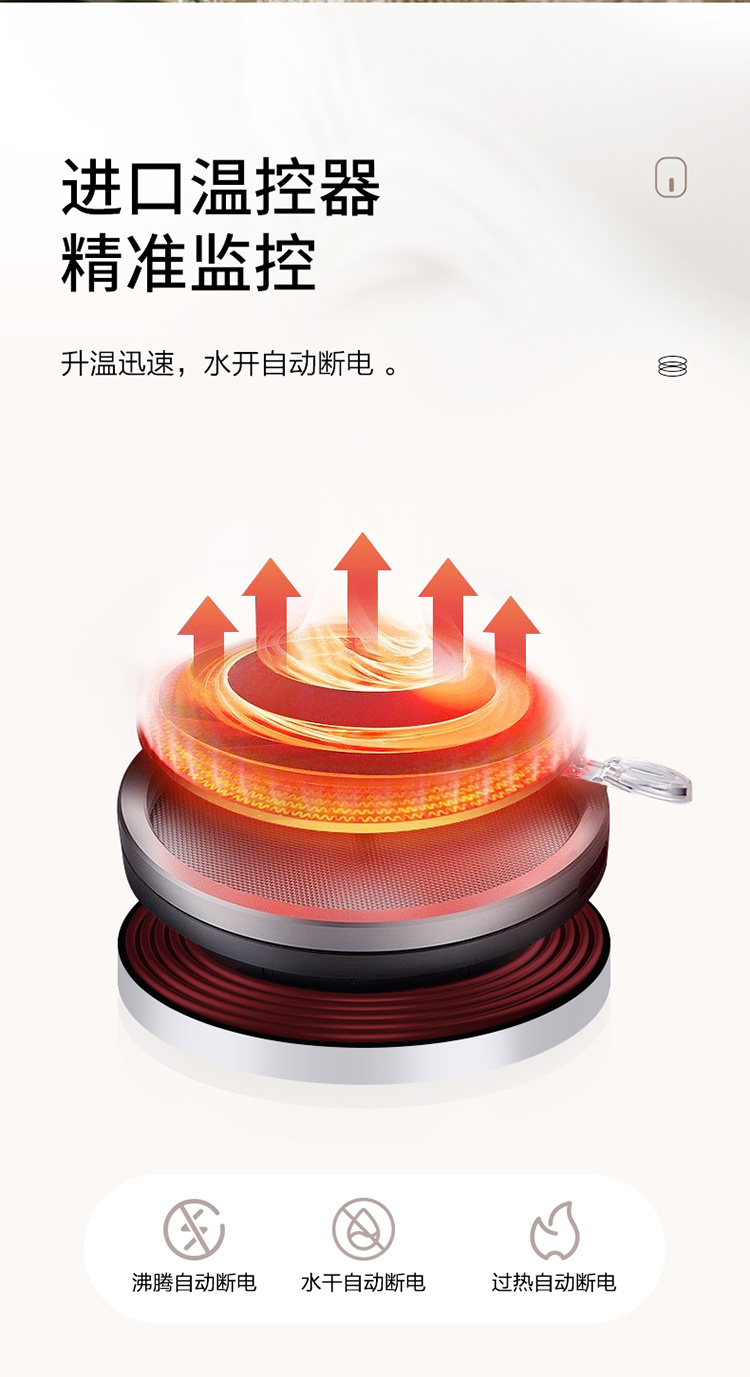 LED指示开关,夜间可见,按下即可烧水! 水开自动断电+水干自动断电+过热自动断电 安全性和实用性不用我多说了吧,直接拉满!