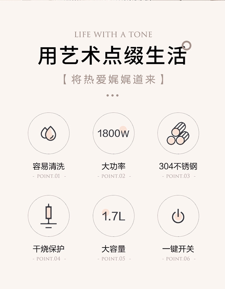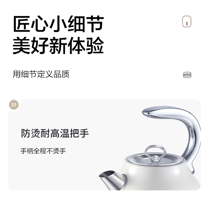 我的梦中情壶,一定要是颜值与实力均在线~ 所以除了颜值在线,在功能、产品细节设计上,这款电热水壶也足以打动人心。 壶身与发热盘都采用食品级304不锈钢材质,发热均匀、没有异味,安全健康。 1800w的大功率烧水,可以快速沸腾,五分钟就能喝到热水,主打一个速度!