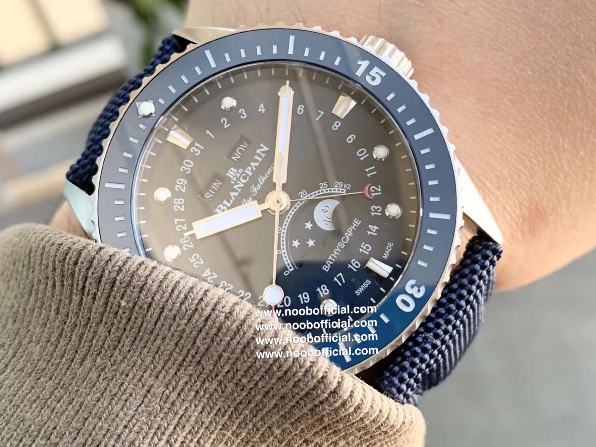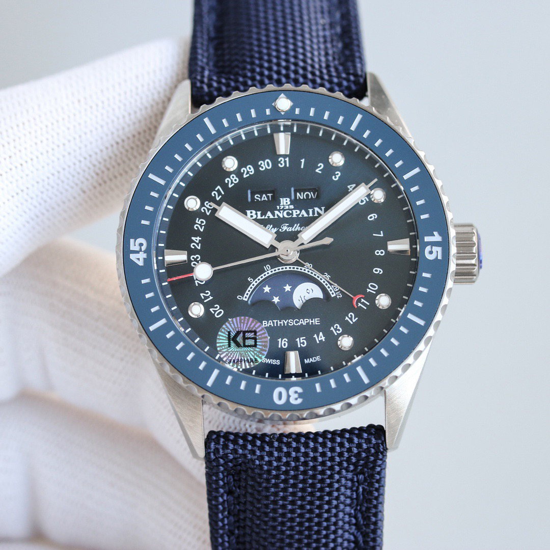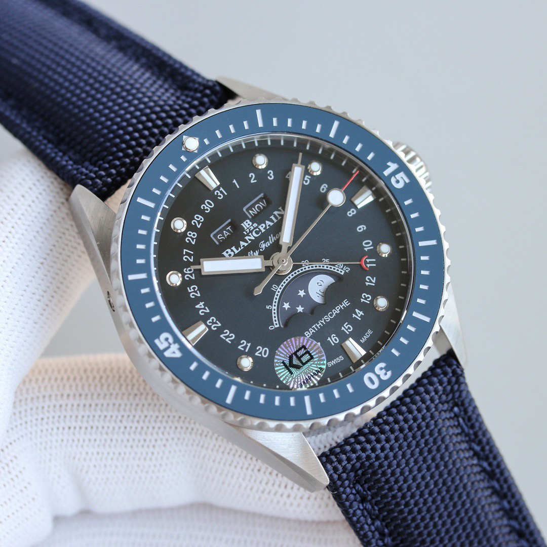 TW新力作 宝珀五十寻系列,5054-1110-B52A。压轴巨献,大三针夜光设计,直径43毫米!搭载6654.P自动机械机芯,具备星期显示,日期显示。月份显示,年份显示,月相显示