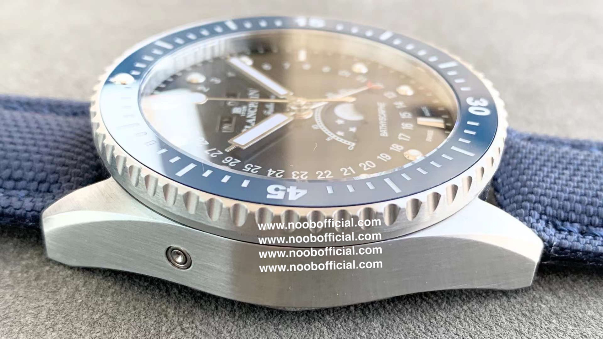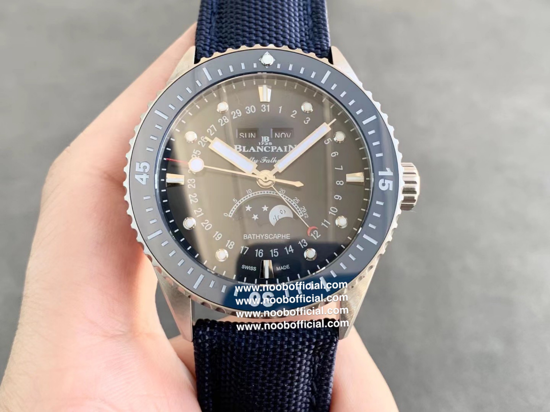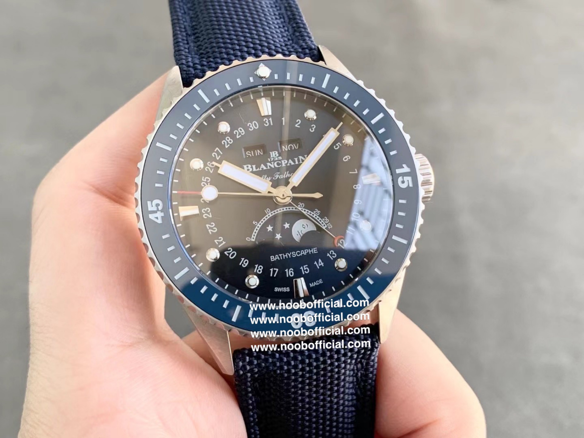 TW新力作 宝珀五十寻系列,5054-1110-B52A。压轴巨献,大三针夜光设计,直径43毫米!搭载6654.P自动机械机芯,具备星期显示,日期显示。月份显示,年份显示,月相显示