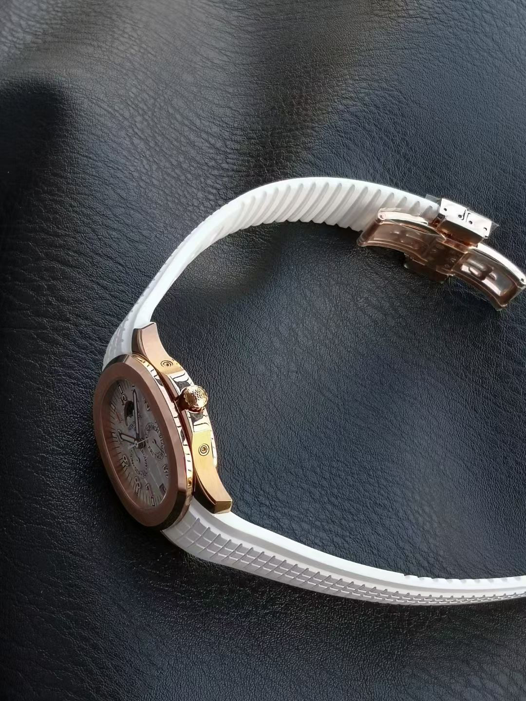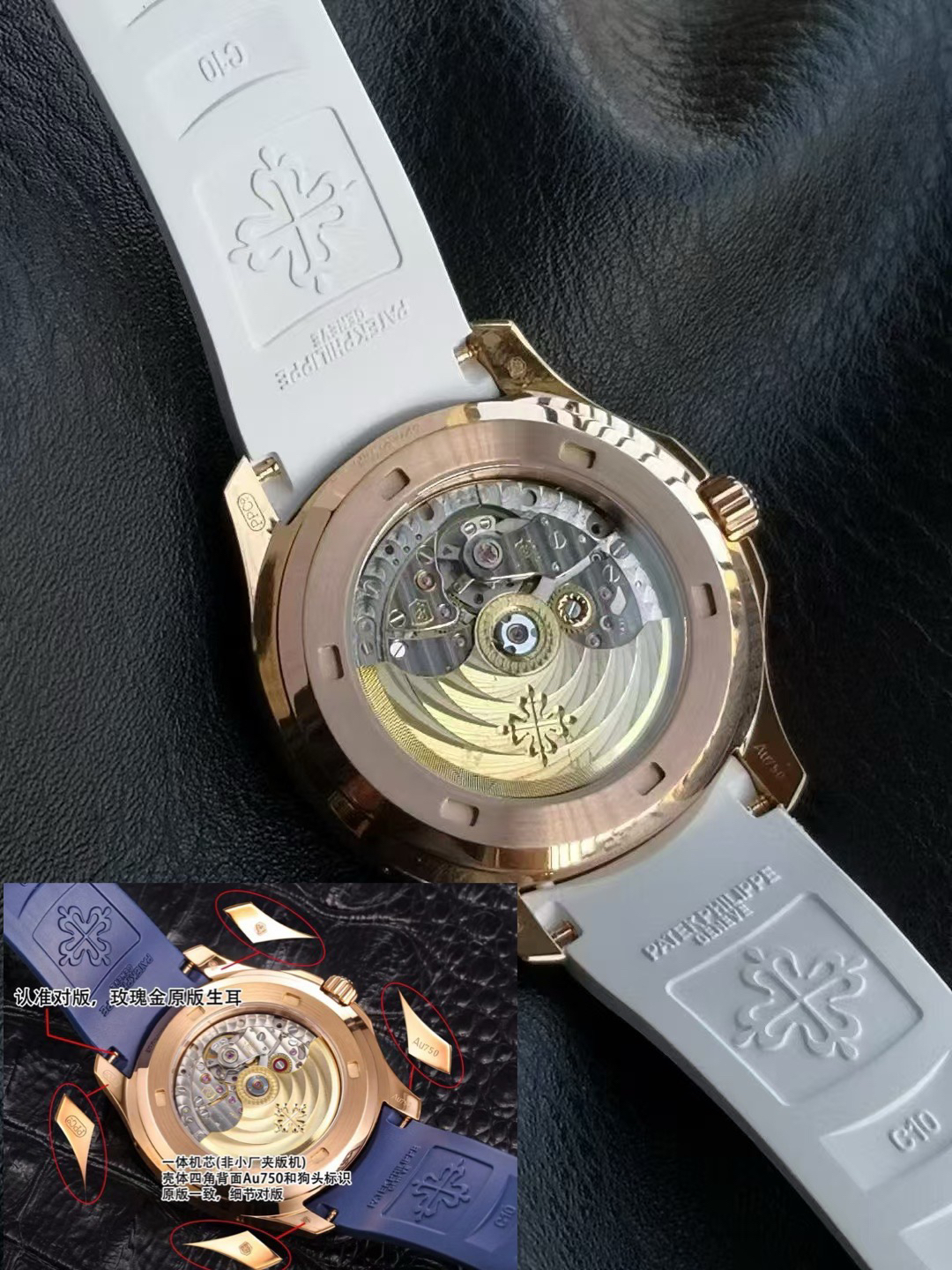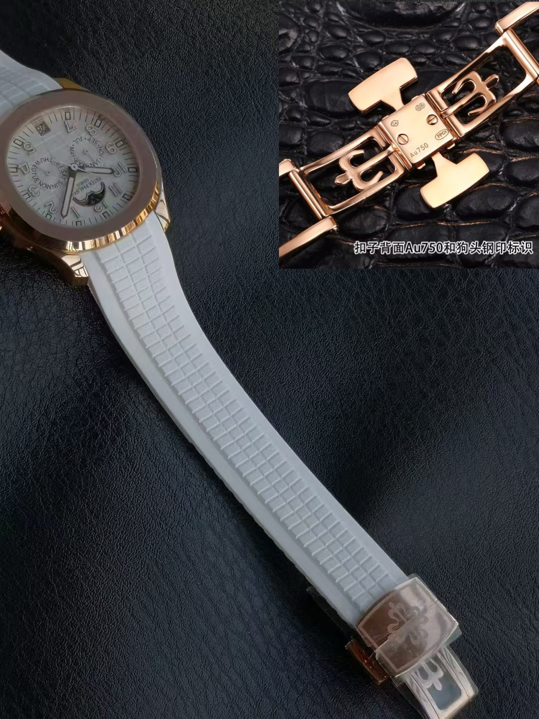 one ️⃣ The original version of the fluororubber strap is molded, comfortable to wear, and suitable for all day use. The customized fluororubber strap is soft and skin friendly, with upgraded wear resistance and durability; Folding clasp with one click adjustment, printed with clear precious metal identification marks on the back of the clasp, and featuring a St. Bernard dog head 🐶 Contour balance ⚖️ identification. Au750 digits PPC logo, sapphire glass, seamless transition between business and leisure, interpreting the wearing philosophy of "elegant and accompanying".