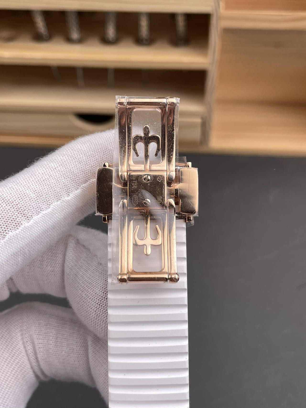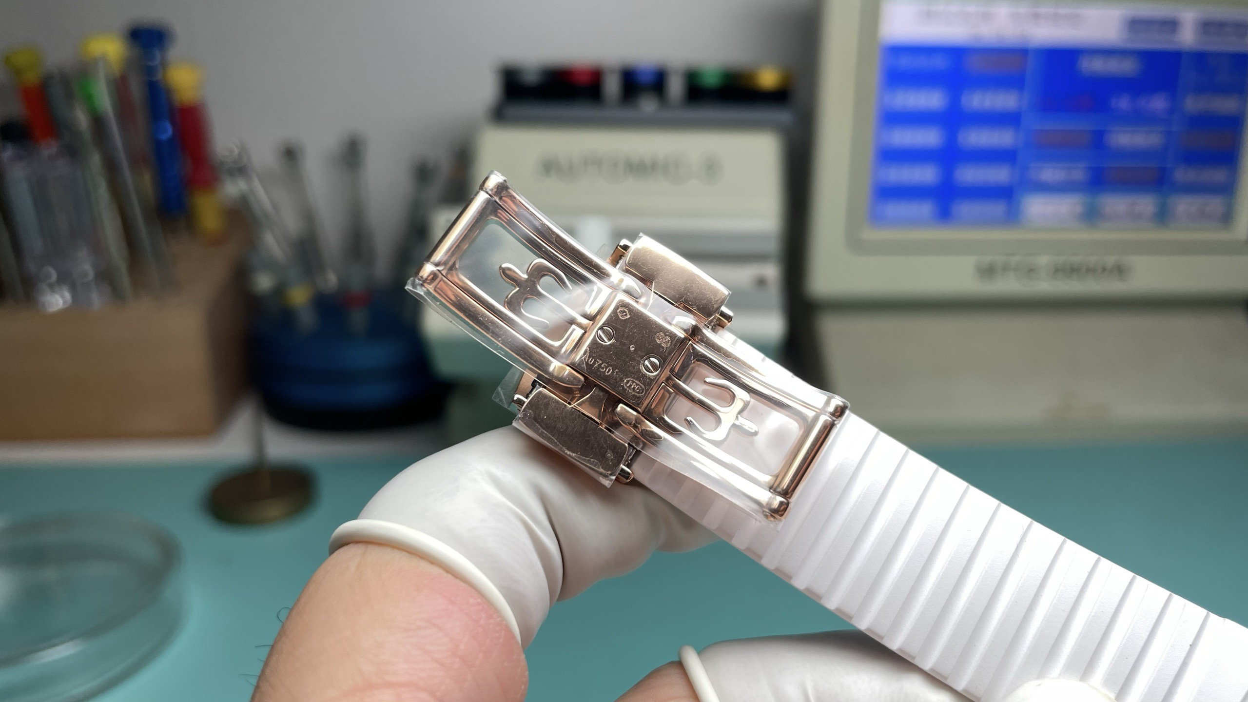 1️⃣ 原装对版氟橡胶带开模,舒适佩戴,全天适配,定制氟橡胶表带柔软亲肤,抗磨耐用性升级;折叠式表扣一键调节,扣子背面打印贵金属清晰标识印记,圣伯纳狗头🐶轮廓内天平⚖️标识.Au750数字.PPC标志,蓝宝石玻璃,商务休闲无缝切换,诠释“优雅随行”的佩戴哲学。