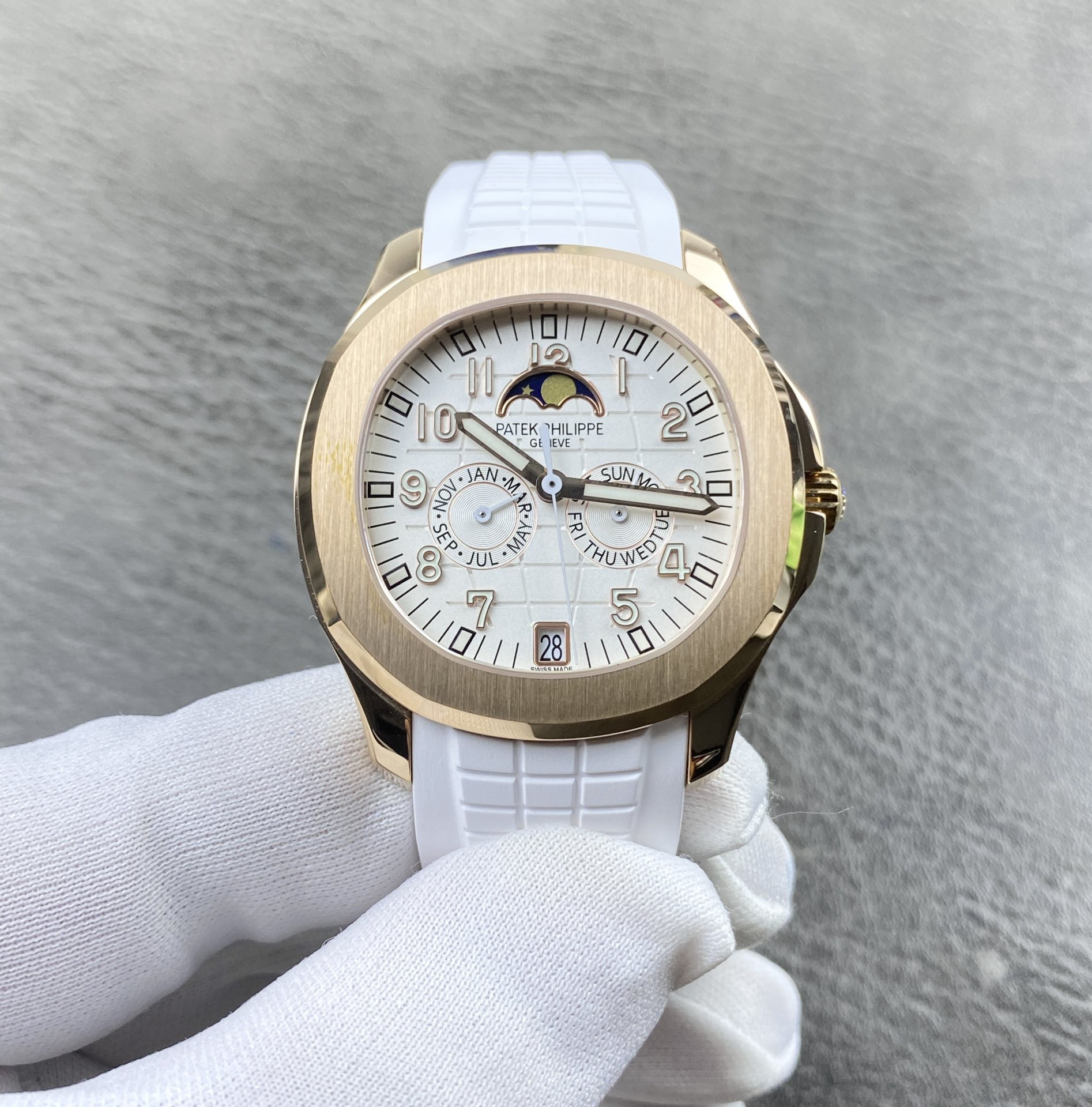 The case and bezel adopt the iconic circular octagonal shape, combined with contrasting polishing and satin processing. The gray blue dial and strap are adorned with Aquanaut relief patterns, Arabic lettering blocks, and Barton style hands, all coated with white fluorescent coating, making it easy to read at a glance. Identify the quality of PPF factory, one meter, one card, three codes in one