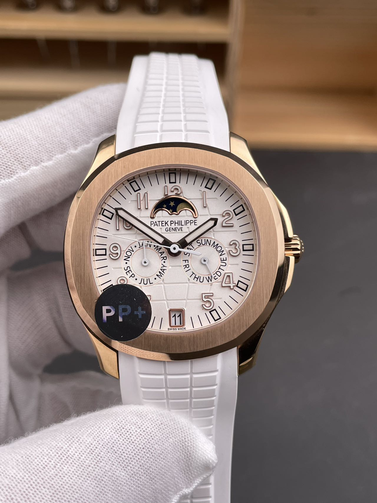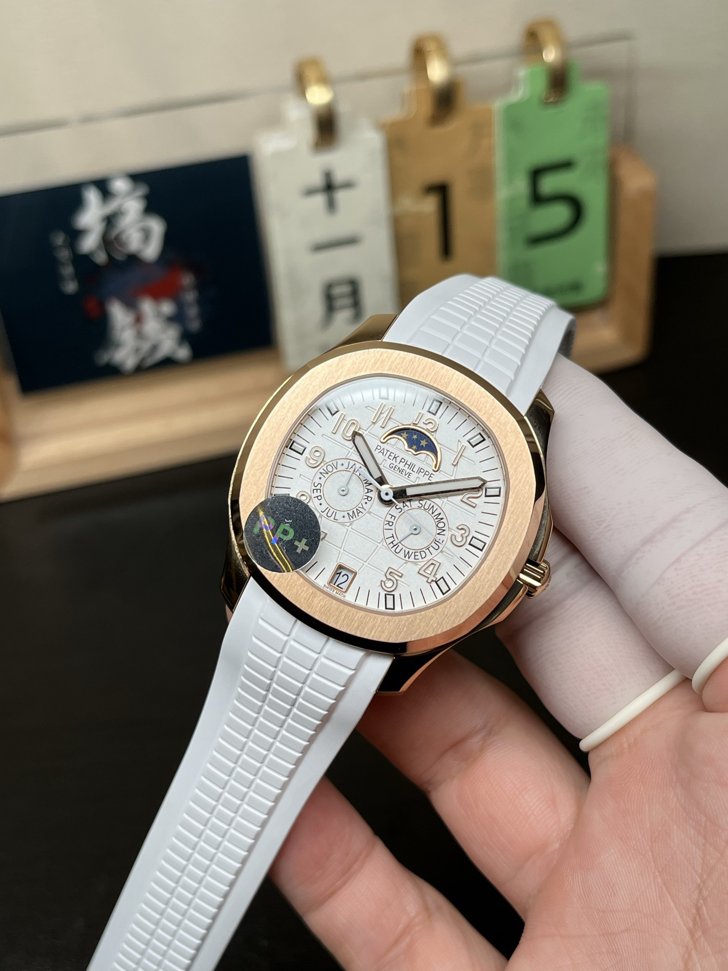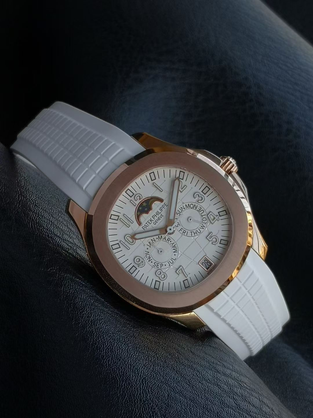 3️⃣ 智控时间:独创四窗分区显示系统(日期6点位/月相12点位,星期/月份3/9点位),告别调校繁琐,日常佩戴从容不迫,采用原装PP新式双按蝶扣,