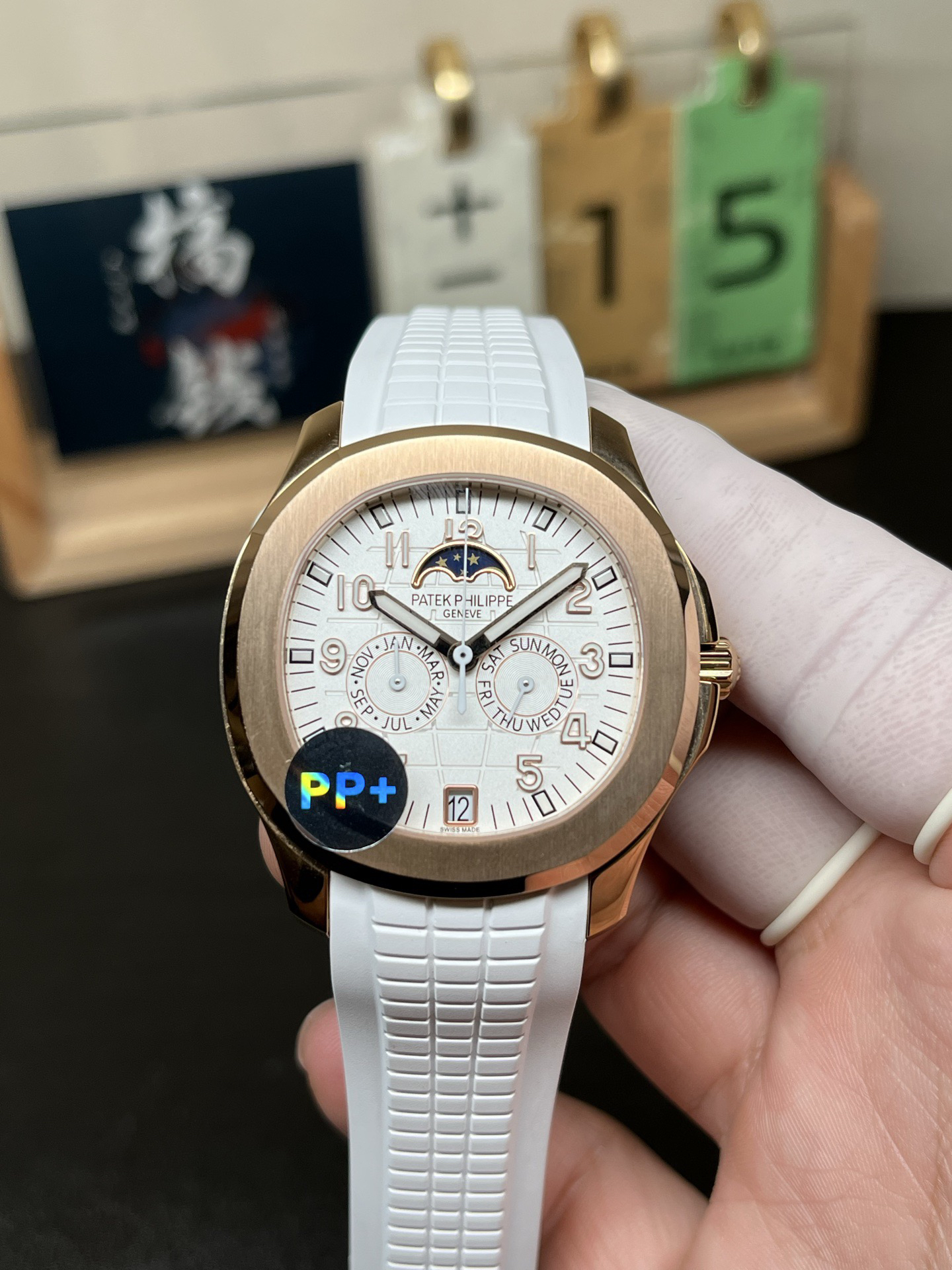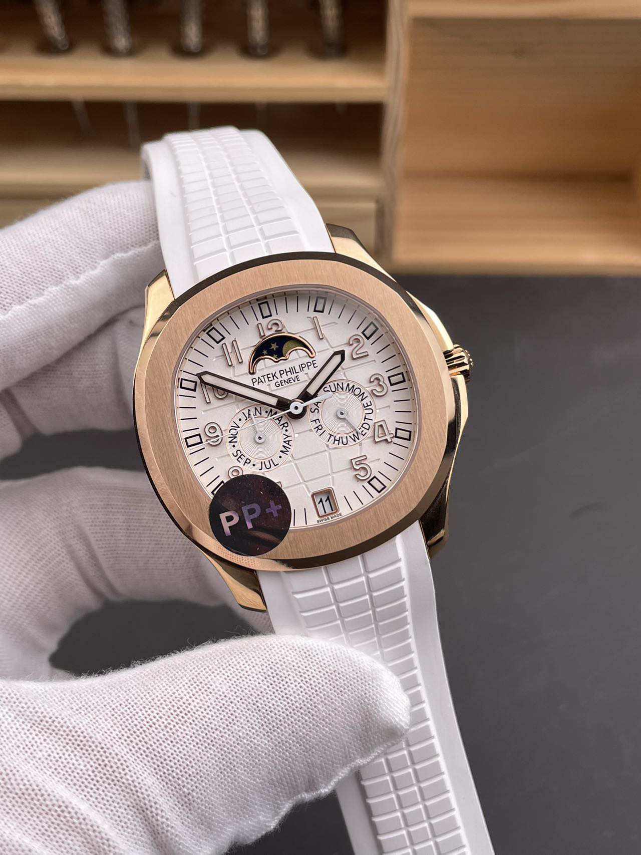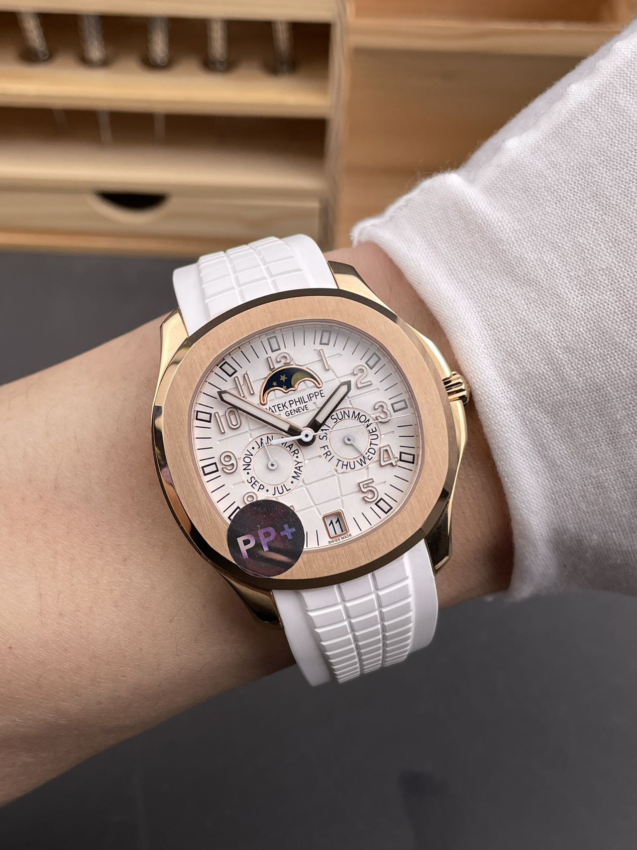 3️⃣ 智控时间:独创四窗分区显示系统(日期6点位/月相12点位,星期/月份3/9点位),告别调校繁琐,日常佩戴从容不迫,采用原装PP新式双按蝶扣,