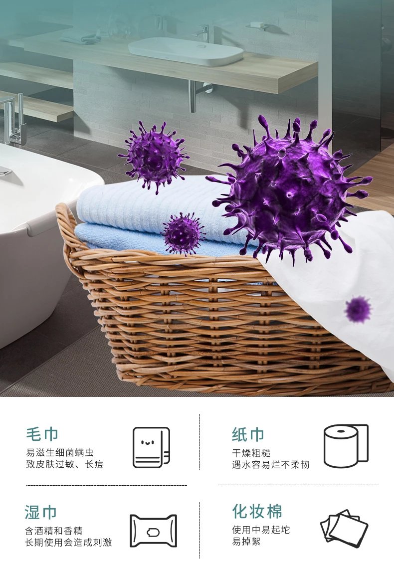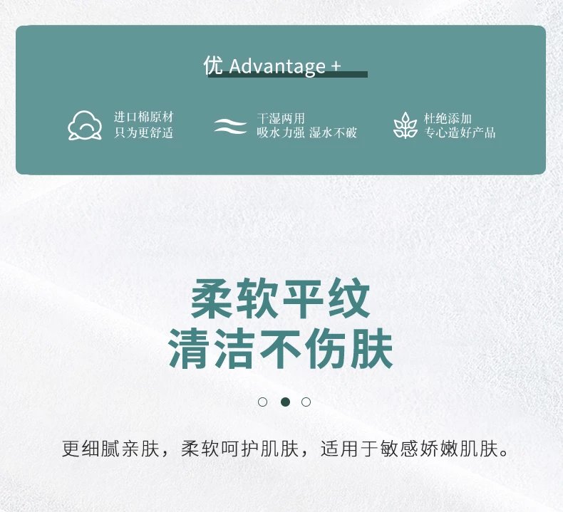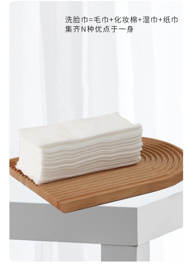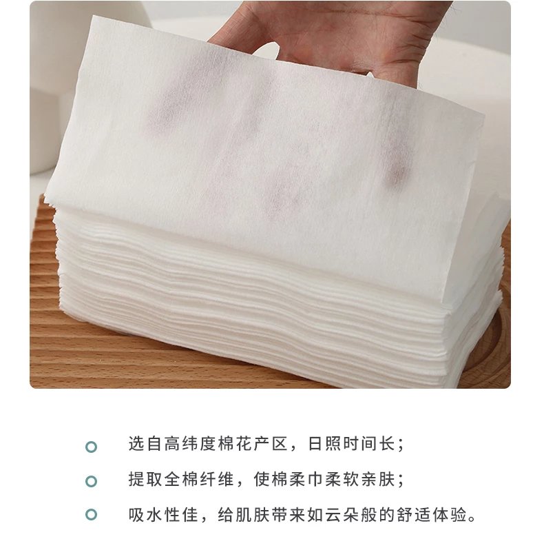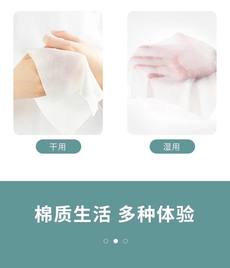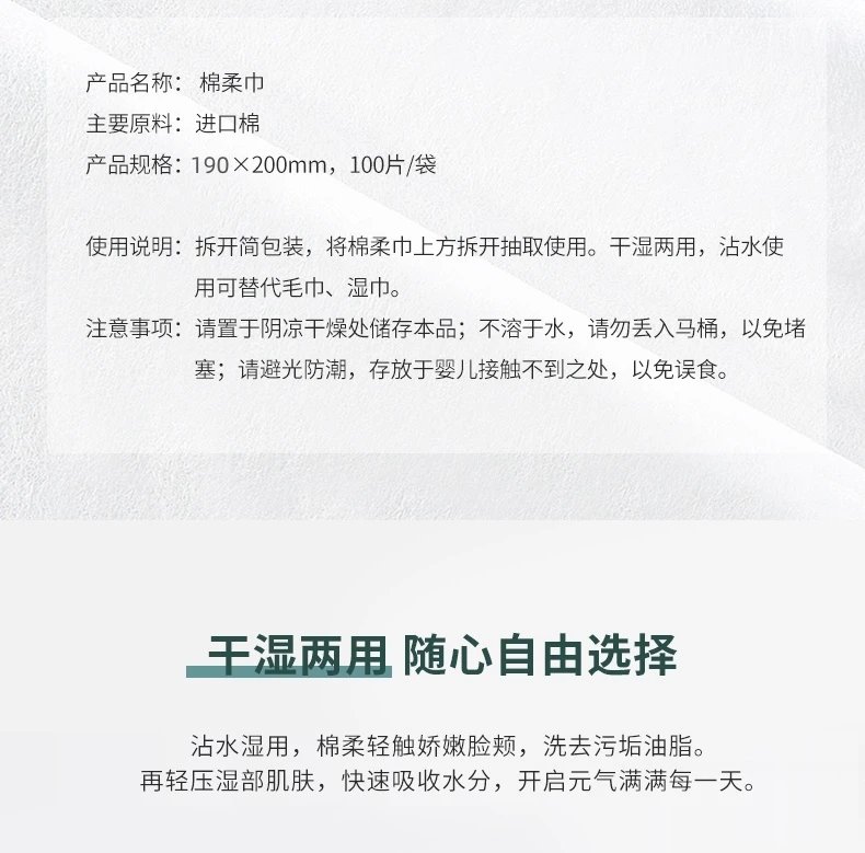 使用说明:拆开简包装,将棉柔巾上方拆开抽取使用。干湿两用,沾水使用可替代毛巾、湿巾。