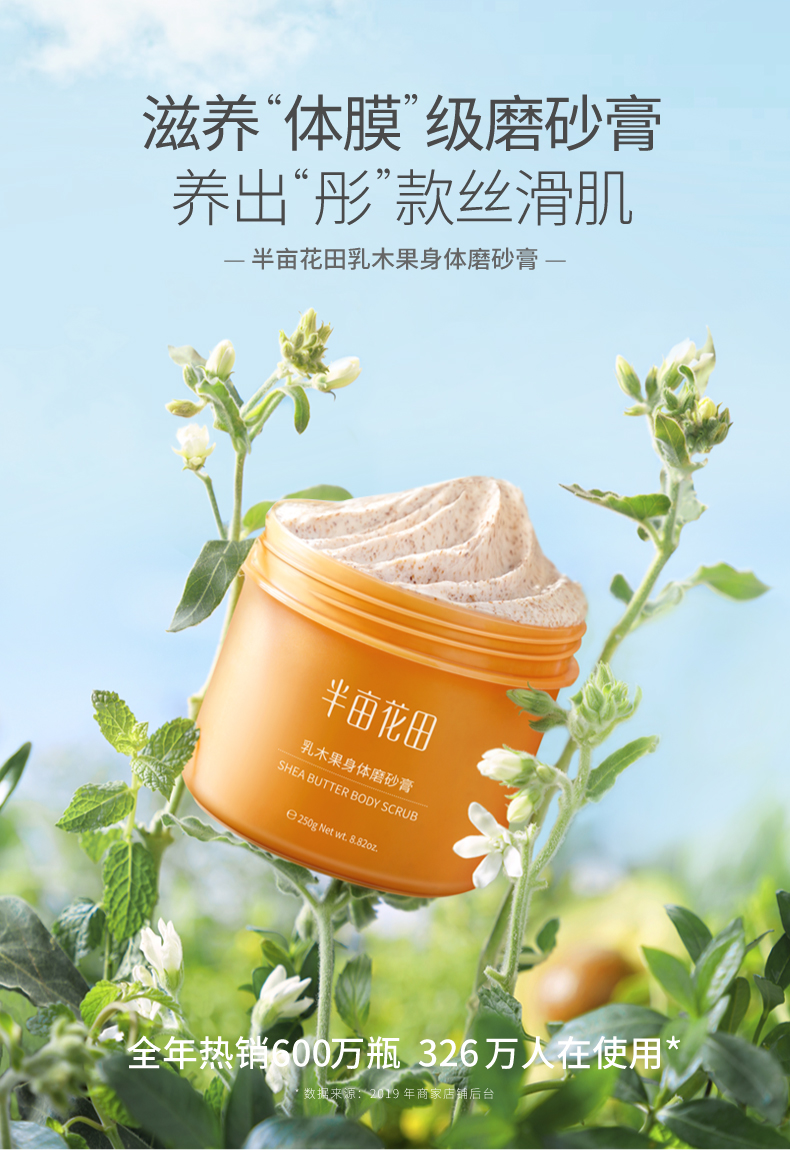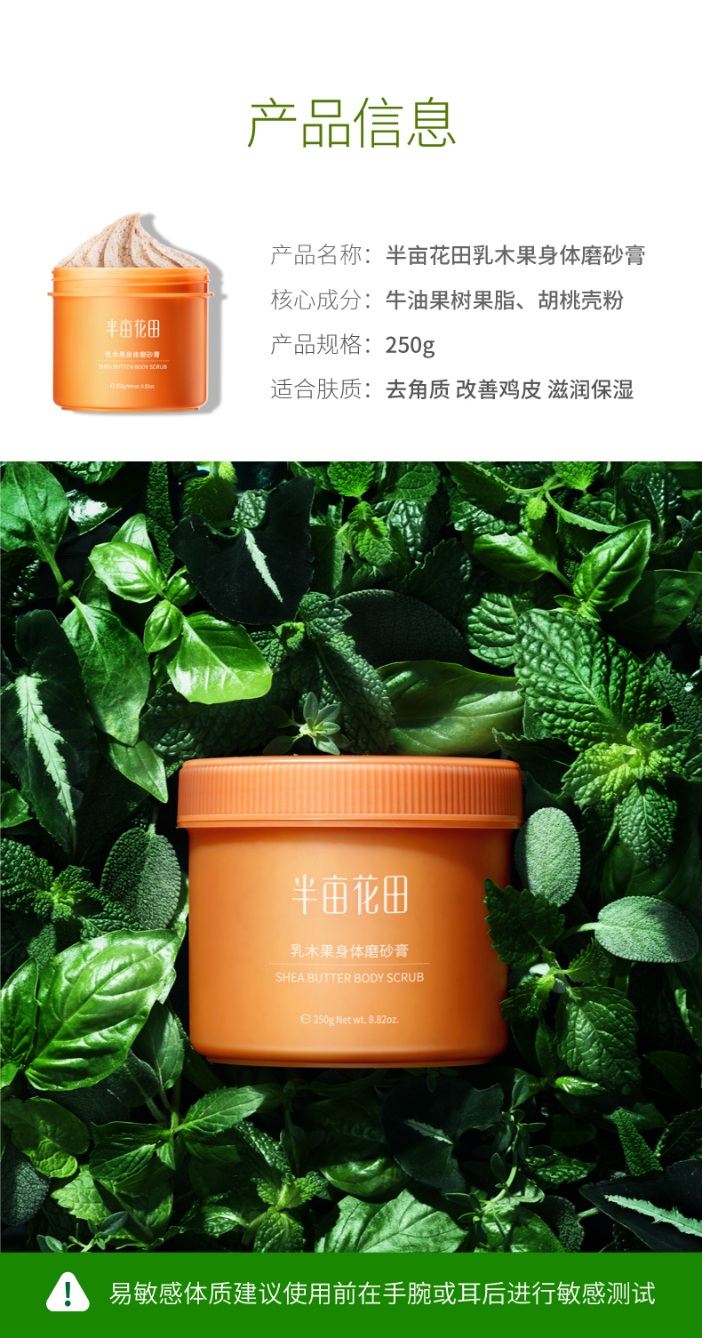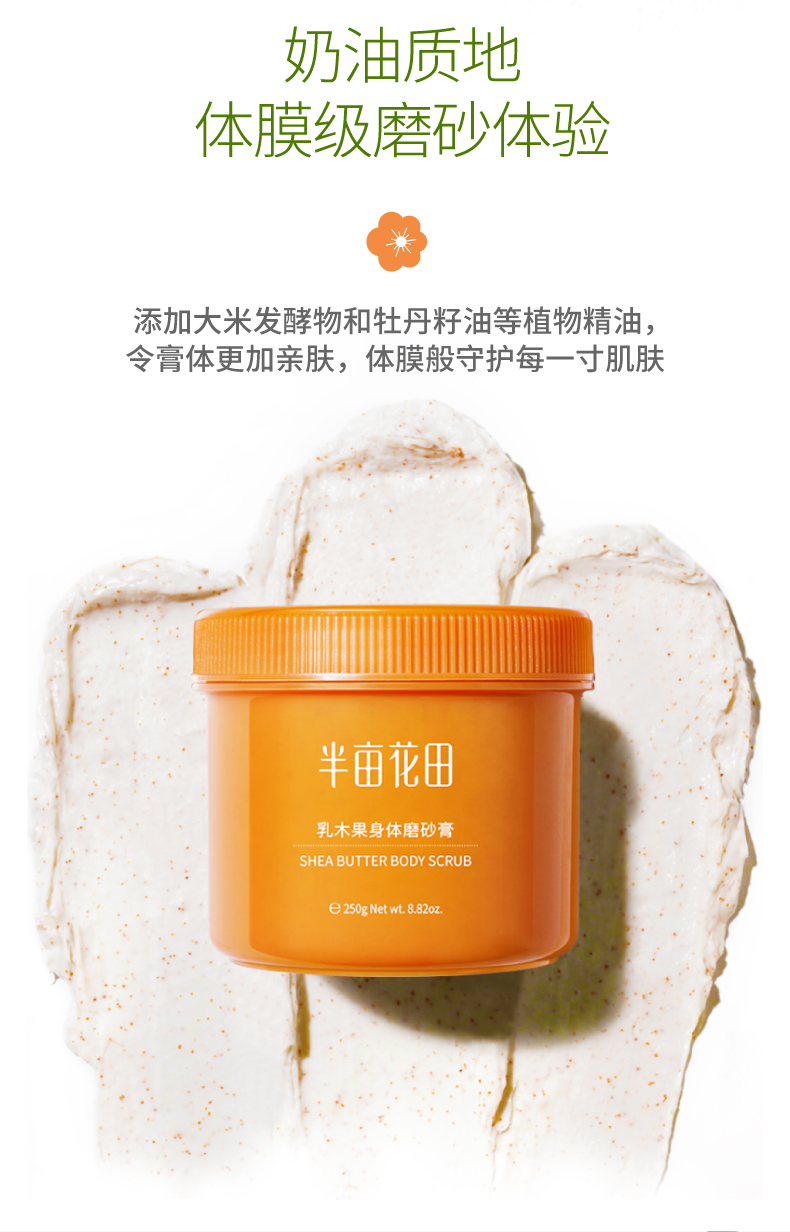 半亩花田乳木果磨砂膏去角质鸡皮身体嫩白全身疙瘩男毛囊小黄罐女JPY带授权招加盟代理