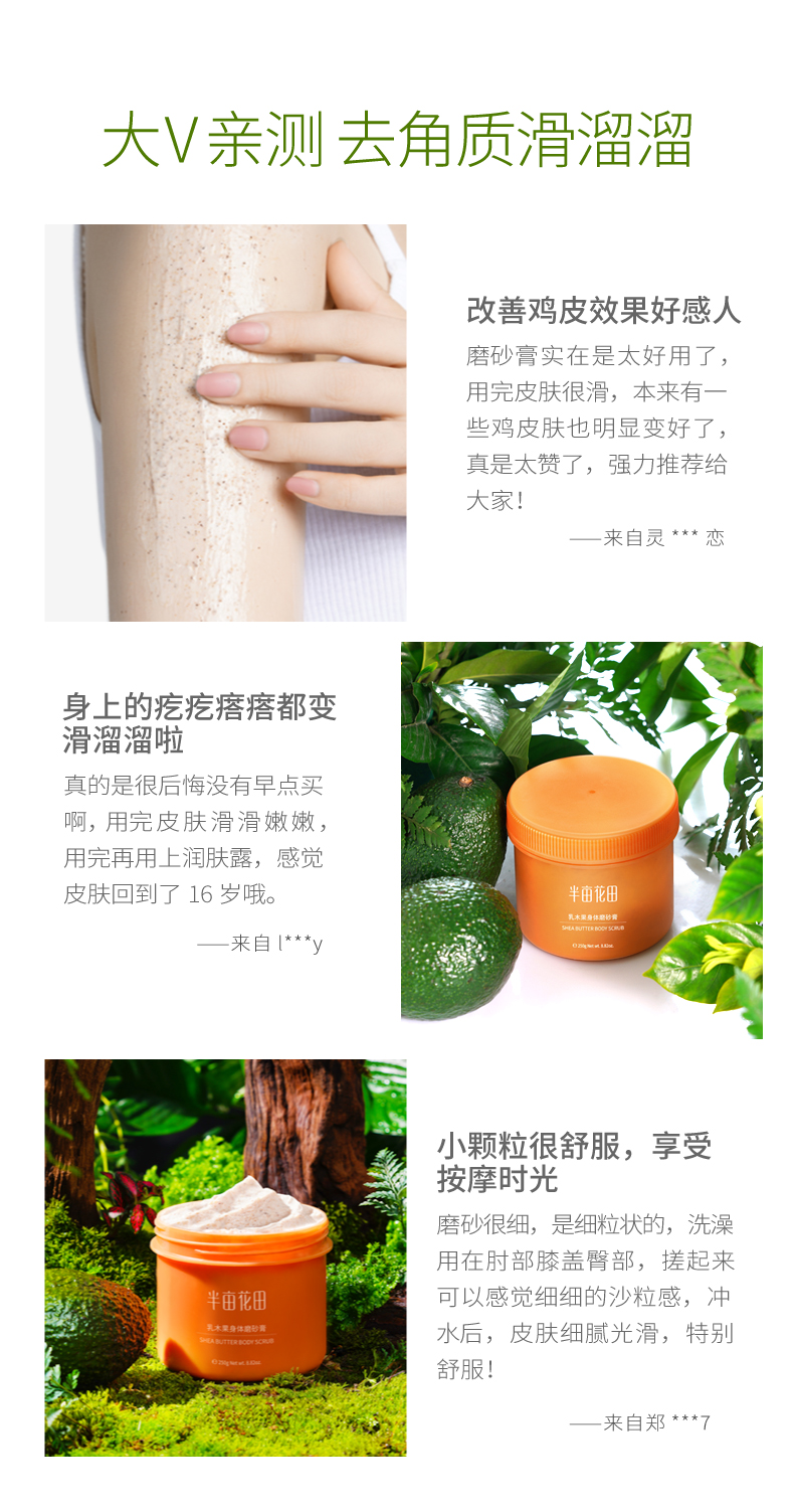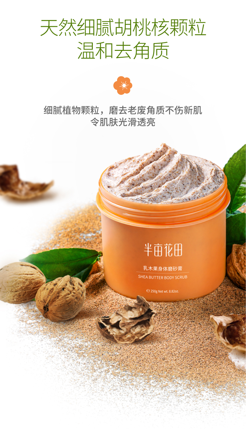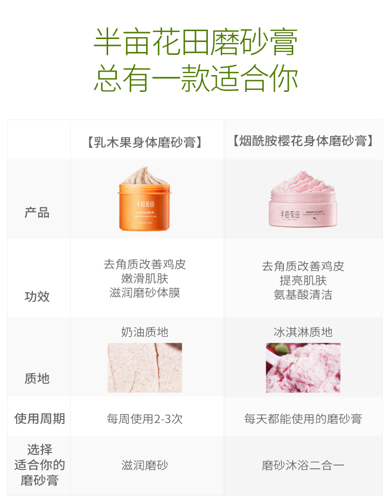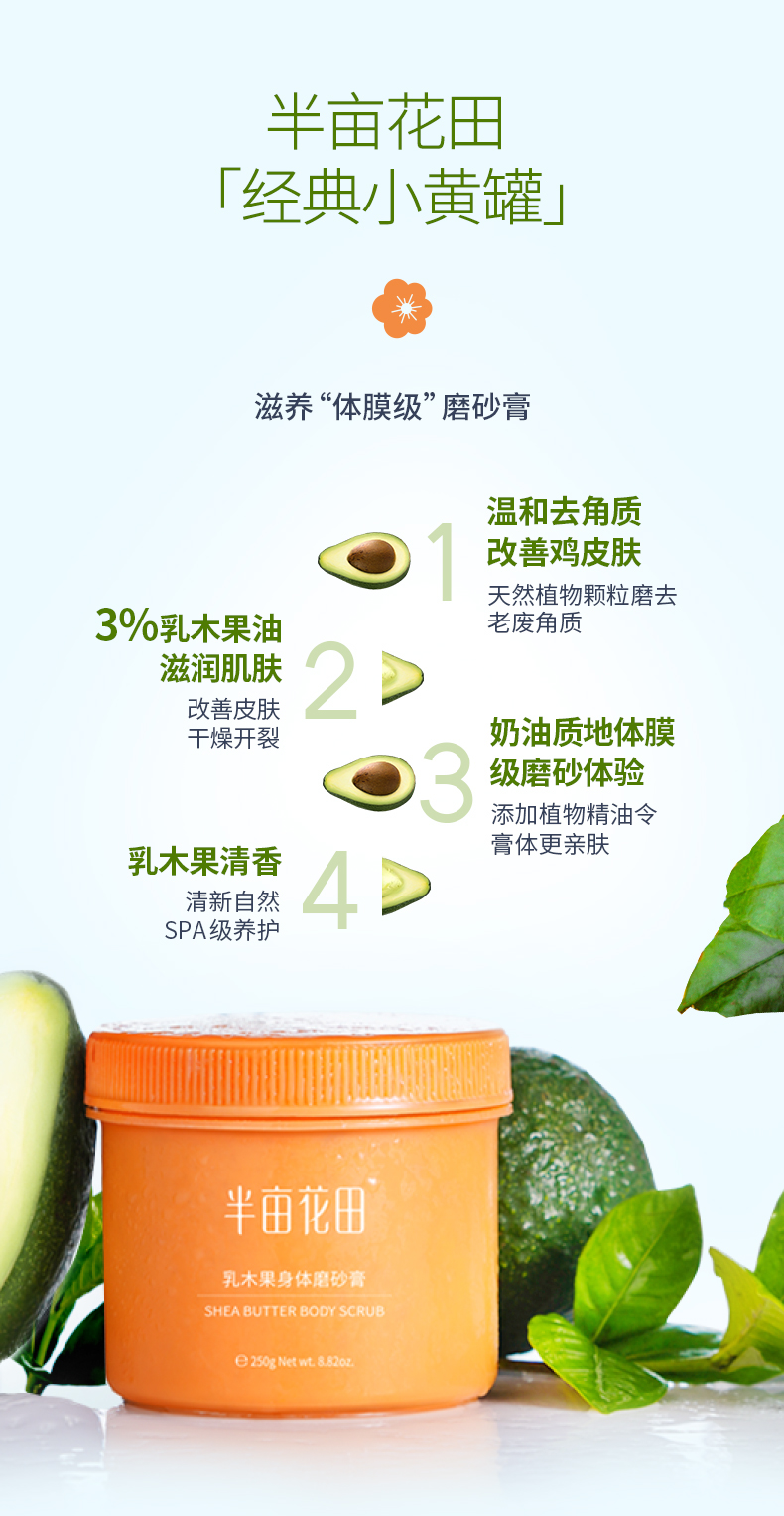 半亩花田乳木果磨砂膏去角质鸡皮身体嫩白全身疙瘩男毛囊小黄罐女JPY带授权招加盟代理