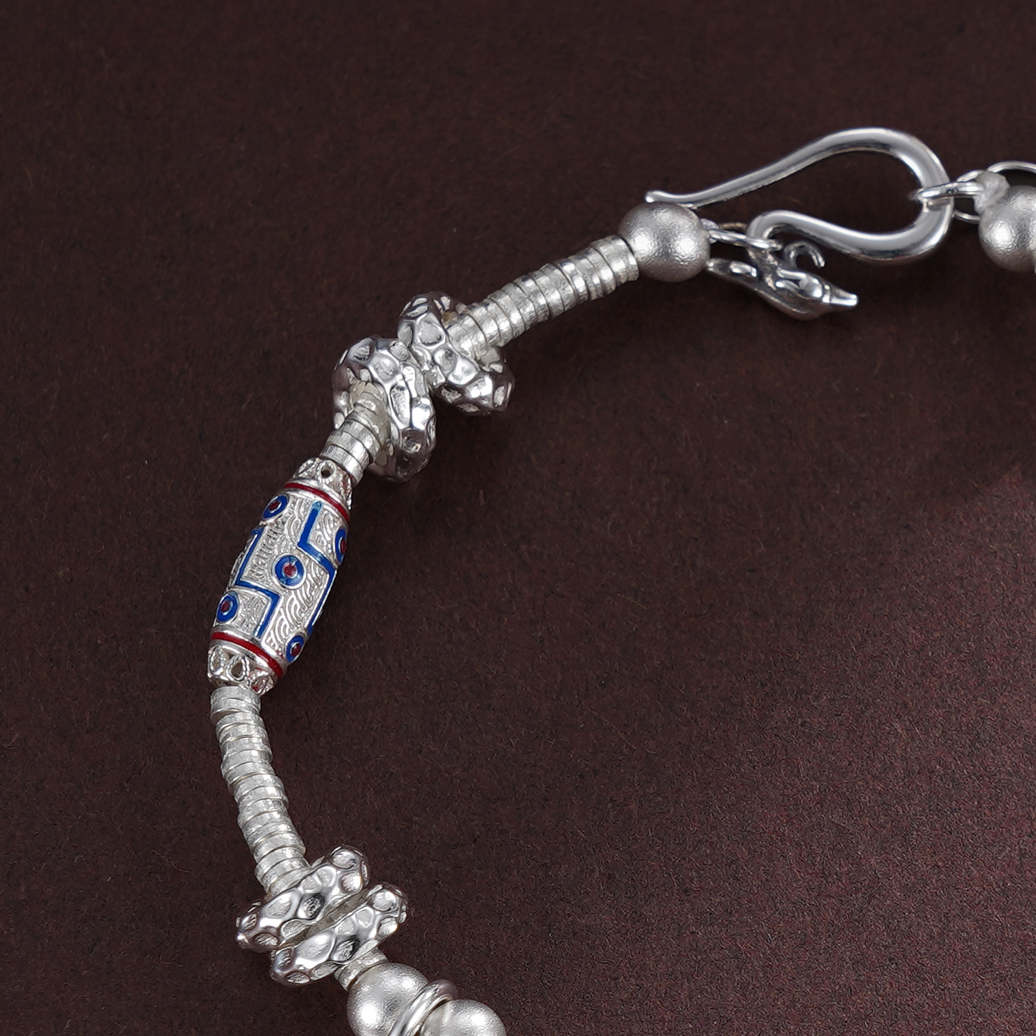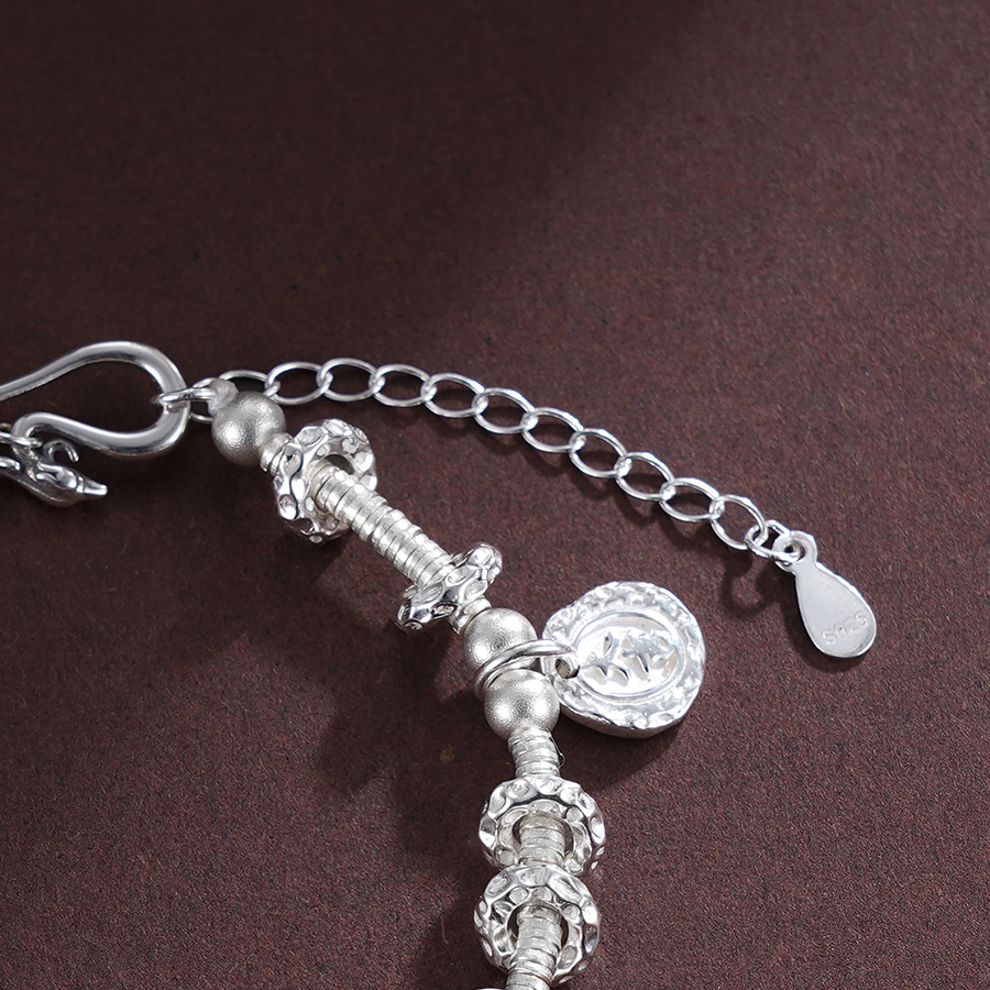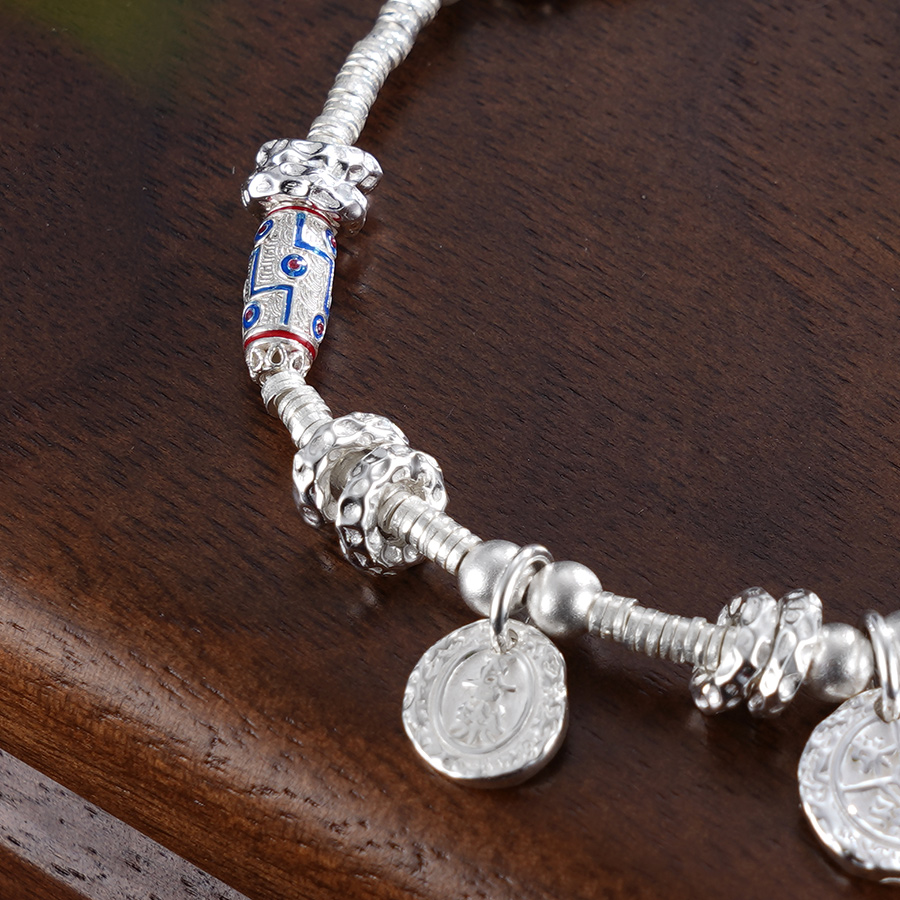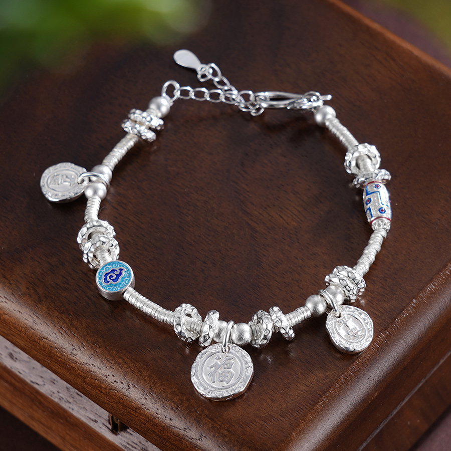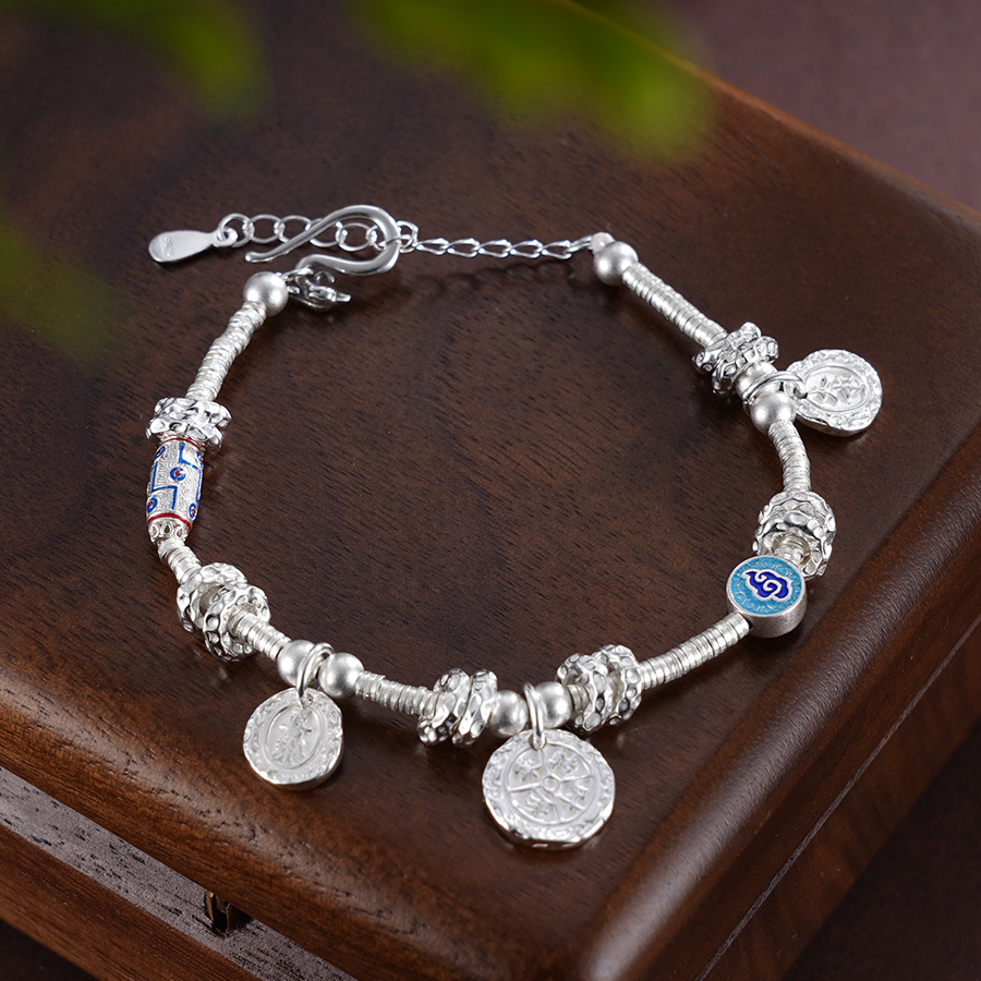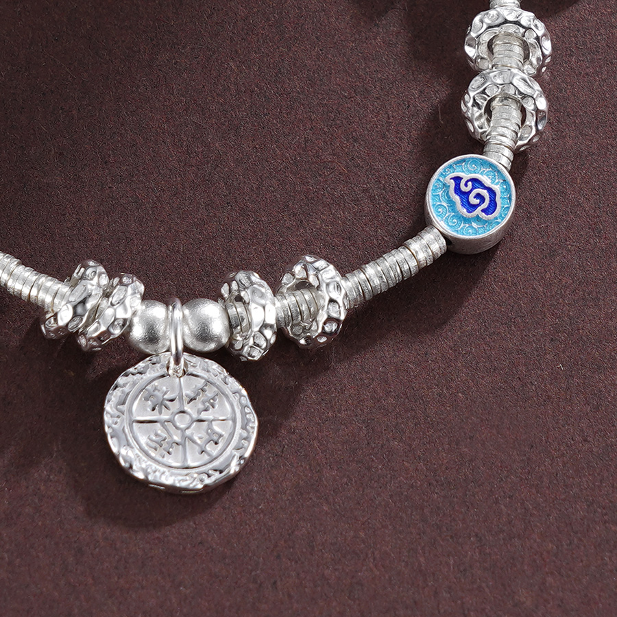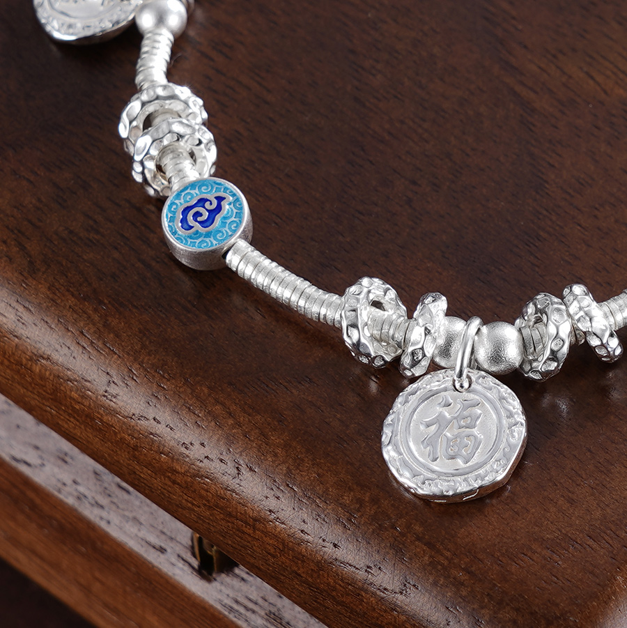 【寓意】:手链以纯银圆珠串联搭配,间以珐琅彩祥云圆牌点缀,展现出非凡的灵气。寓意幸福吉祥,美好环绕。