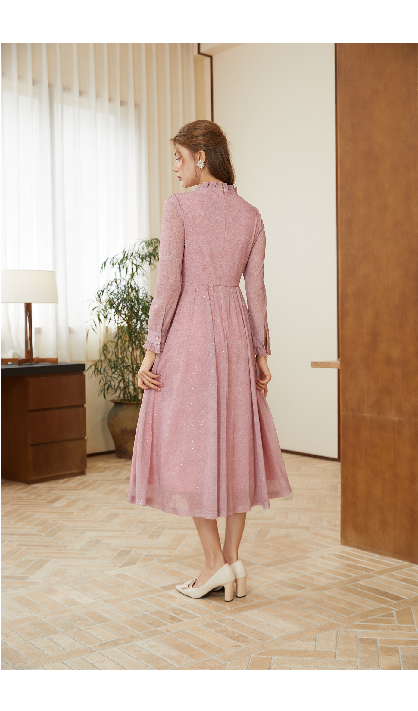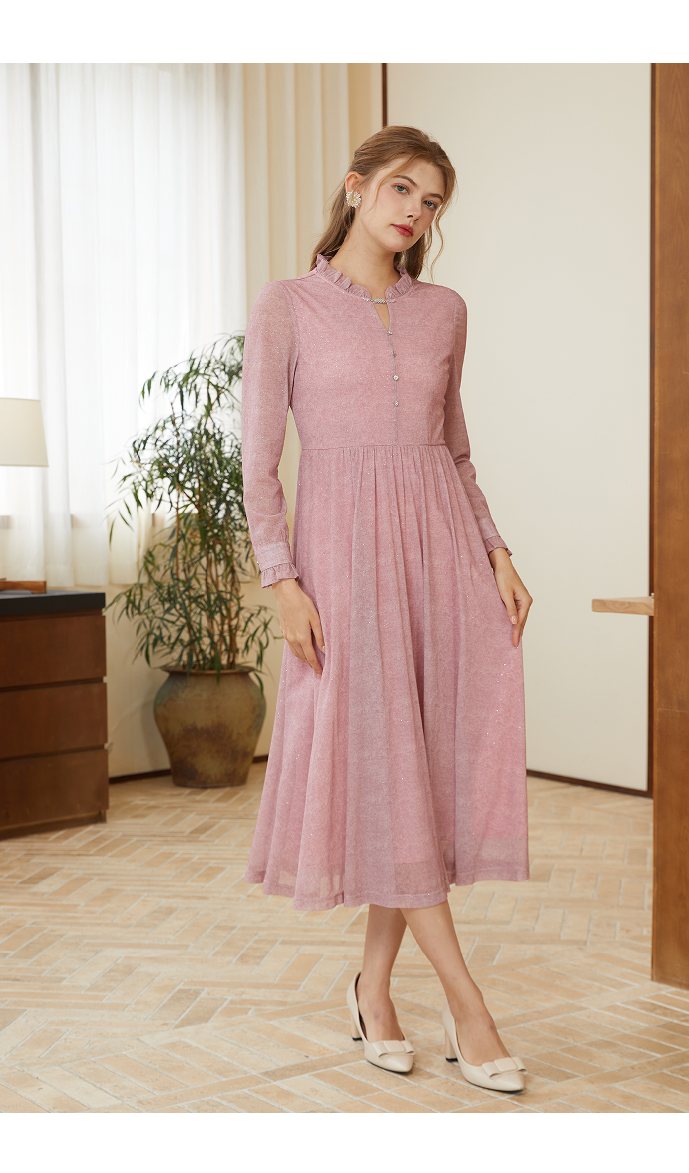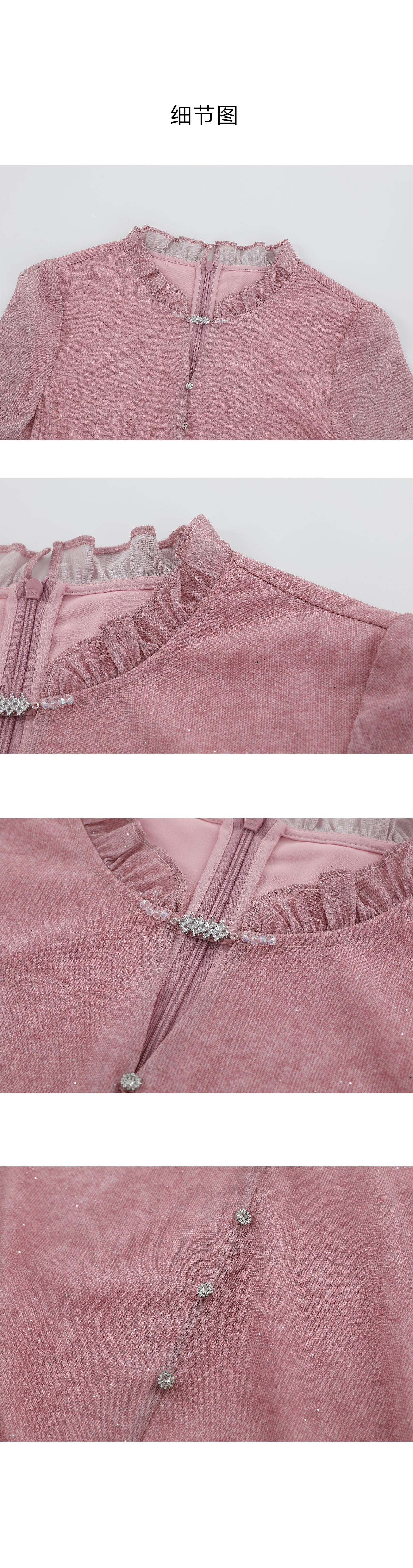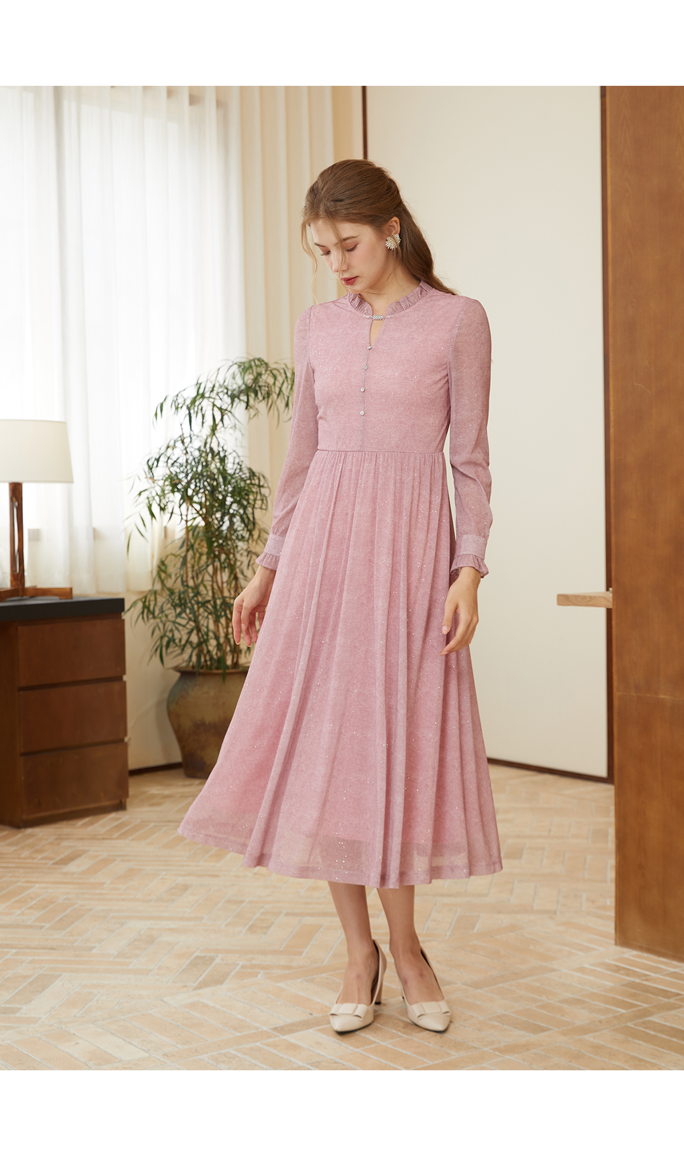 司歌刺绣连衣裙圆领网纱长袖弹力修身A881268