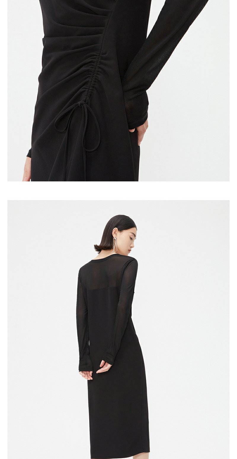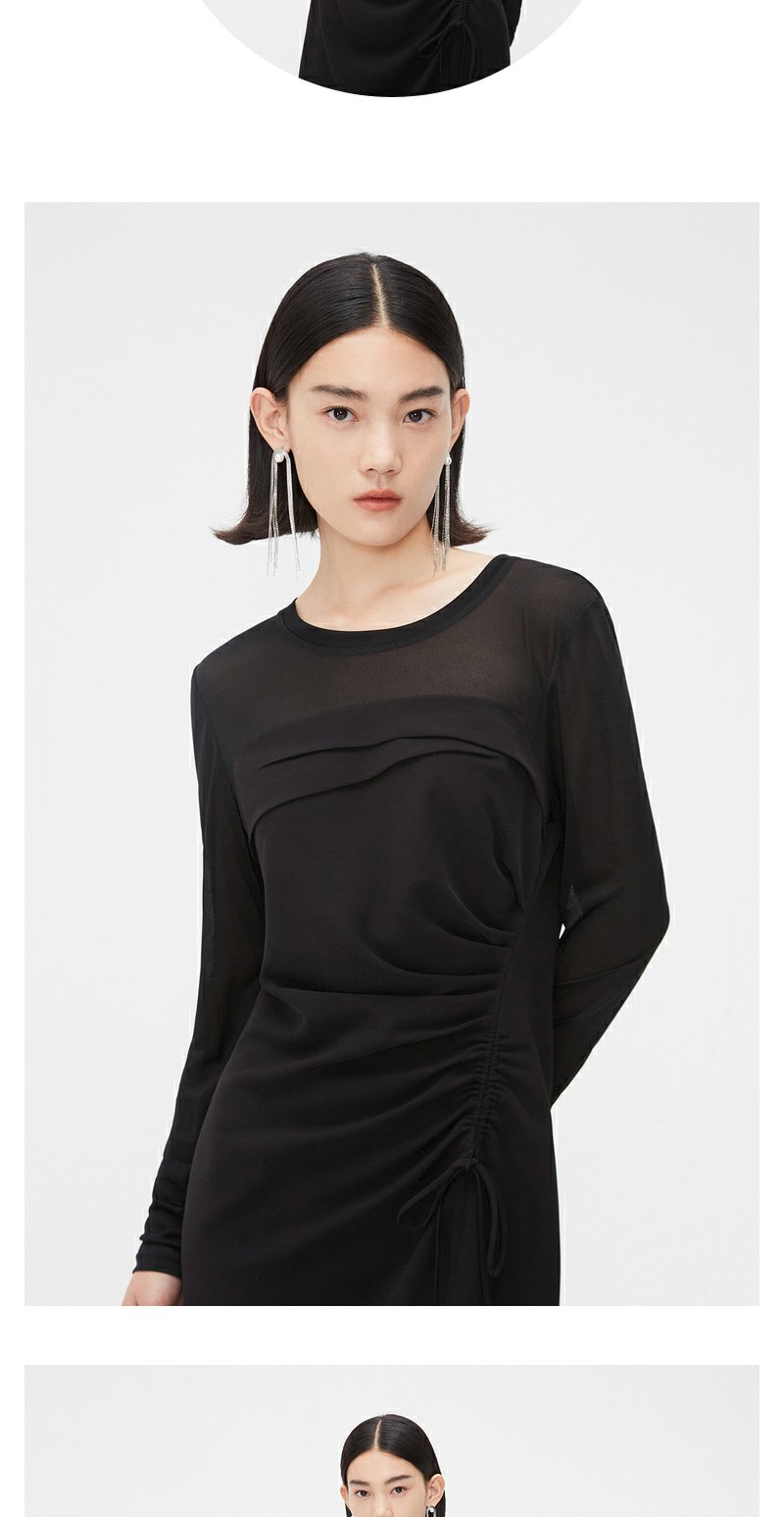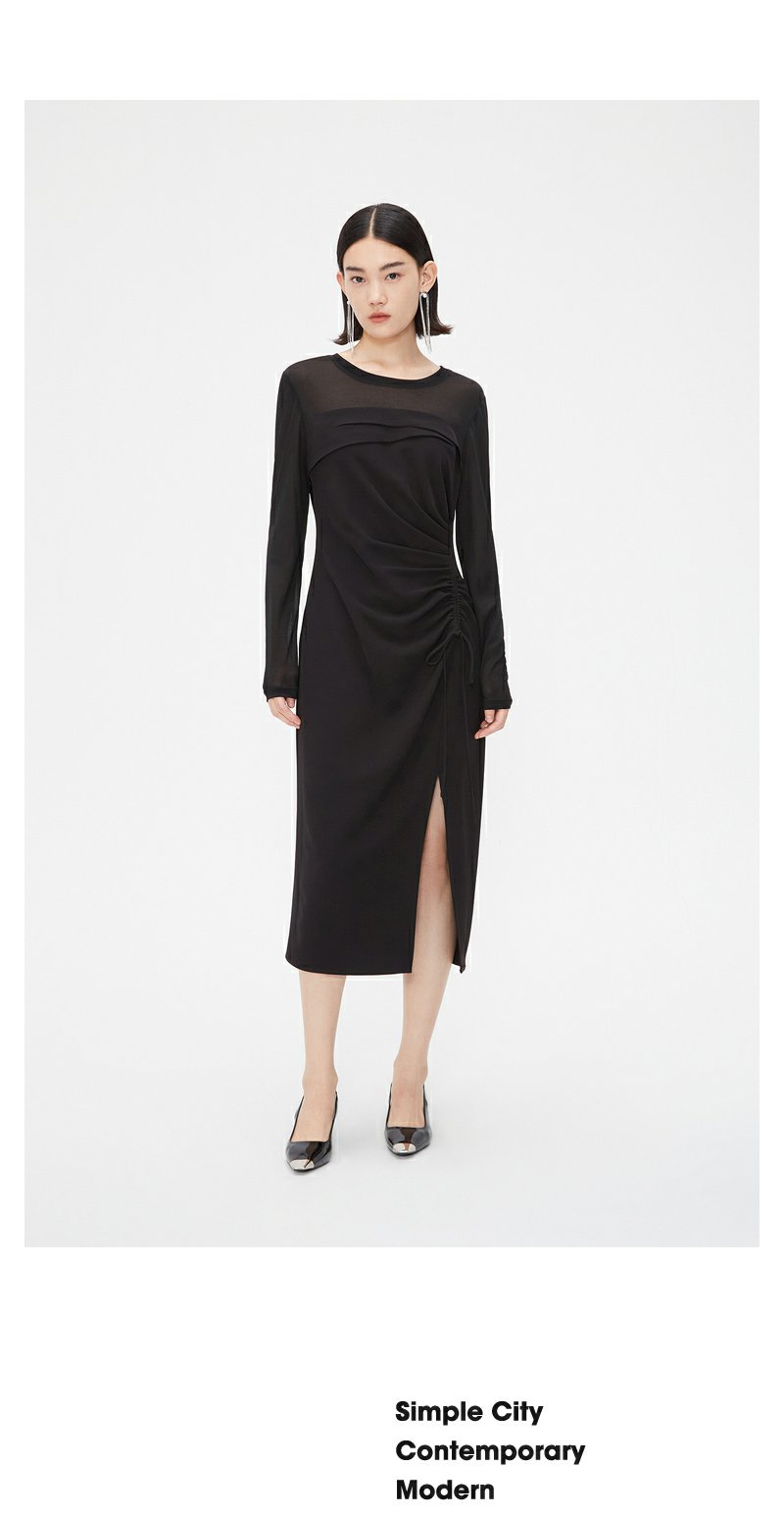 NEELLY纳俪商场同款秋季黑色抽褶显瘦连衣裙女修身开叉长袖中长裙N24074Y04550