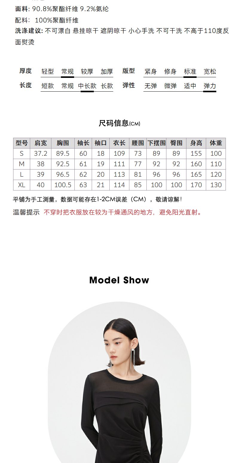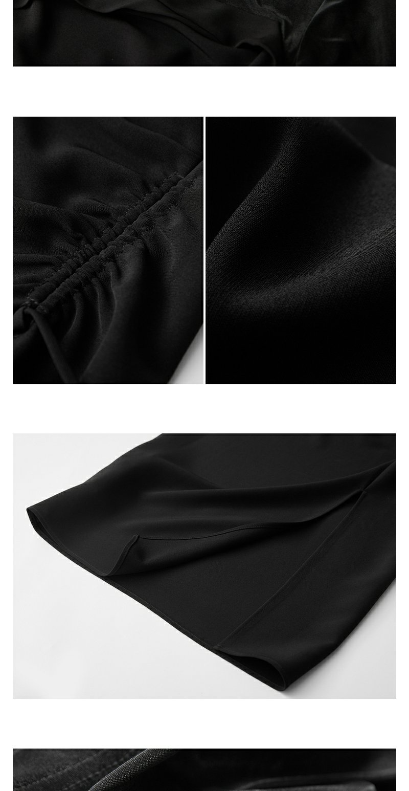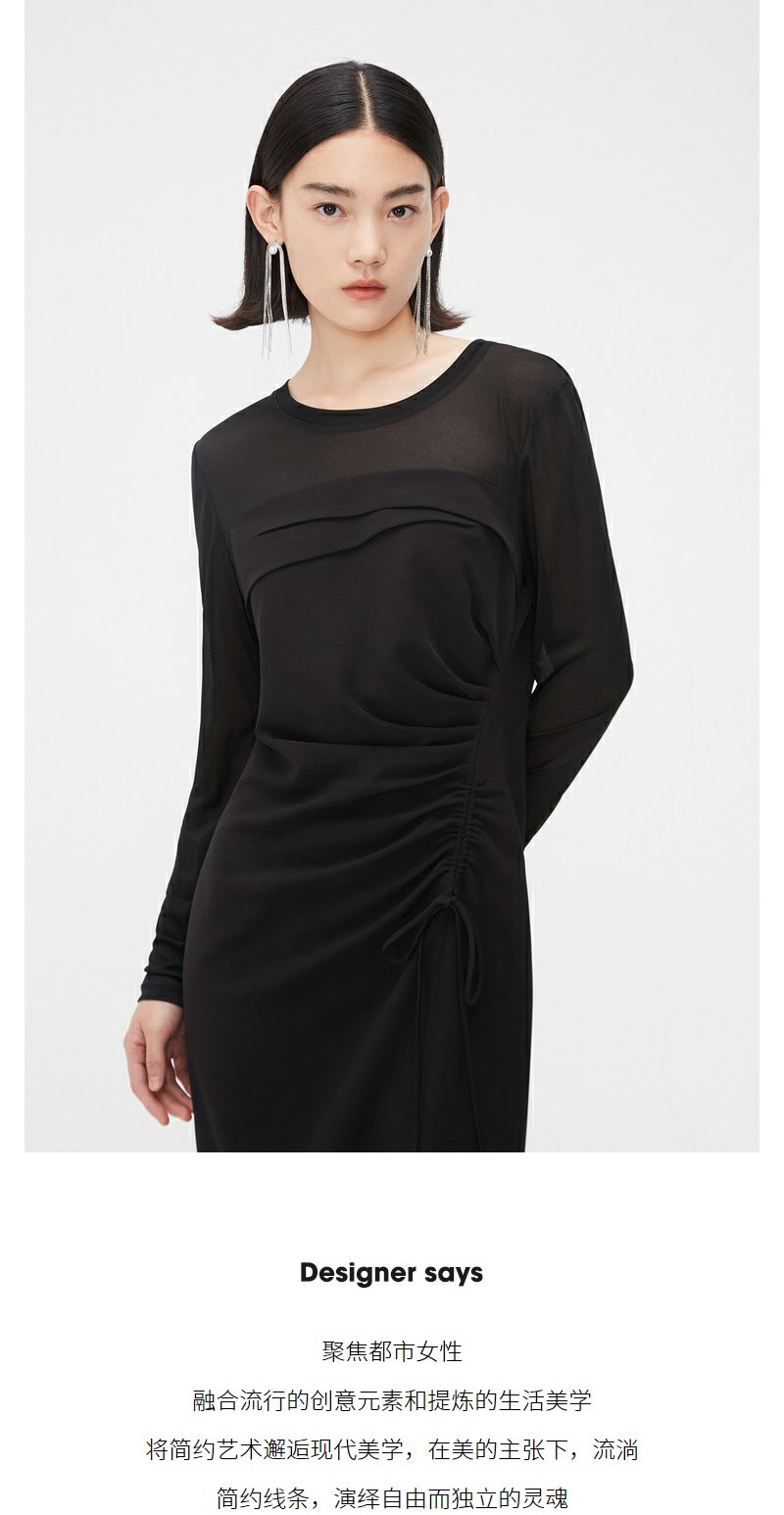 NEELLY纳俪商场同款秋季黑色抽褶显瘦连衣裙女修身开叉长袖中长裙N24074Y04550