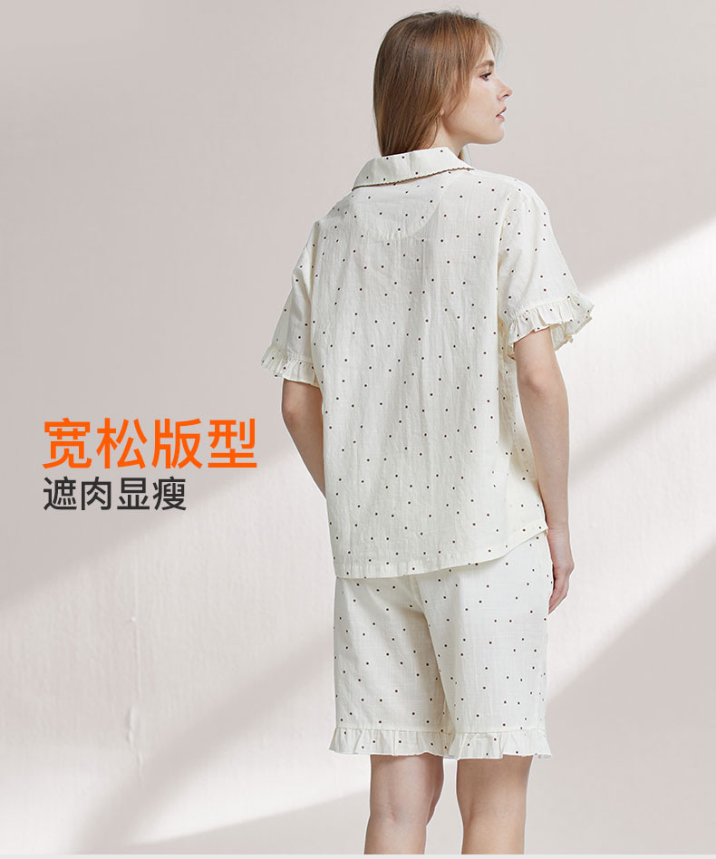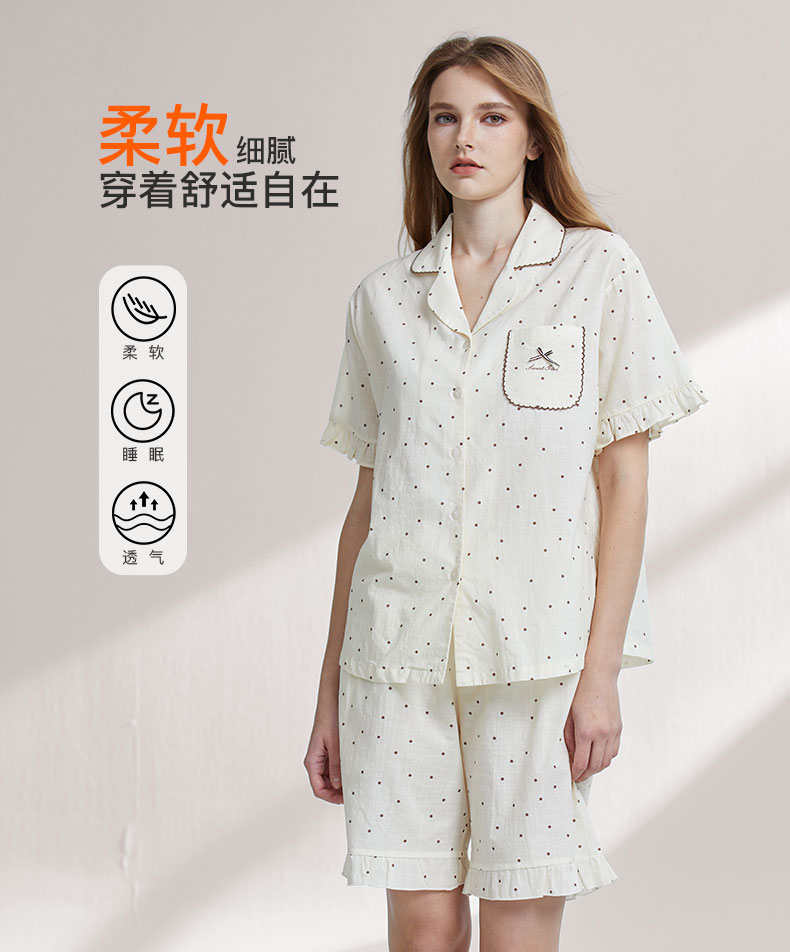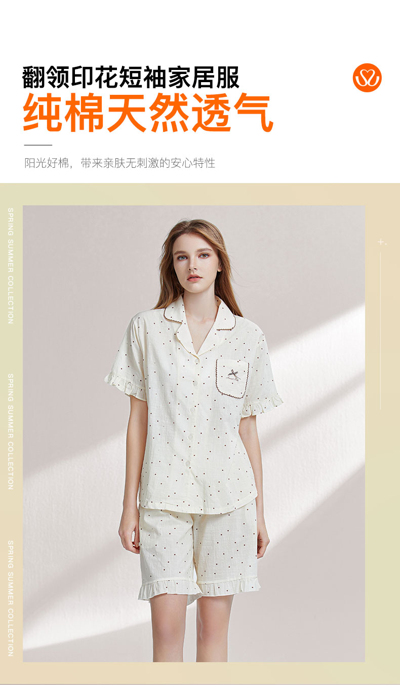 【7.5折限时特惠】【秀黛】女翻领印花短袖套装元气棉透气亲肤小波点印花复古刺绣木耳边浪漫甜美女夏季睡衣家居服W2551055T【门店同款】