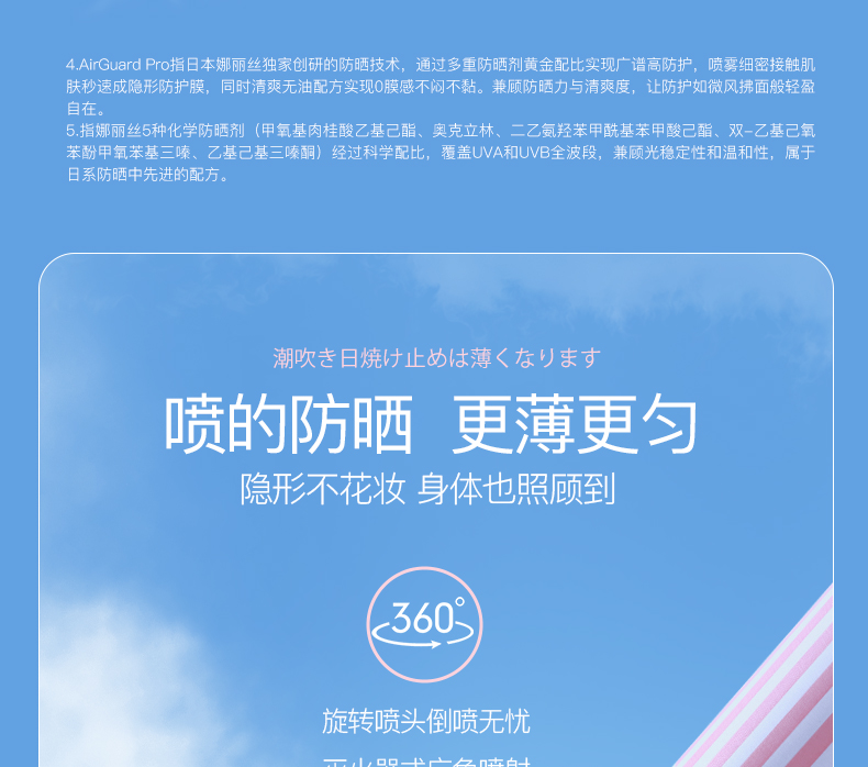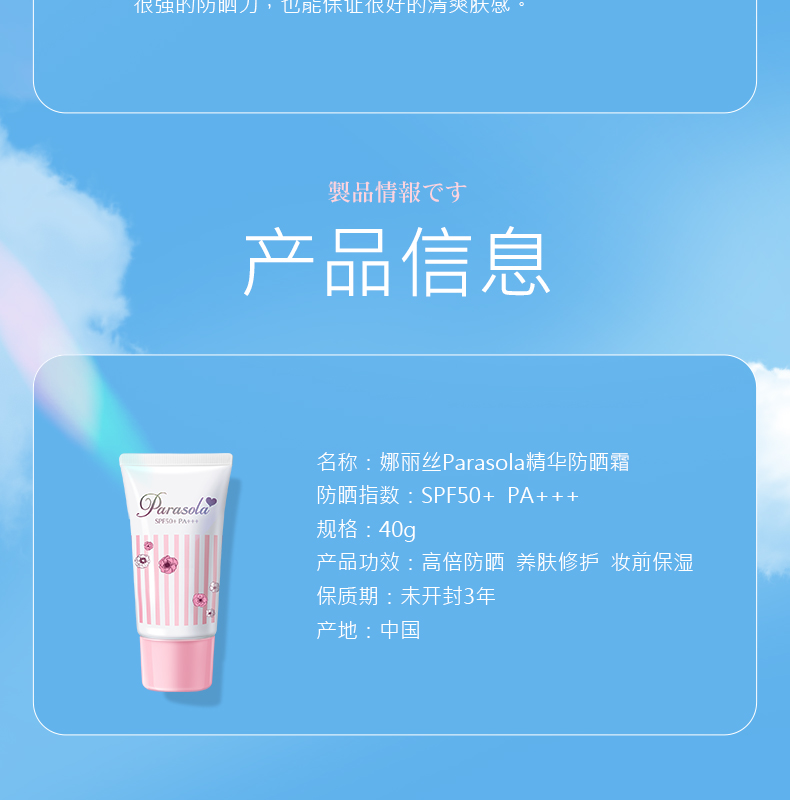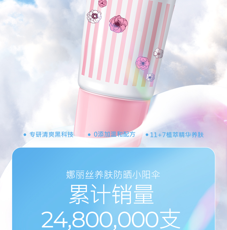 娜丽丝小阳伞防晒喷雾/娜丽丝Parasola茗妃语清爽防晒乳,SPF50,超12小时长时间保护;含有多种美容液精华,深层保湿,肌肤持久水润