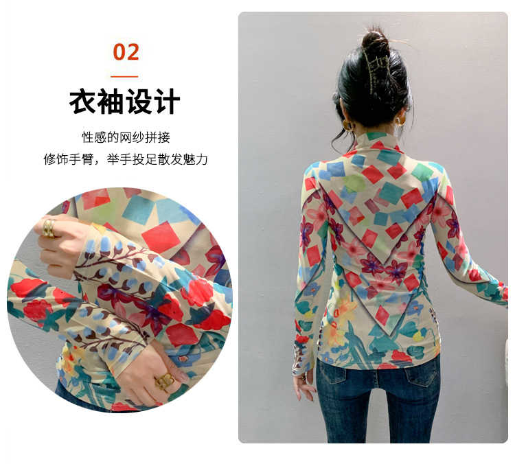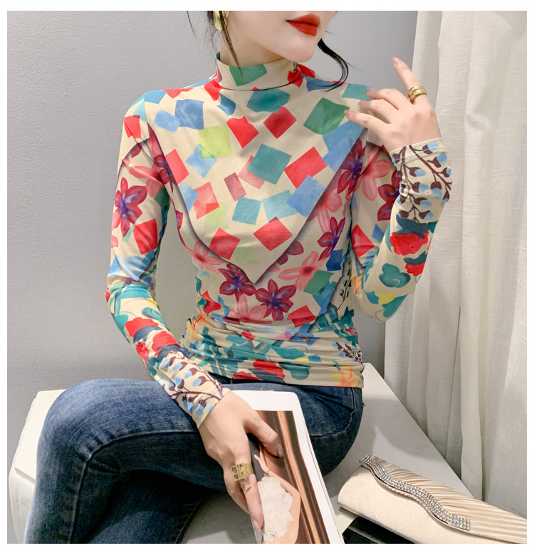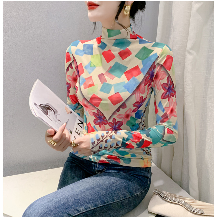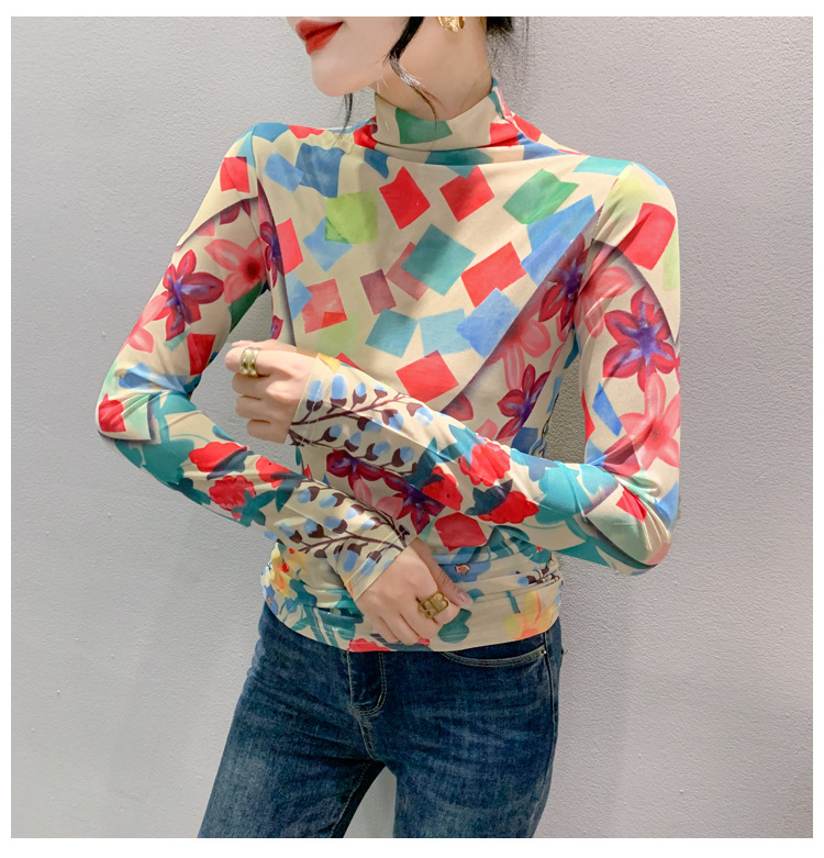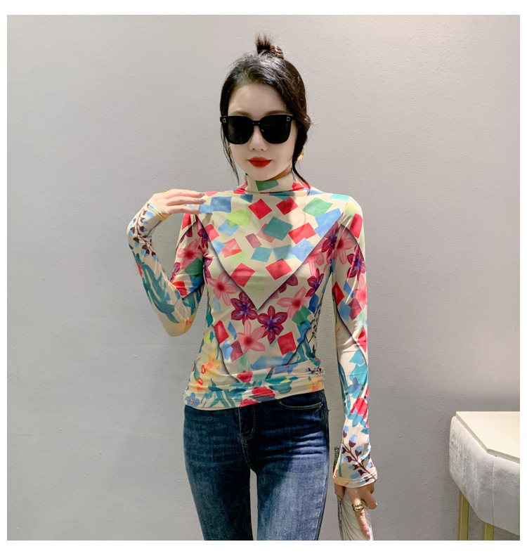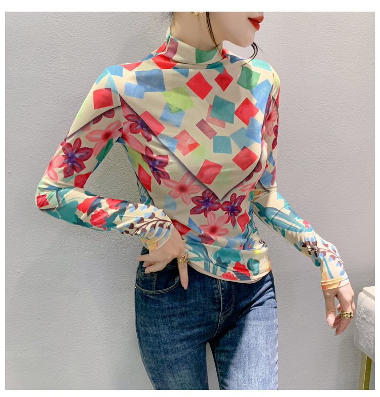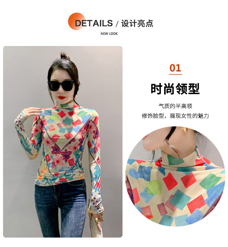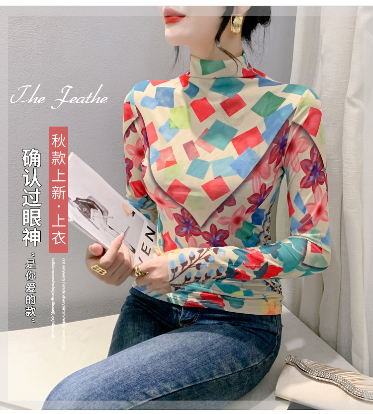 时尚洋气,秋冬长袖高领网纱t恤女定位花打底小衫上衣KQL-A55F0866