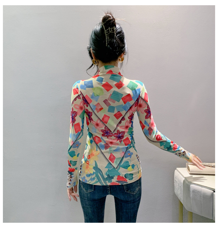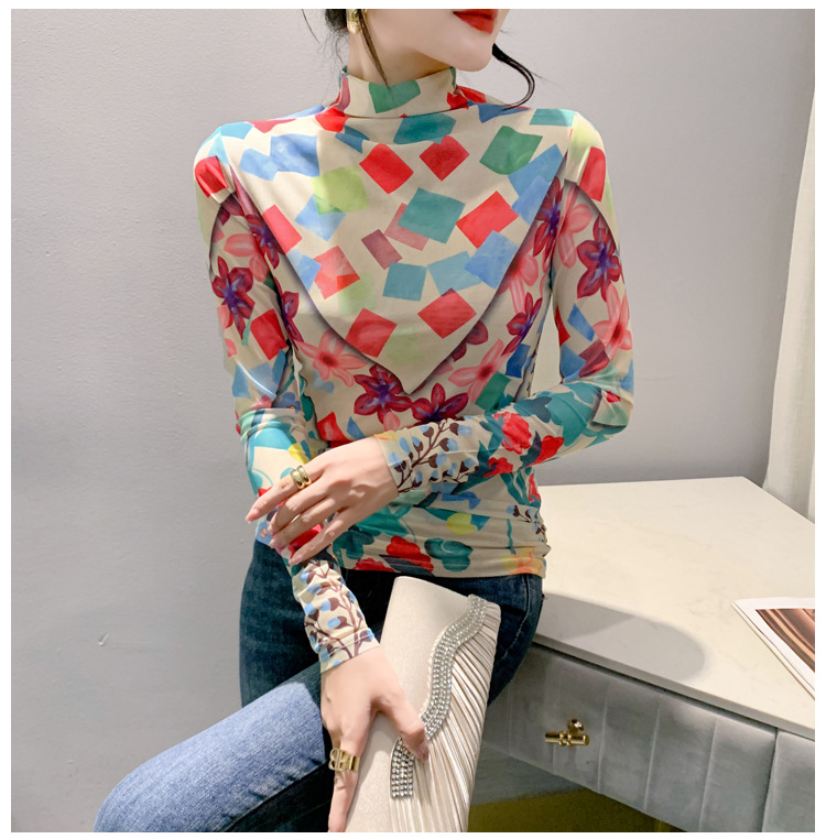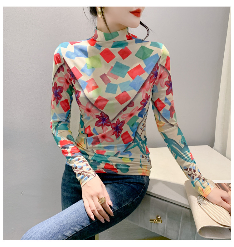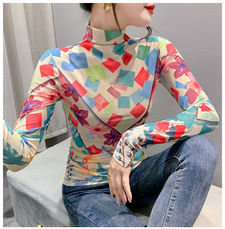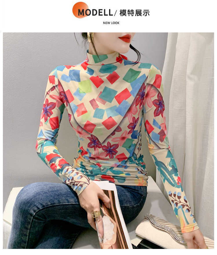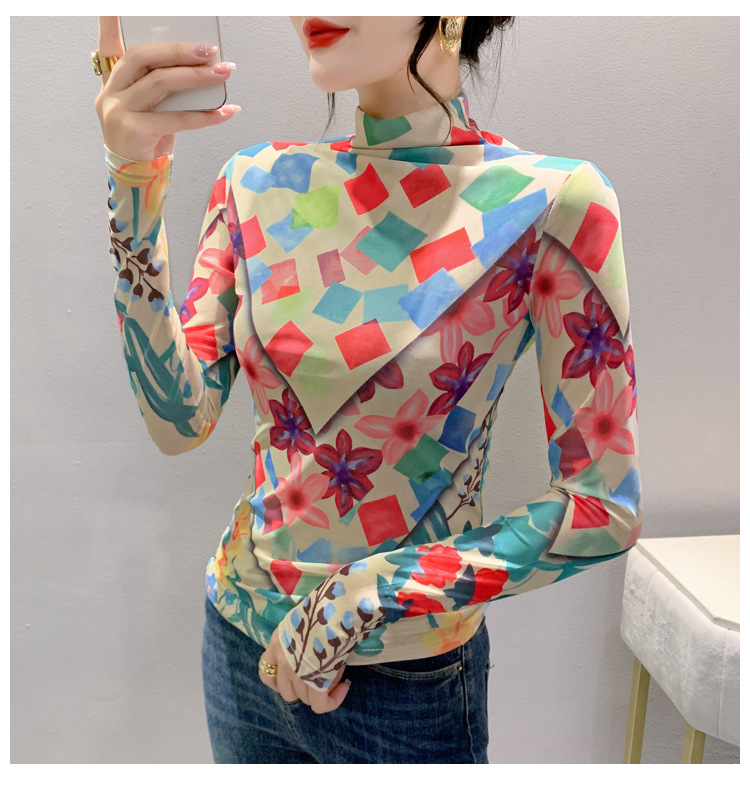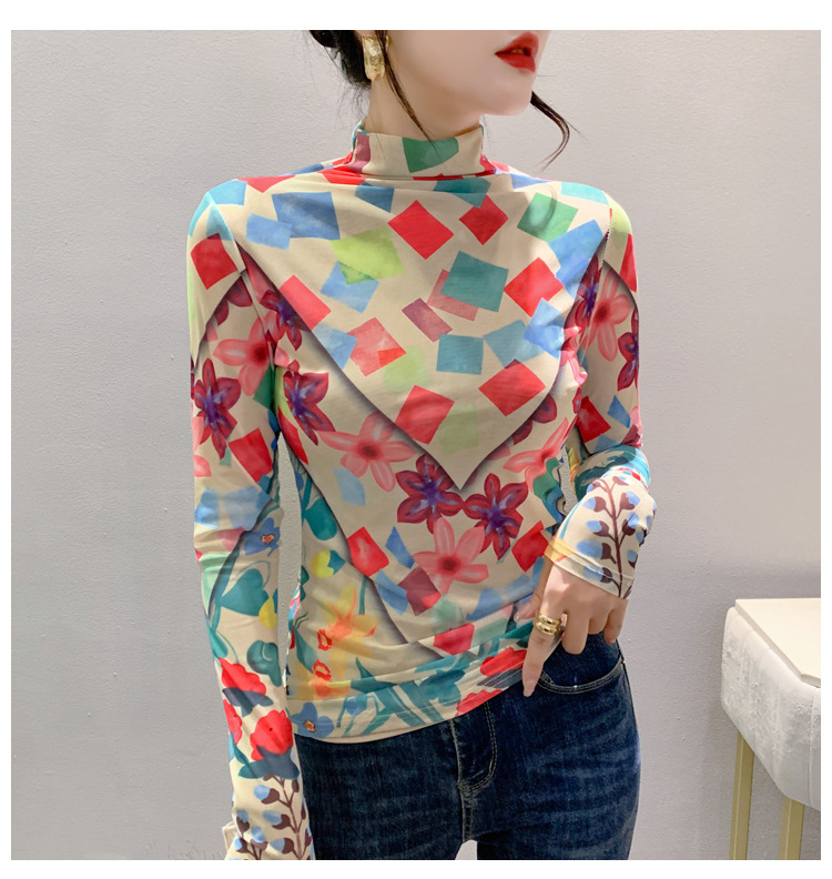 时尚洋气,秋冬长袖高领网纱t恤女定位花打底小衫上衣KQL-A55F0866