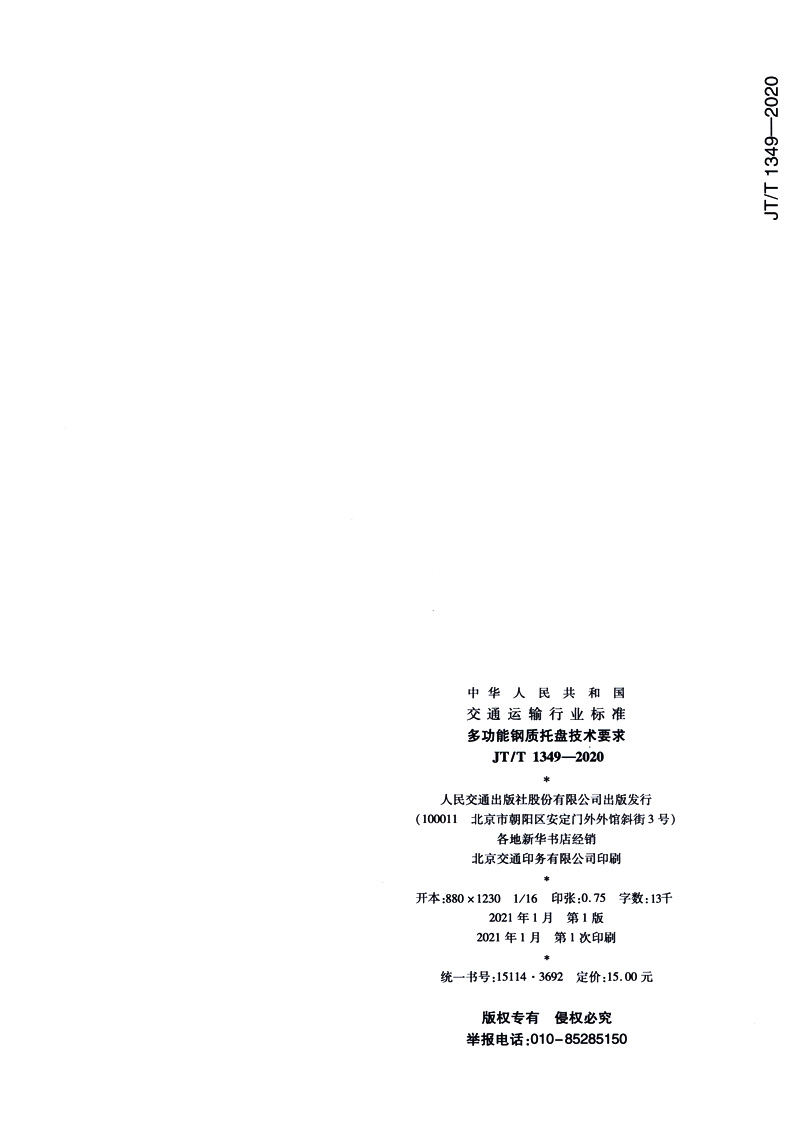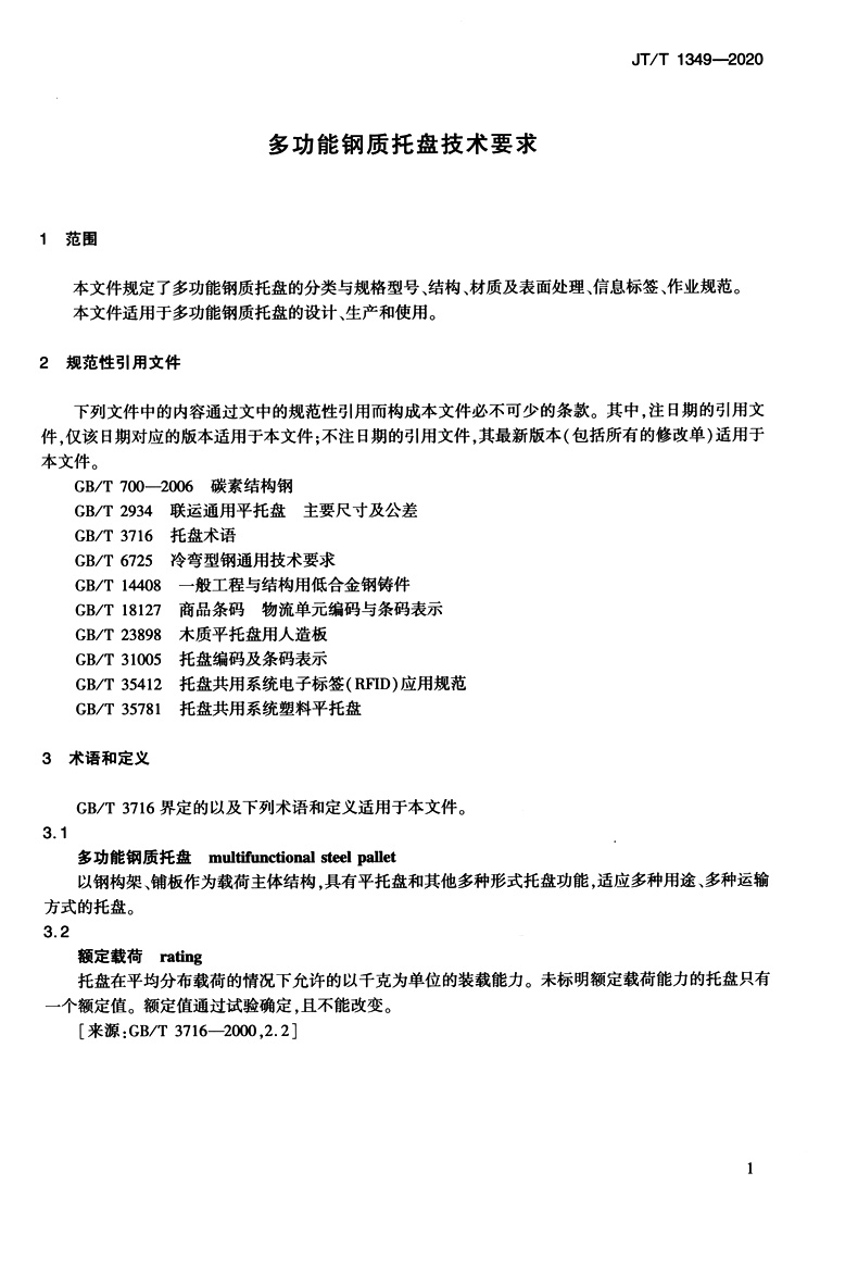 书名:多功能钢质托盘技术要求(JT/T 1349—2020)